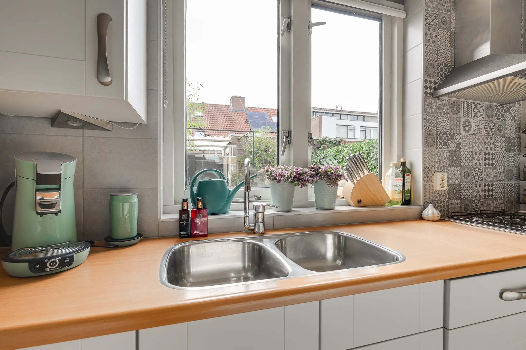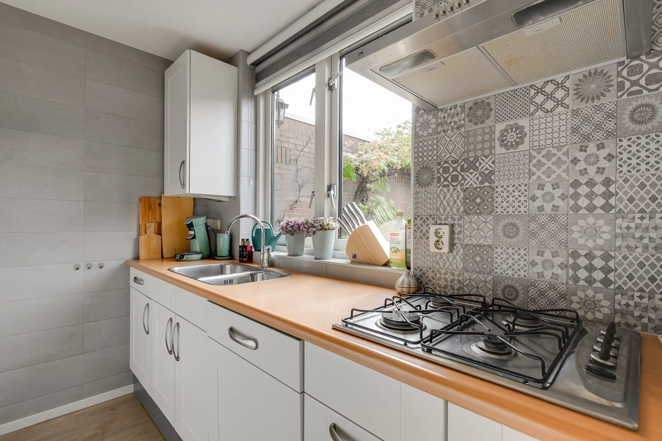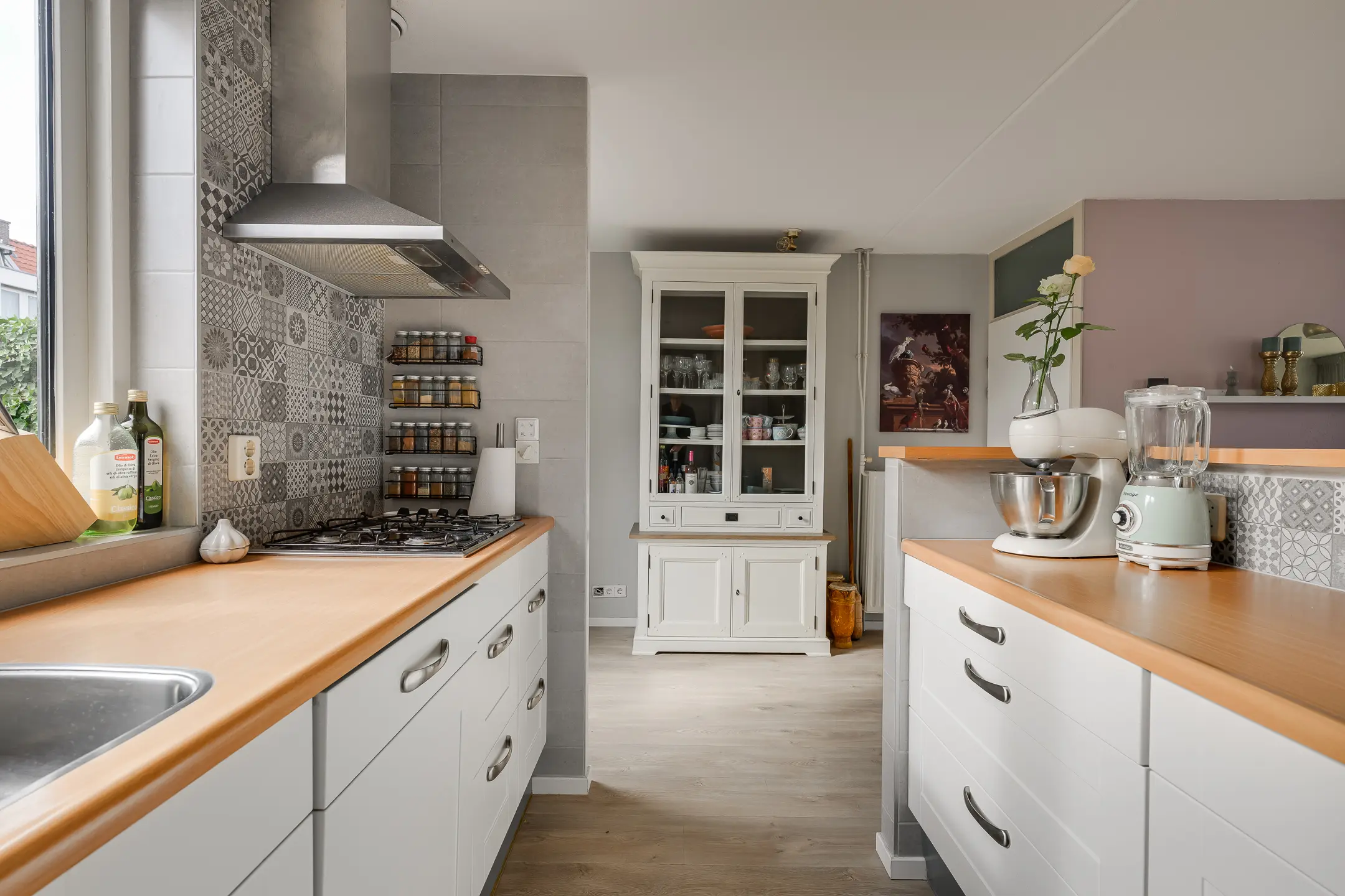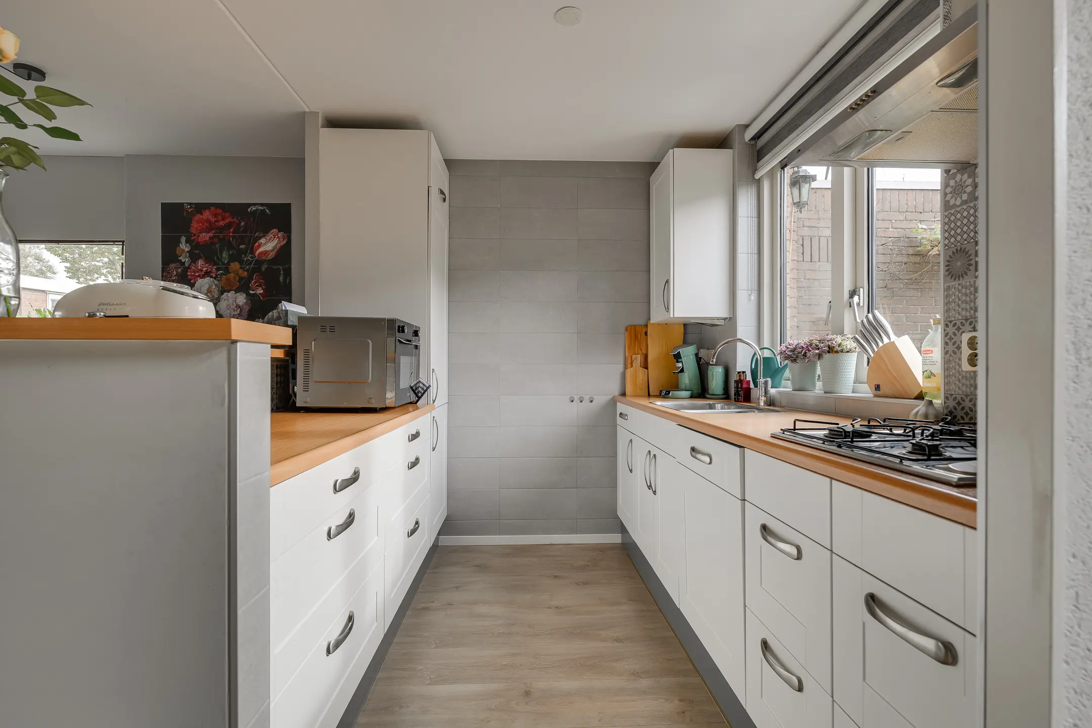 Aan de achterzijde ligt de open keuken, slim ingedeeld met een werkblad aan twee zijden en voorzien van moderne inbouwapparatuur: een vaatwasser (2021), koelkast (2023), vriezer en een 5-pits gasfornuis met afzuigkap. De keukenkastjes zijn in 2018 vernieuwd (gespoten en betegeld), wat zorgt voor een frisse uitstraling.