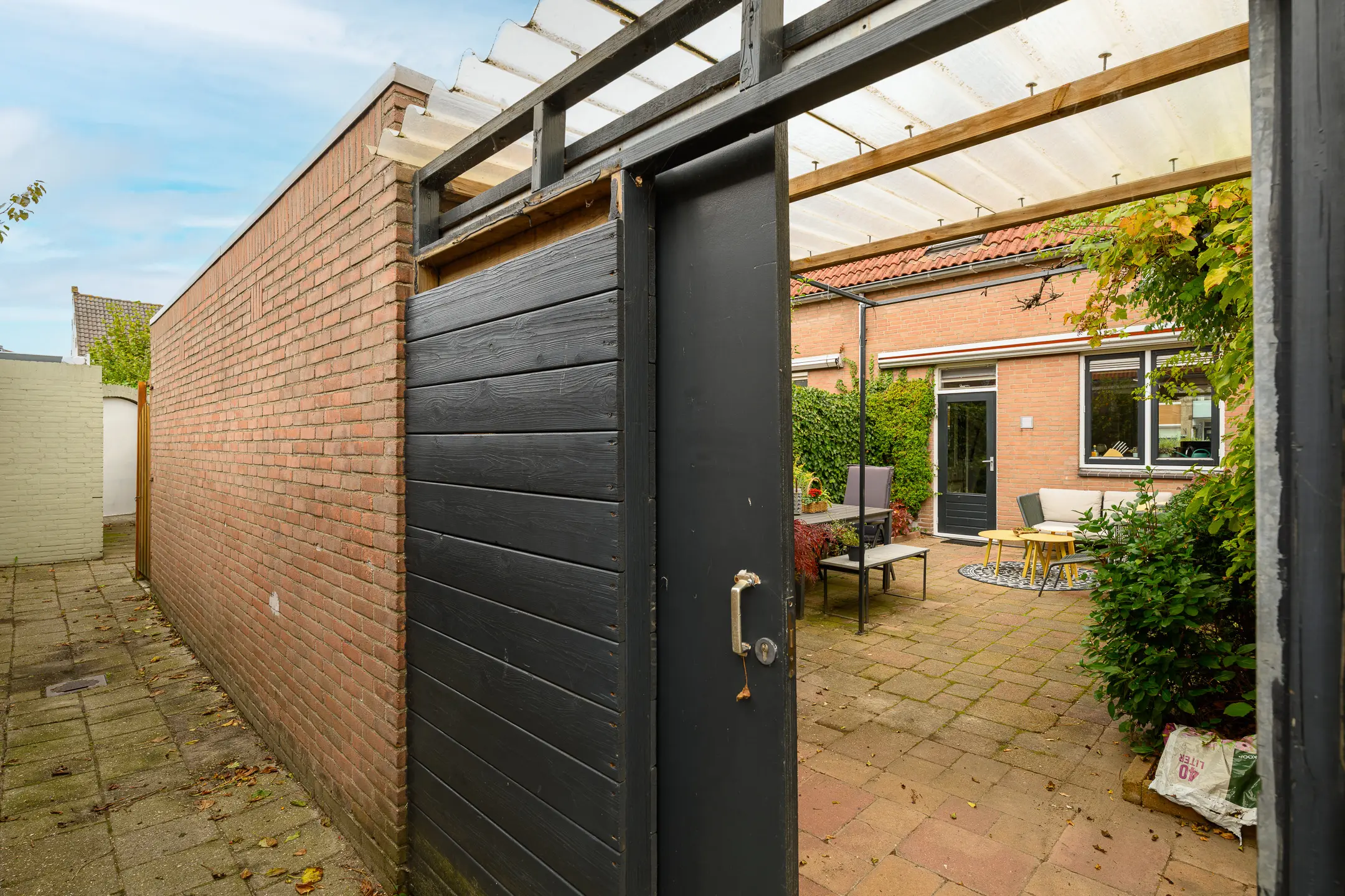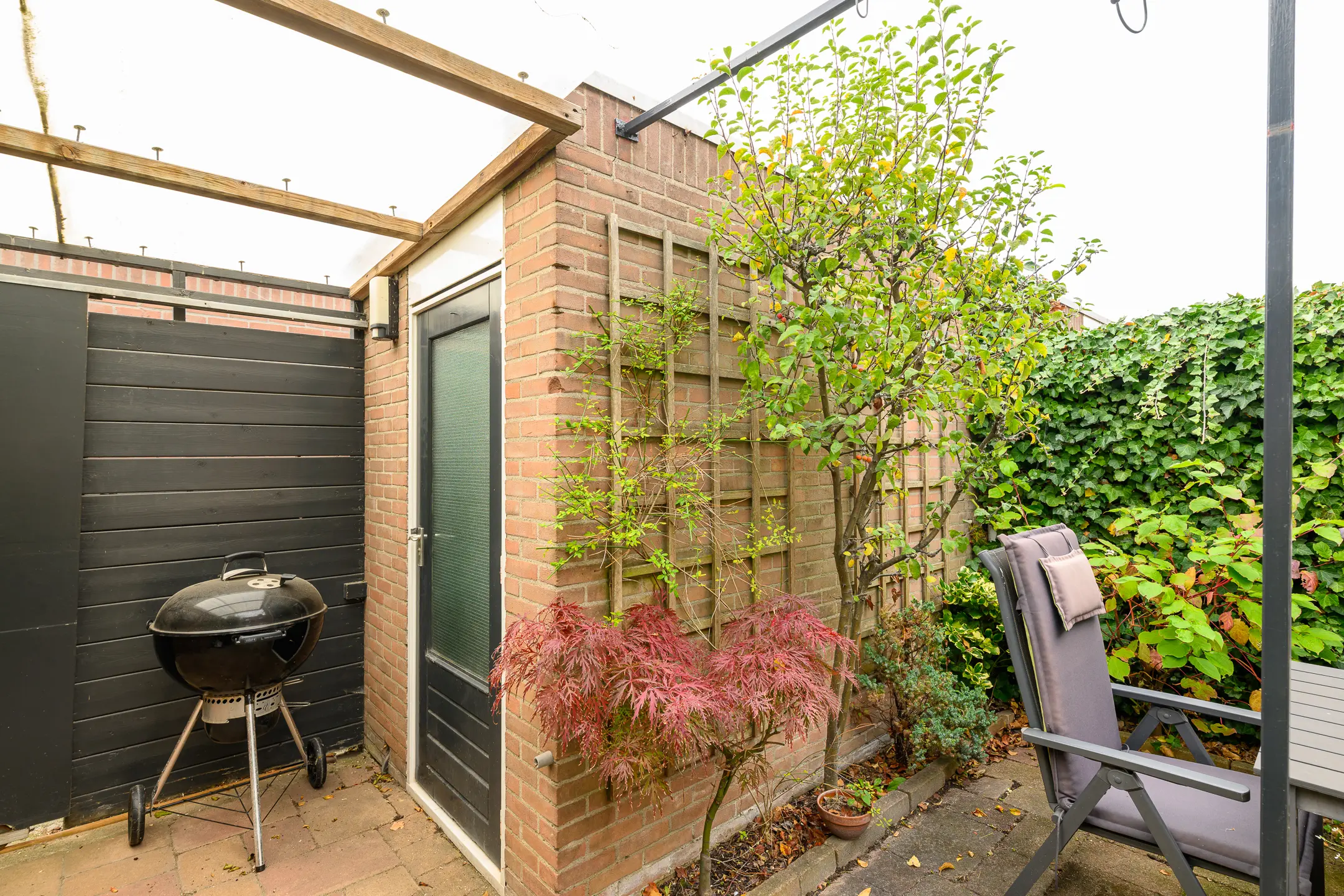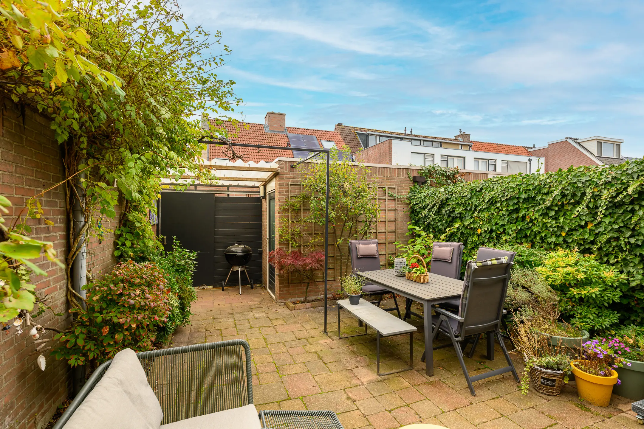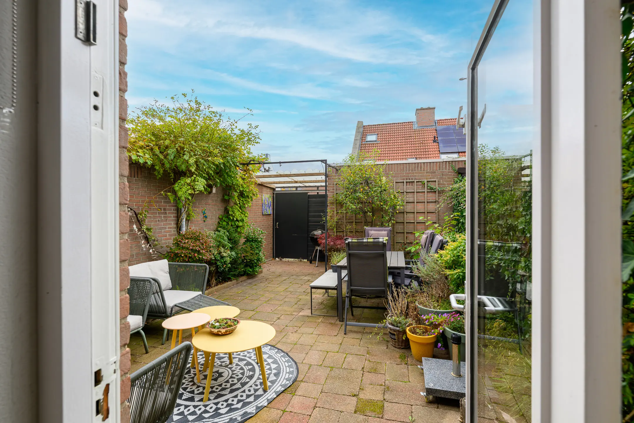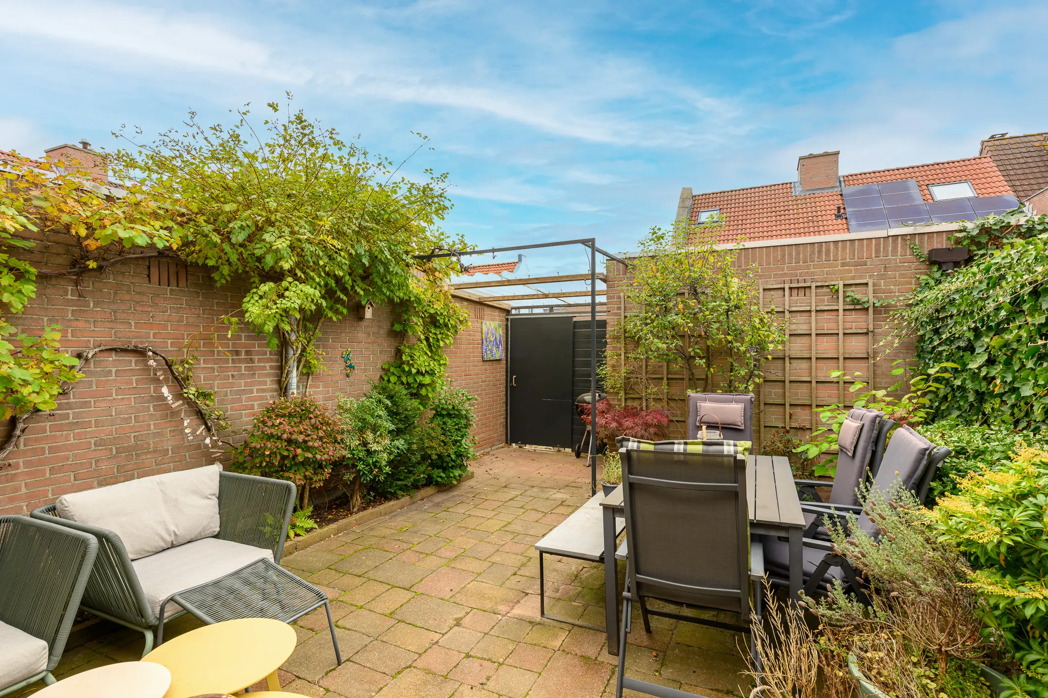 Vanuit de keuken loopt u via een loopdeur zo de achtertuin in. Door de ligging op het zuidwesten kunt u hier al vroeg in de middag genieten van de zon. De grotendeels bestraatte tuin is omringd door groen (vaste planten), onderhoudsvriendelijk én biedt volop mogelijkheden: een loungehoek, bloemenperk of speelruimte voor de kinderen. Dankzij de hoekligging voelt de tuin extra ruim en privé aan.