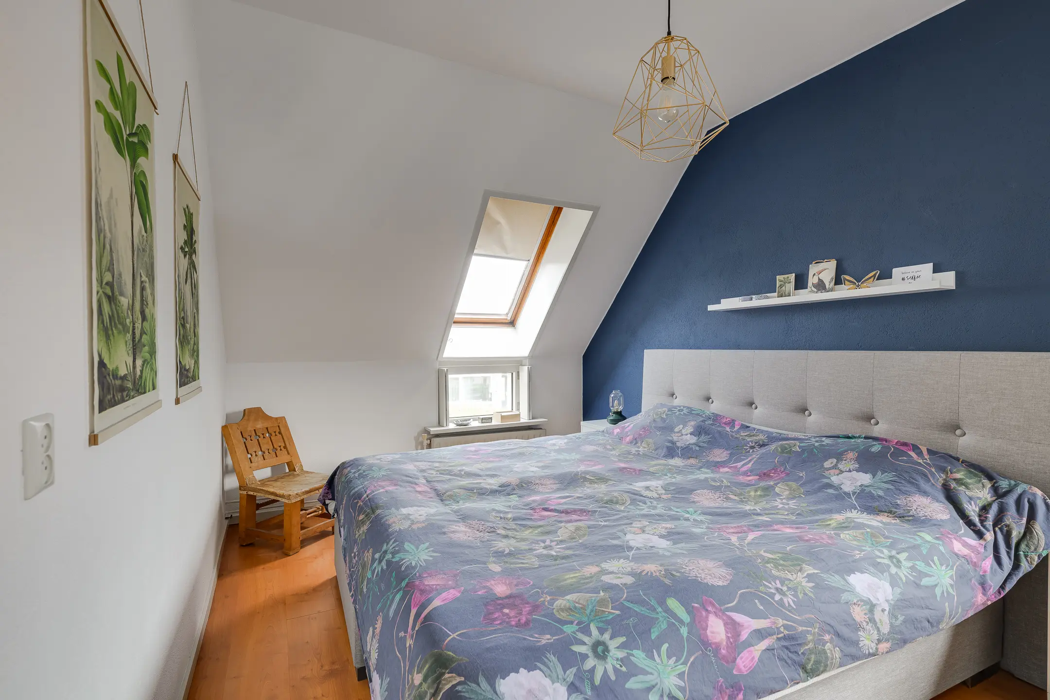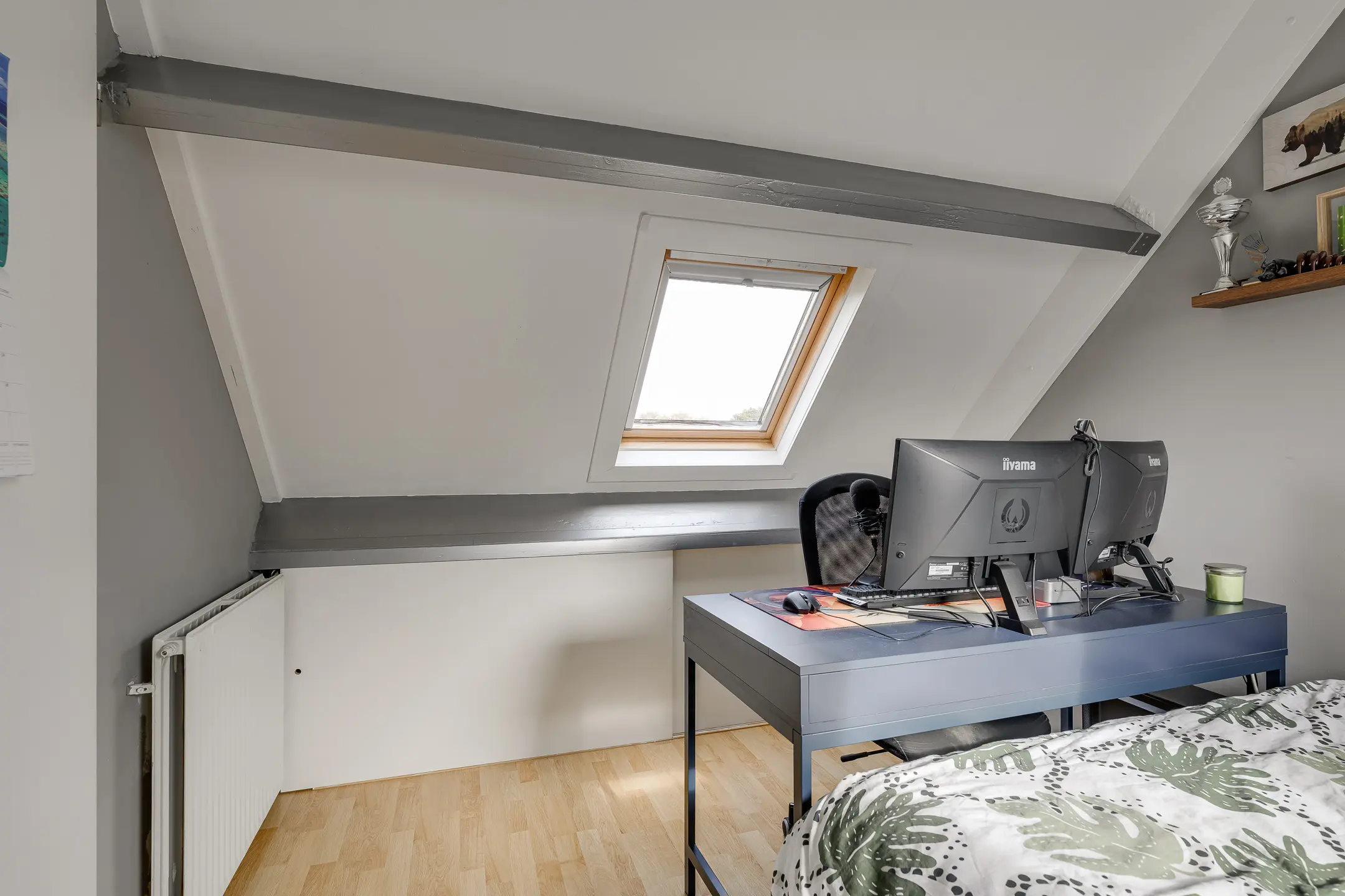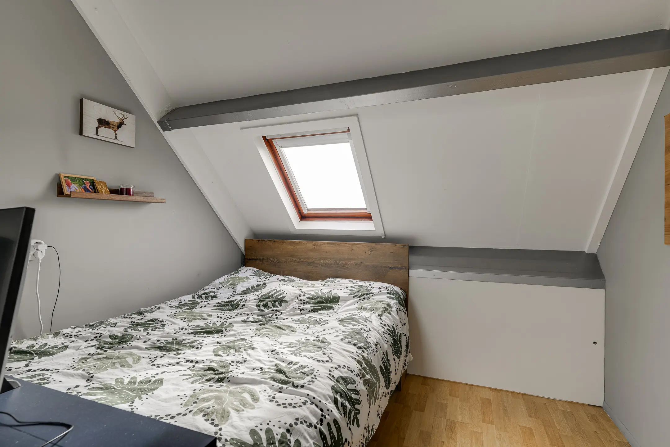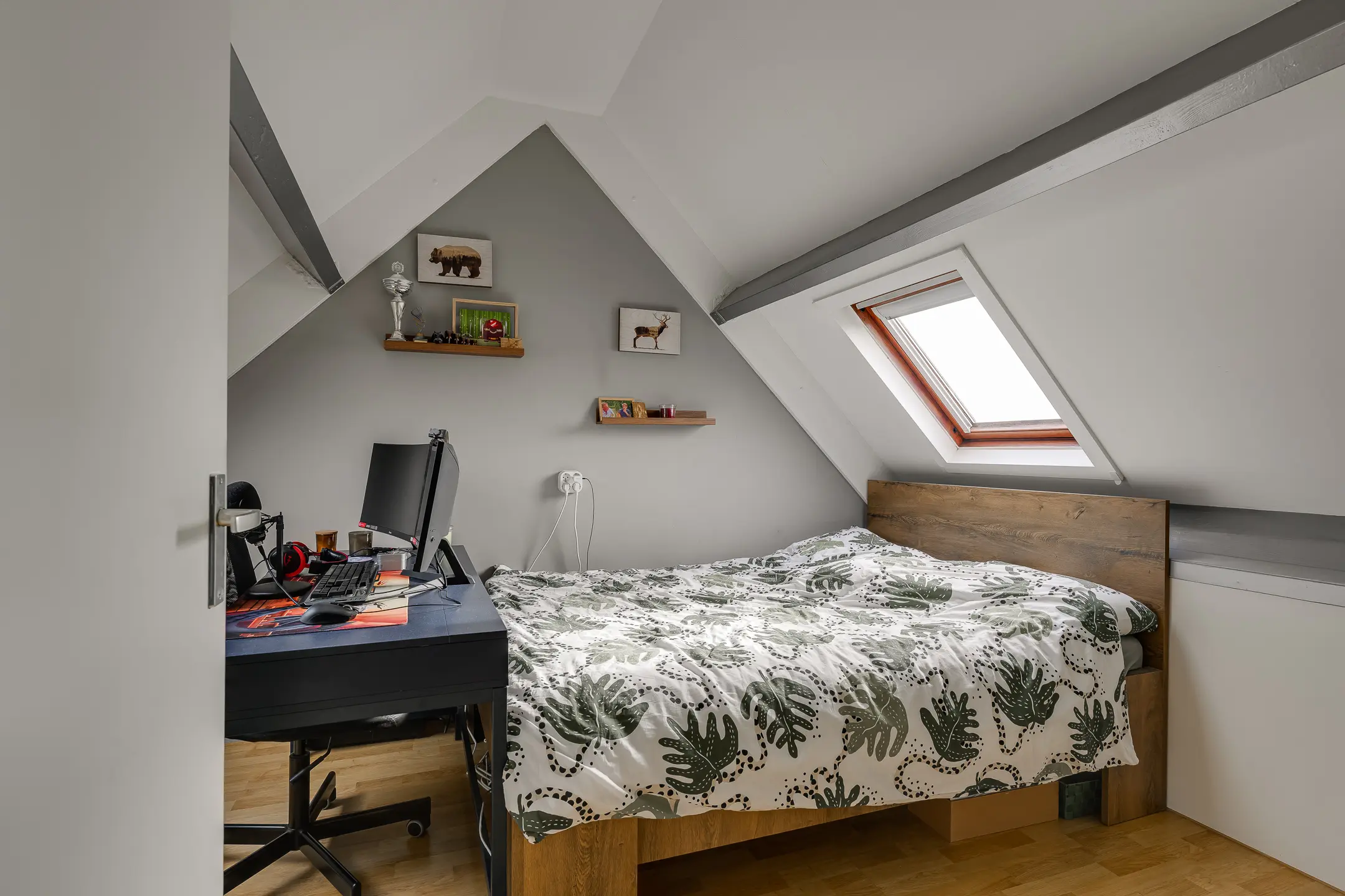 Via een vaste trap bereikt u de zolderverdieping. Hier bevindt zich de overloop met aansluitingen voor de wasmachine en droger, en een vierde slaapkamer met dakraam. De zolder biedt dankzij het dakraam voldoende licht en een gevoel van ruimte, en kan ook naar eigen wens worden ingericht. Perfect voor een tiener, logeerplek of kantoor aan huis.