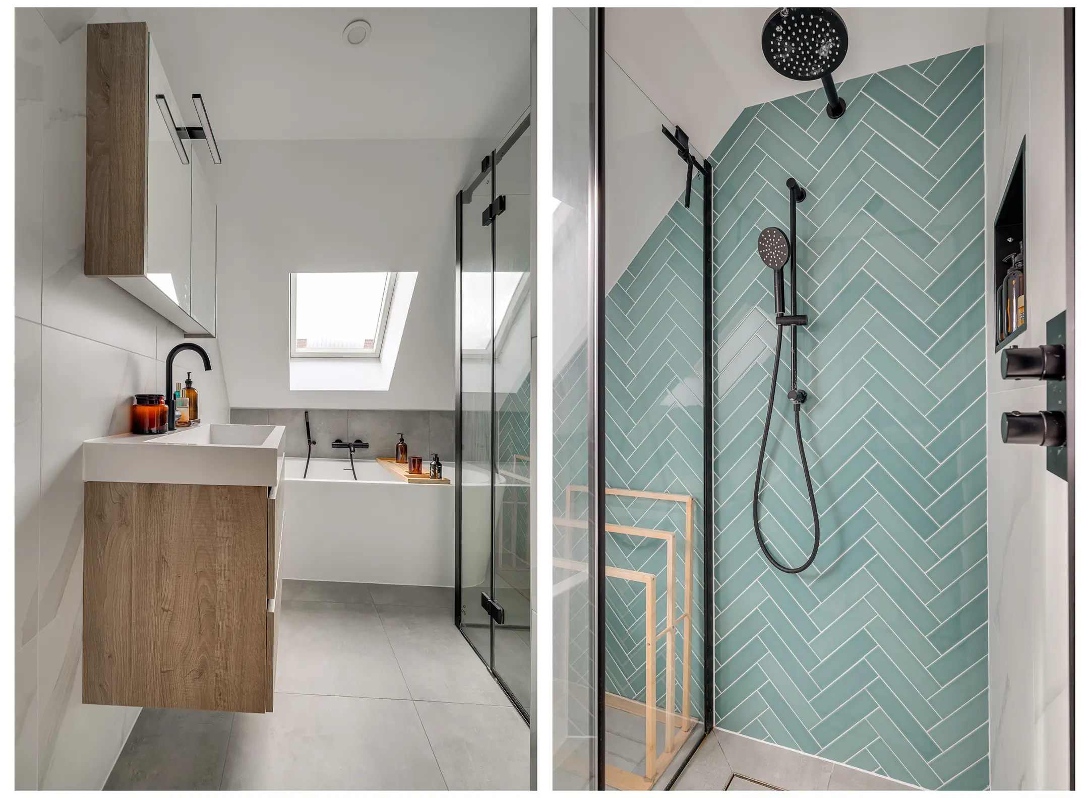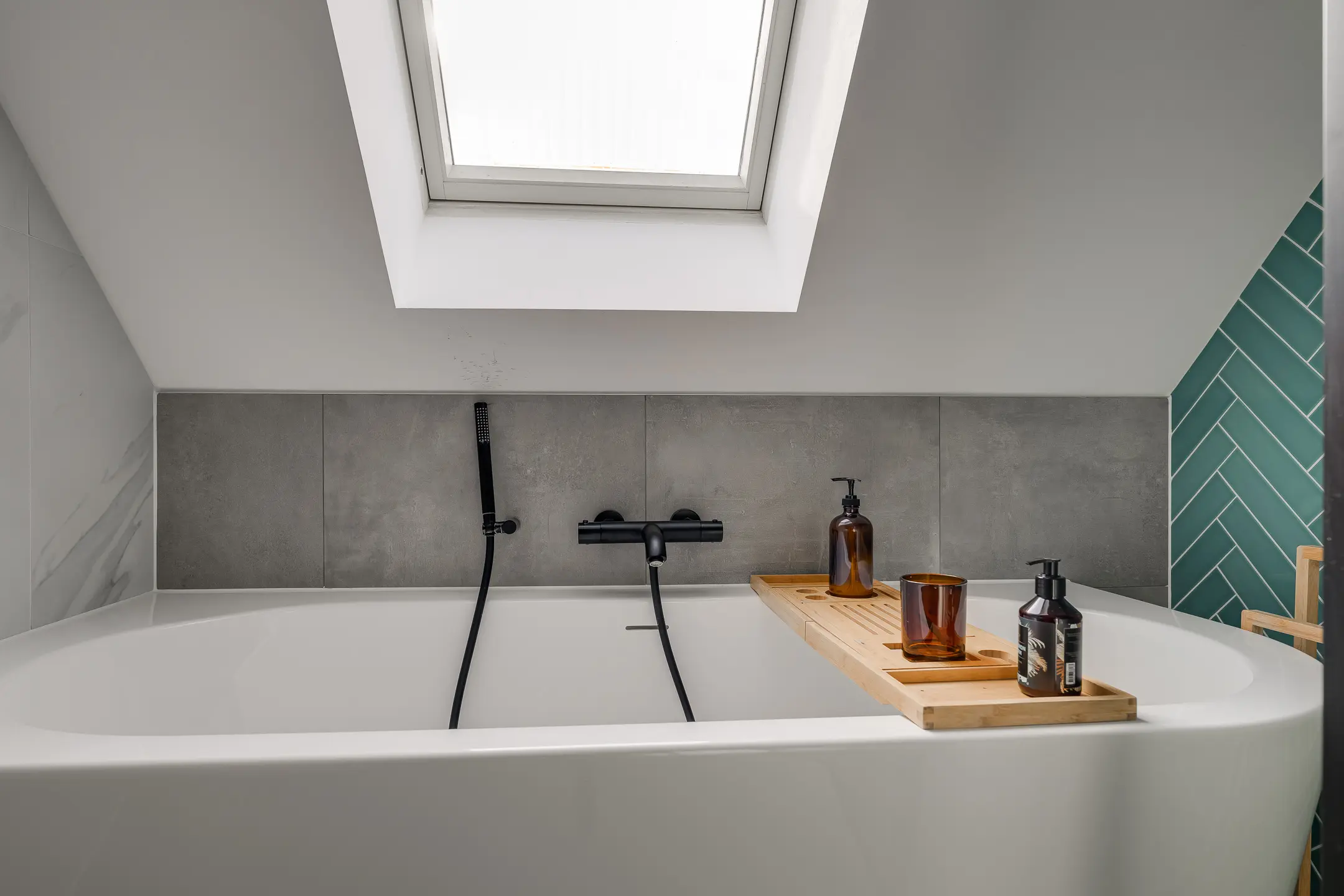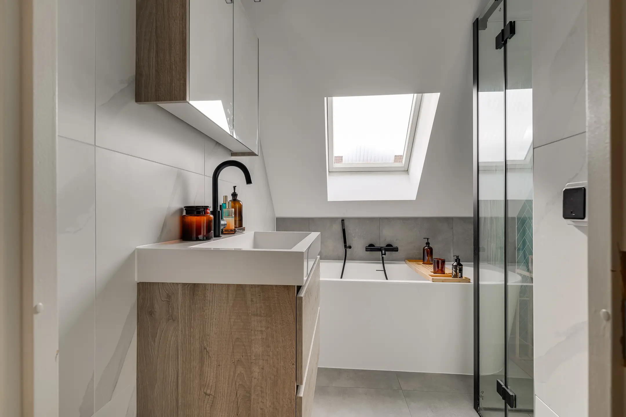 De badkamer, volledig vernieuwd in 2022, is uitgevoerd in een eigentijdse stijl en voorzien van een luxe wastafelmeubel, een inloopdouche, een ligbad en elektrische vloerverwarming voor extra comfort.