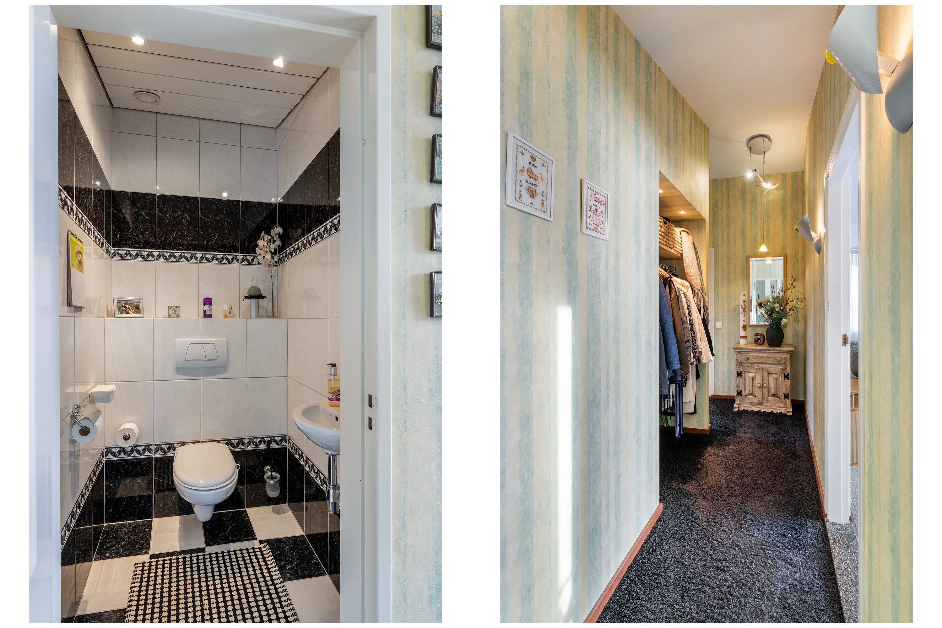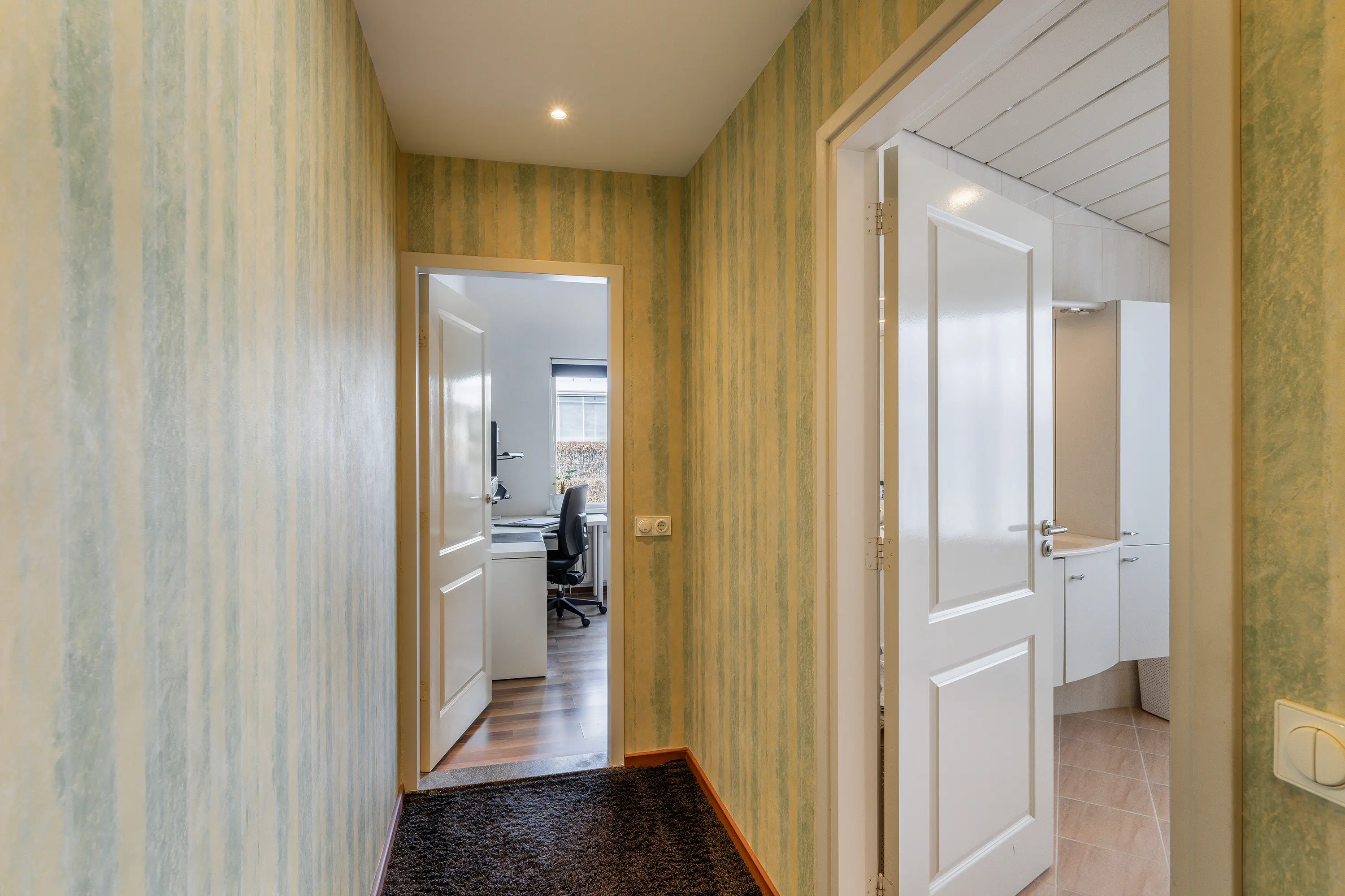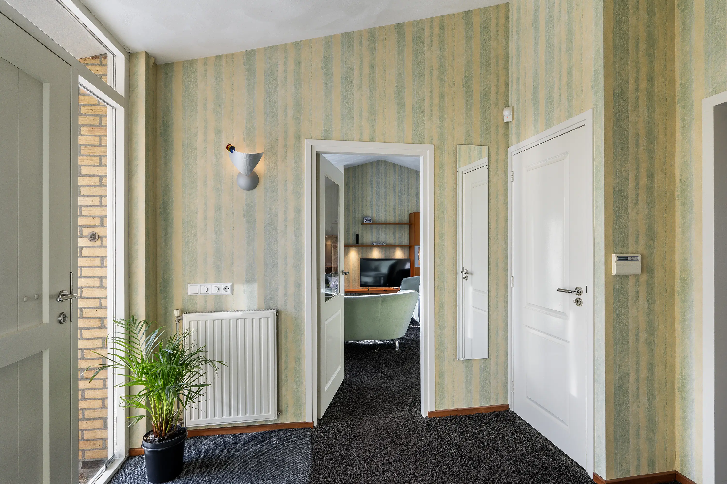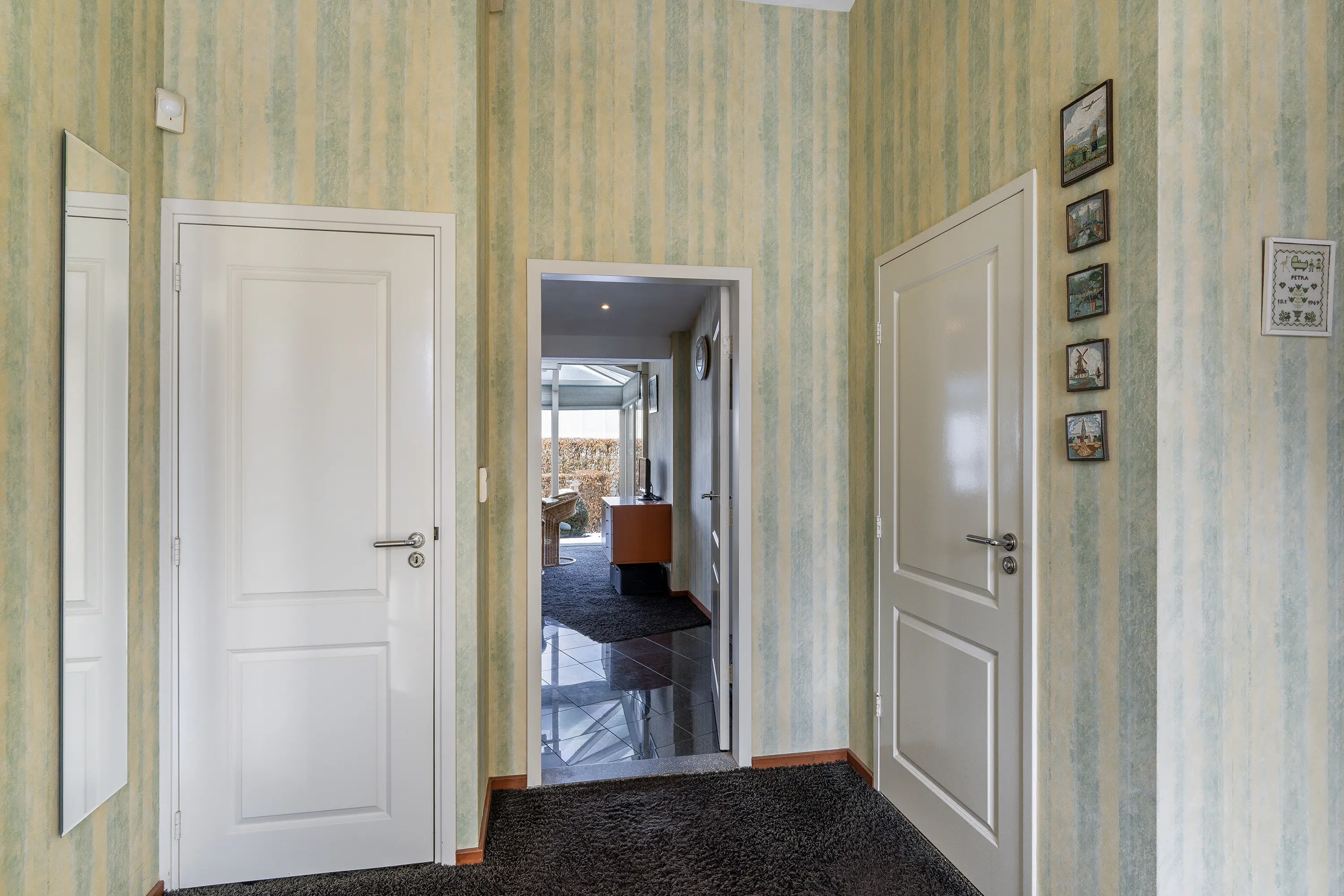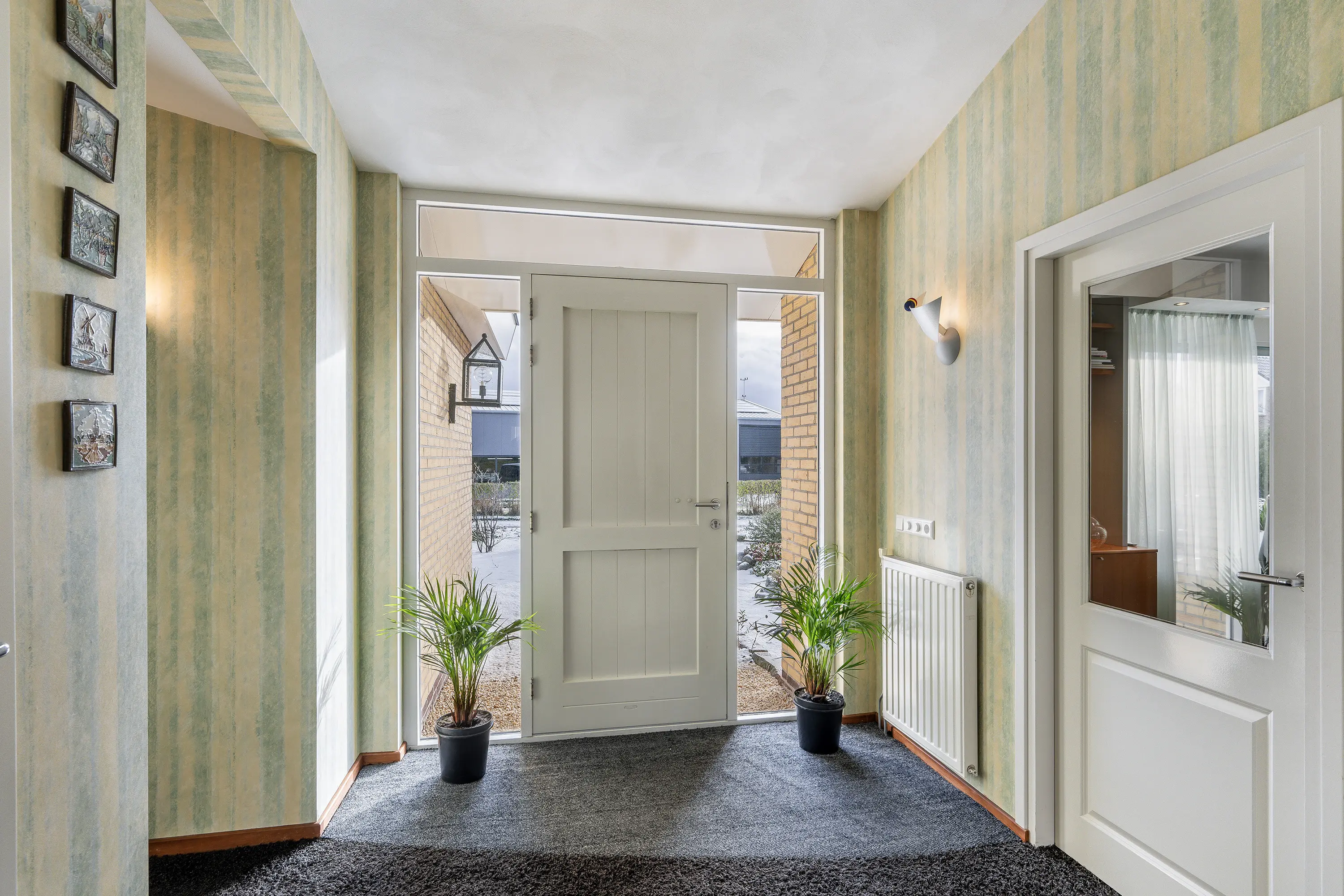 De entree van de woning is gesitueerd aan de voorzijde, waar u in een ruime hal binnenkomt. Hier is de meterkast, ruimte voor een garderobe en toegangsdeuren naar de woonkamer, keuken, een toiletruimte en toegang tot een aangrenzende hal van waaruit de twee slaapkamers en de badkamer toegankelijk is.