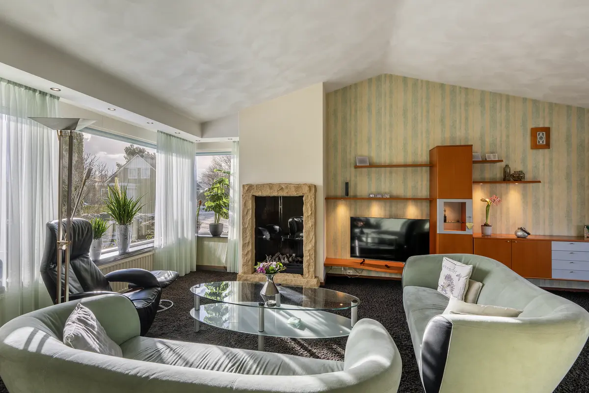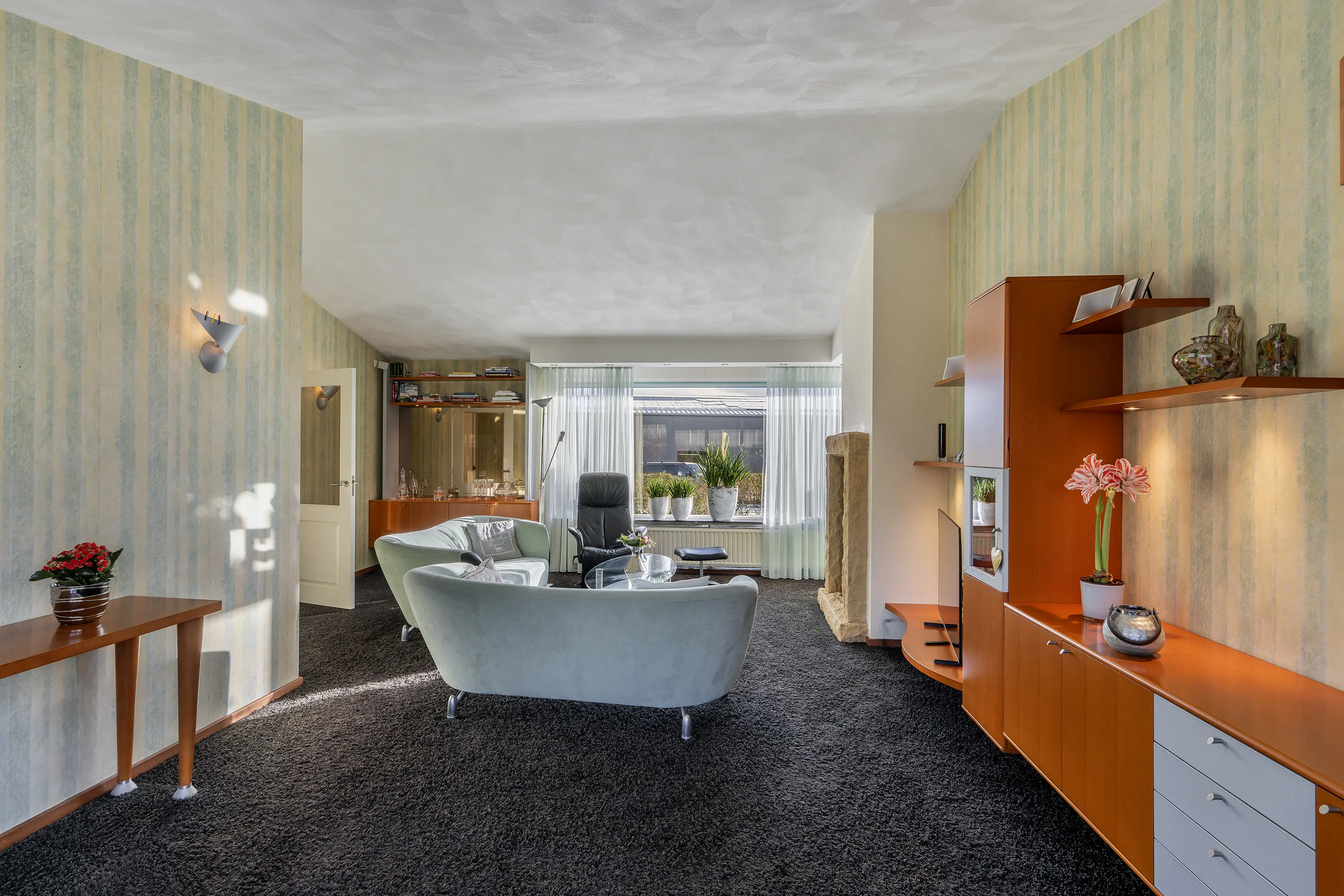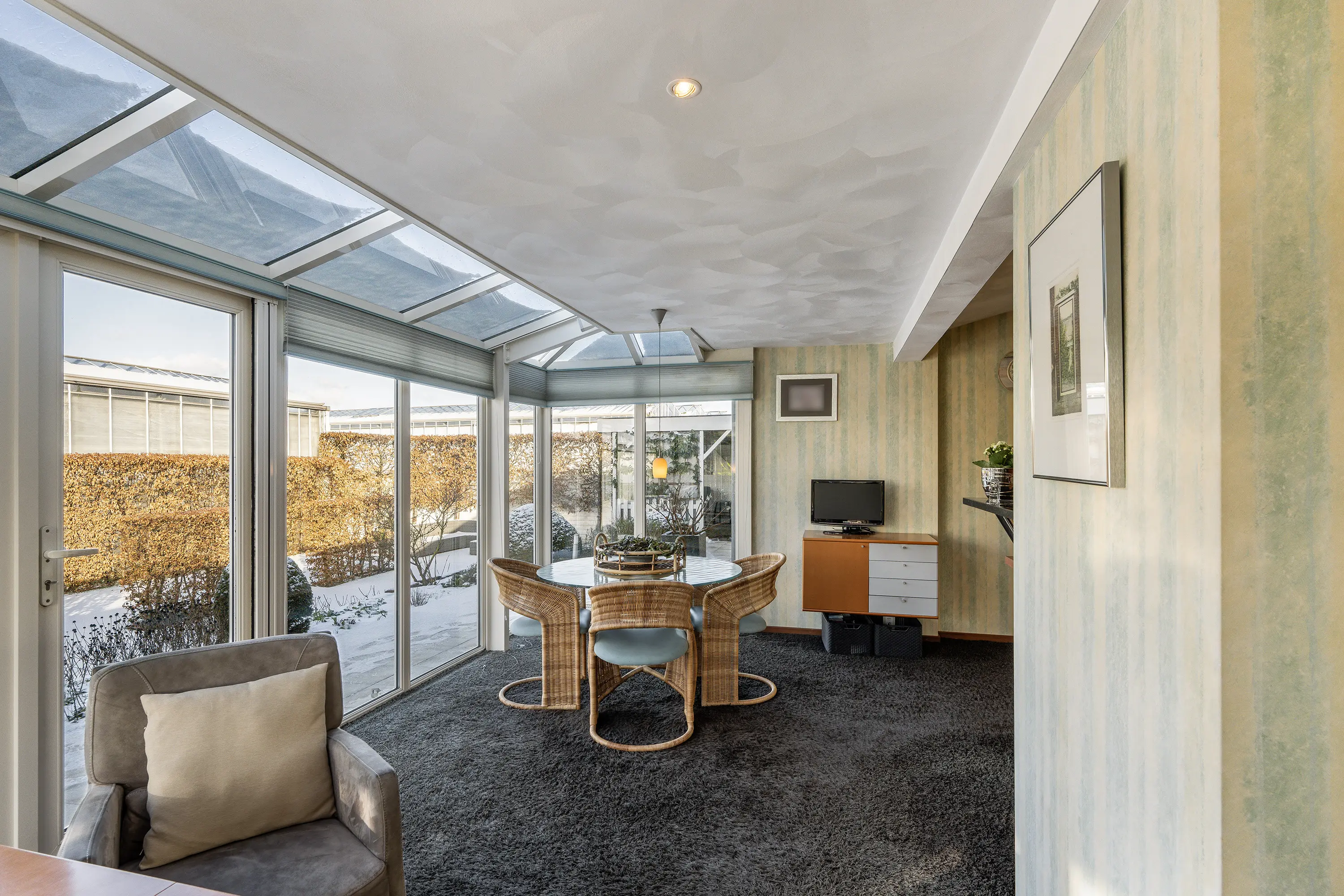 Een riante woonkamer, links van de entree, valt direct op door de overvloed aan daglicht dankzij de grote voorramen en de prachtige serre met vloerverwarming en glazen dak aan de tuinzijde. Deze serre vormt een heerlijke plek om elk seizoen van de tuin te genieten. Een echte eyecatcher in de woonkamer is de sfeervolle gashaard in de zithoek.