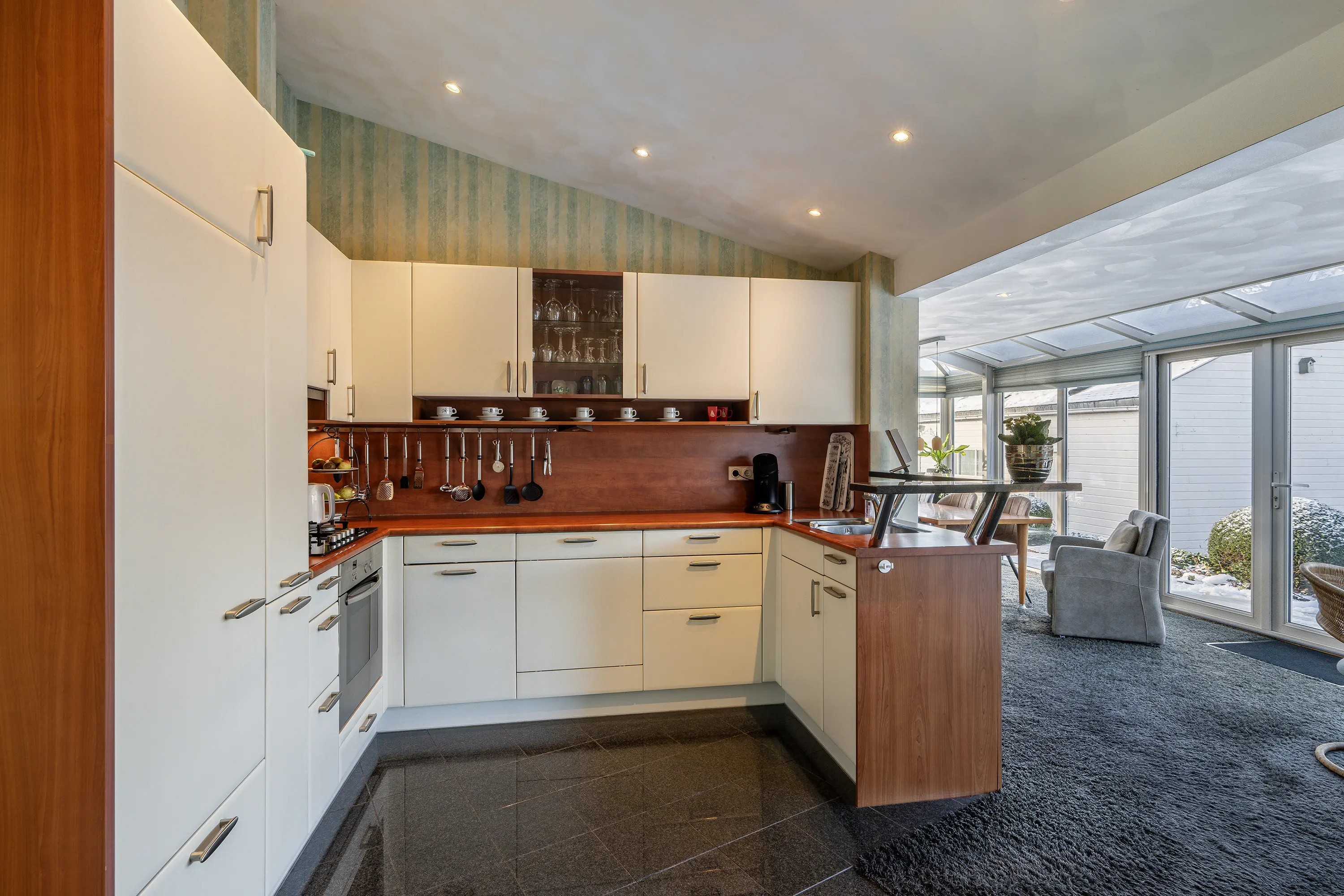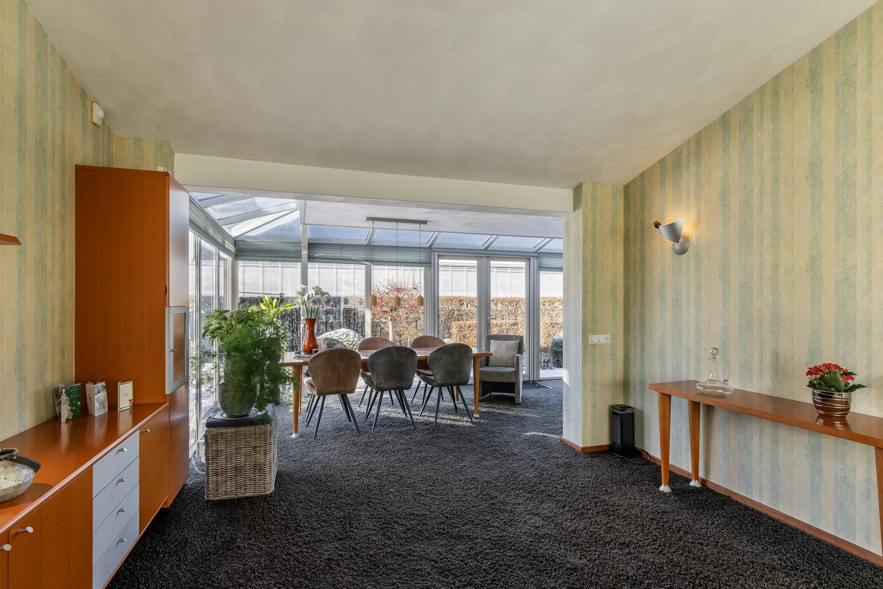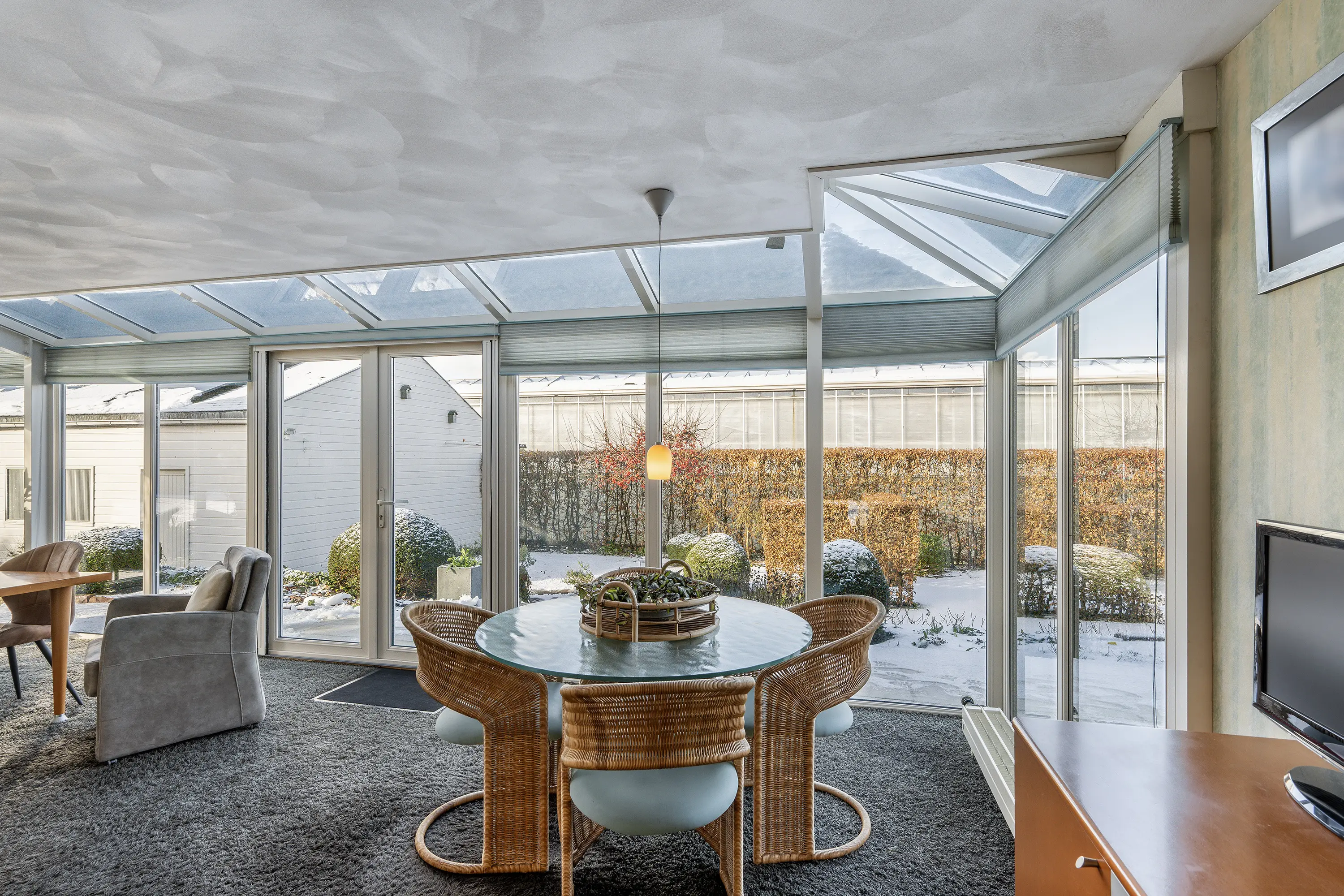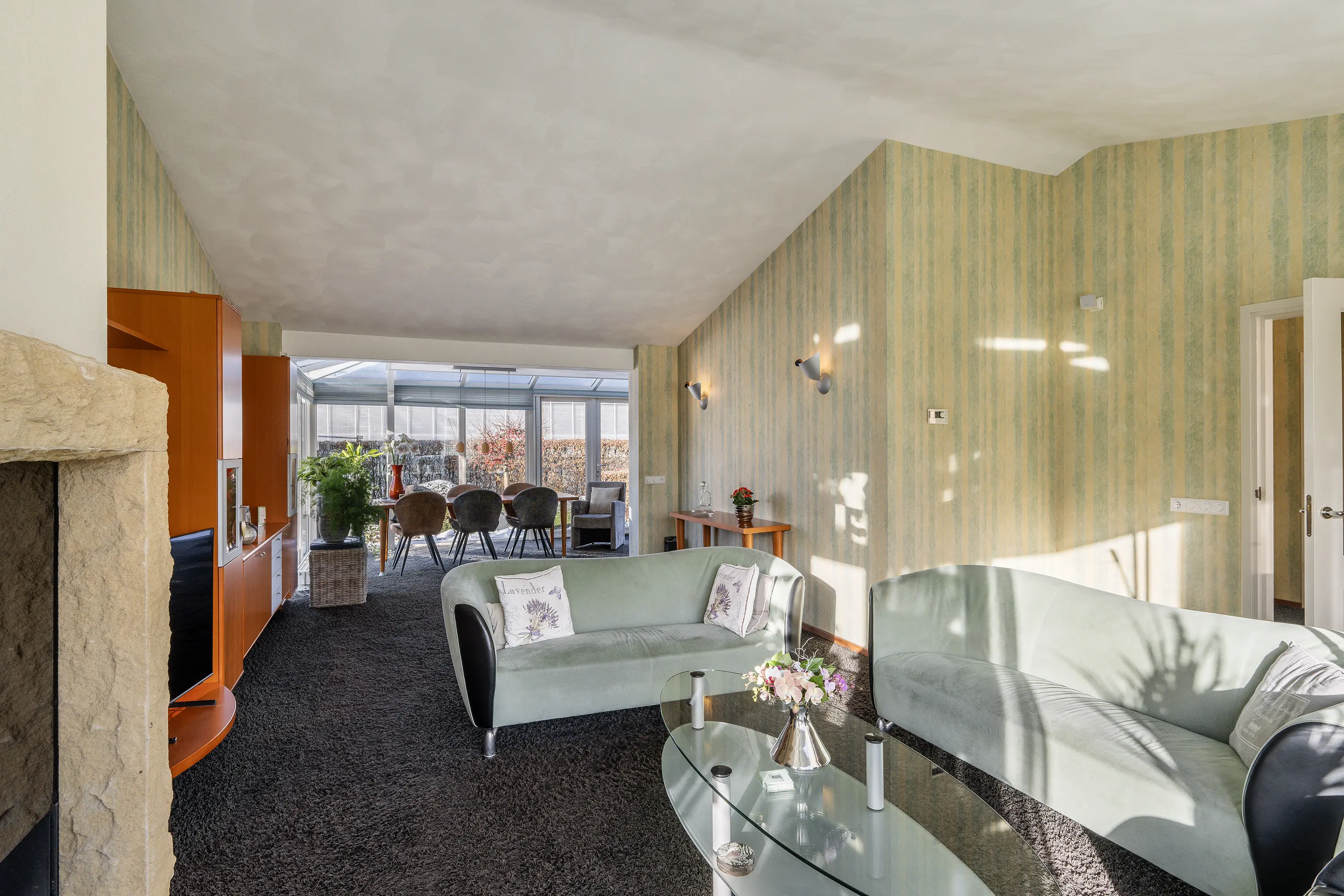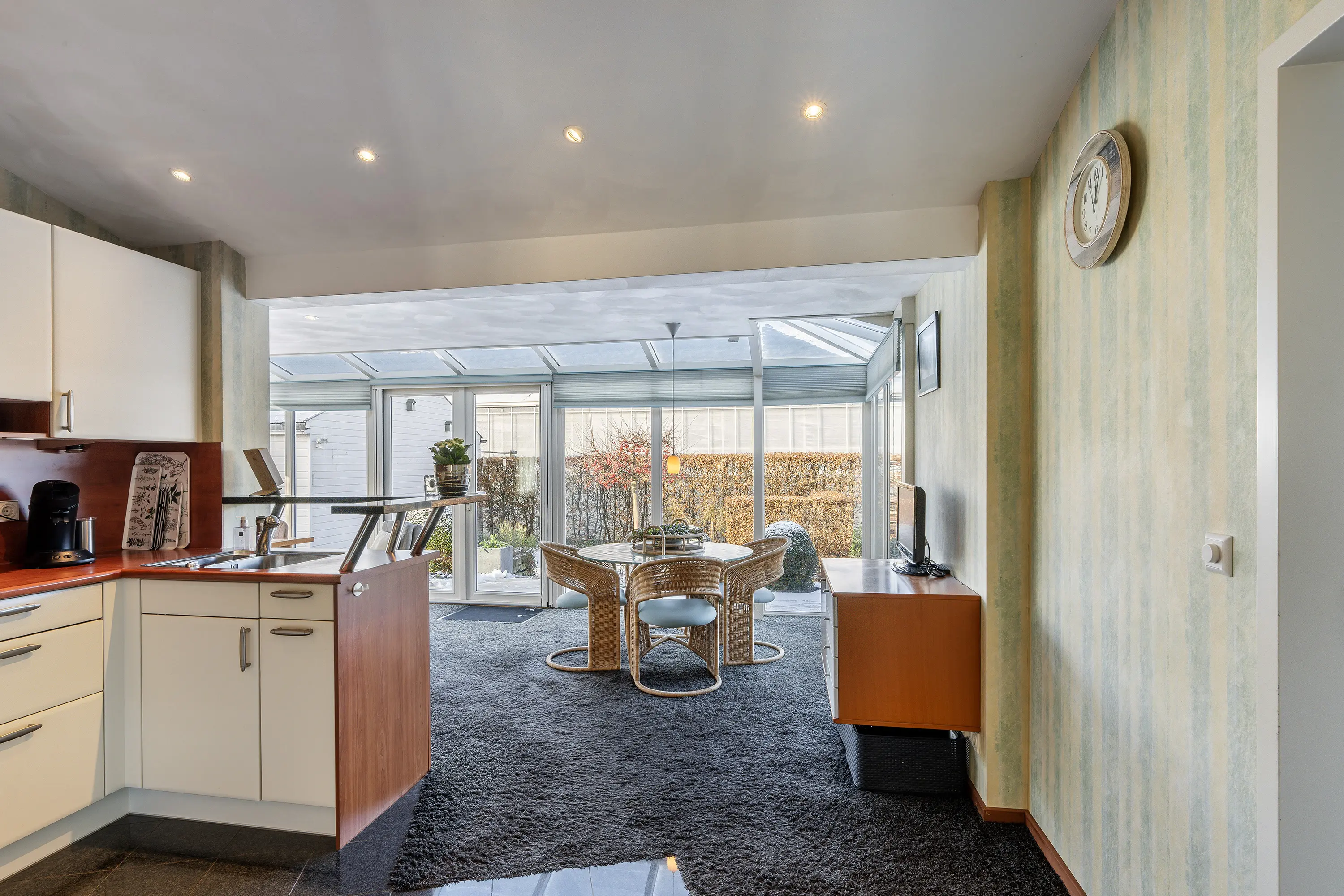 - Riante woonkamer met halfopen keuken en serre met uitzicht op de tuin;