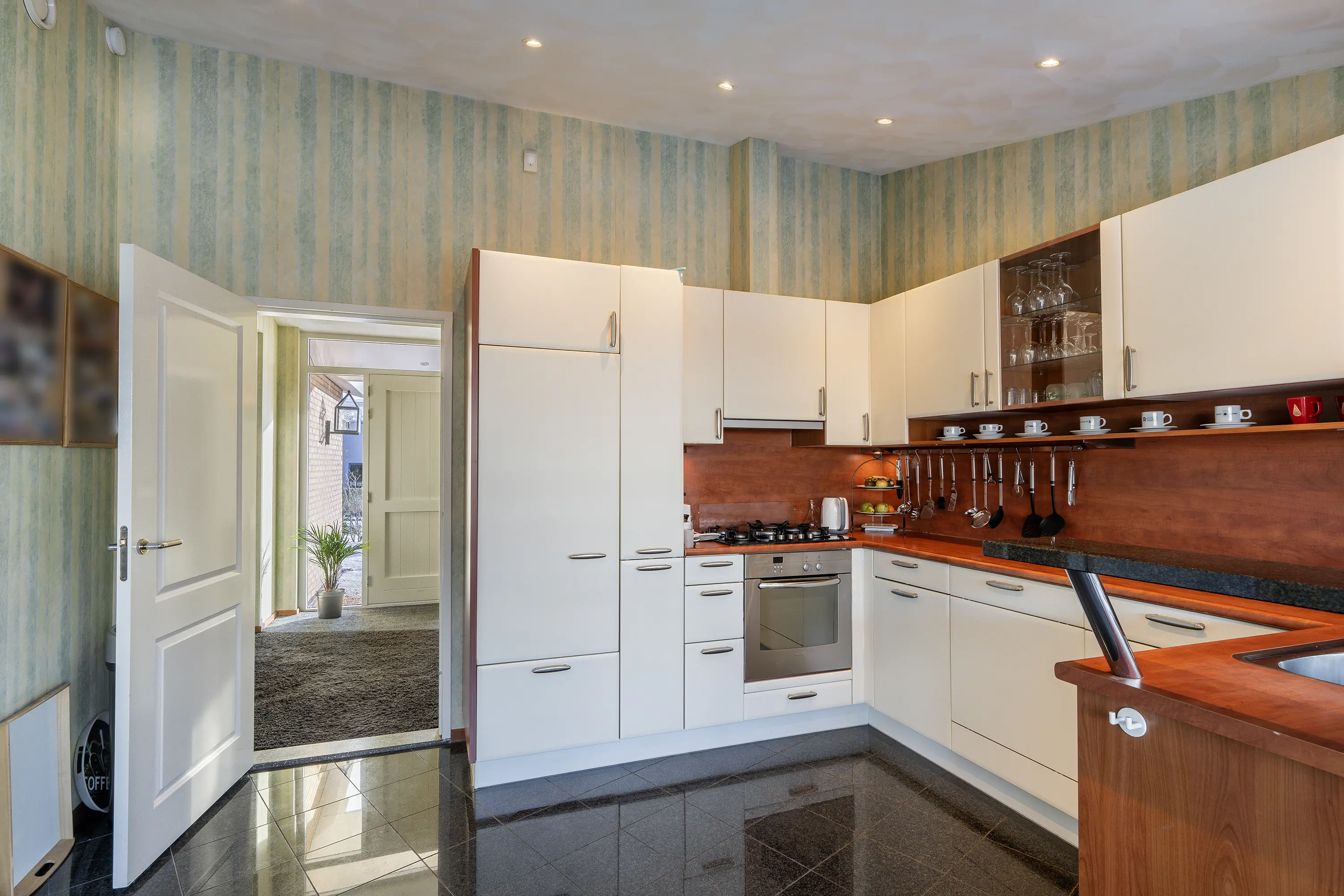 Naast diverse kastruimte, waaronder een praktische apothekerskast, bestaat de inbouwapparatuur uit een 5-pits gasfornuis met wokbrander en afzuigkap, een oven, koelkast, vaatwasser en spoelbak met mengkraan.