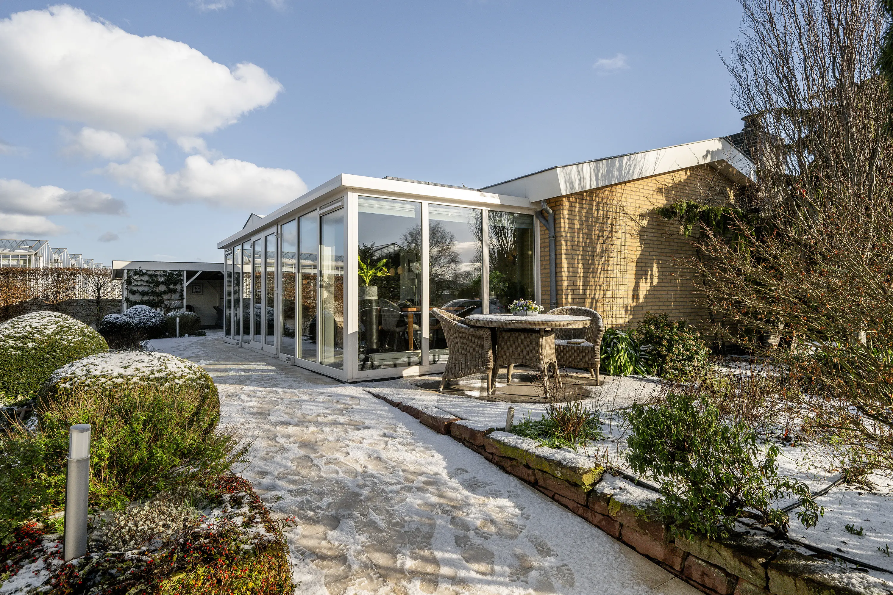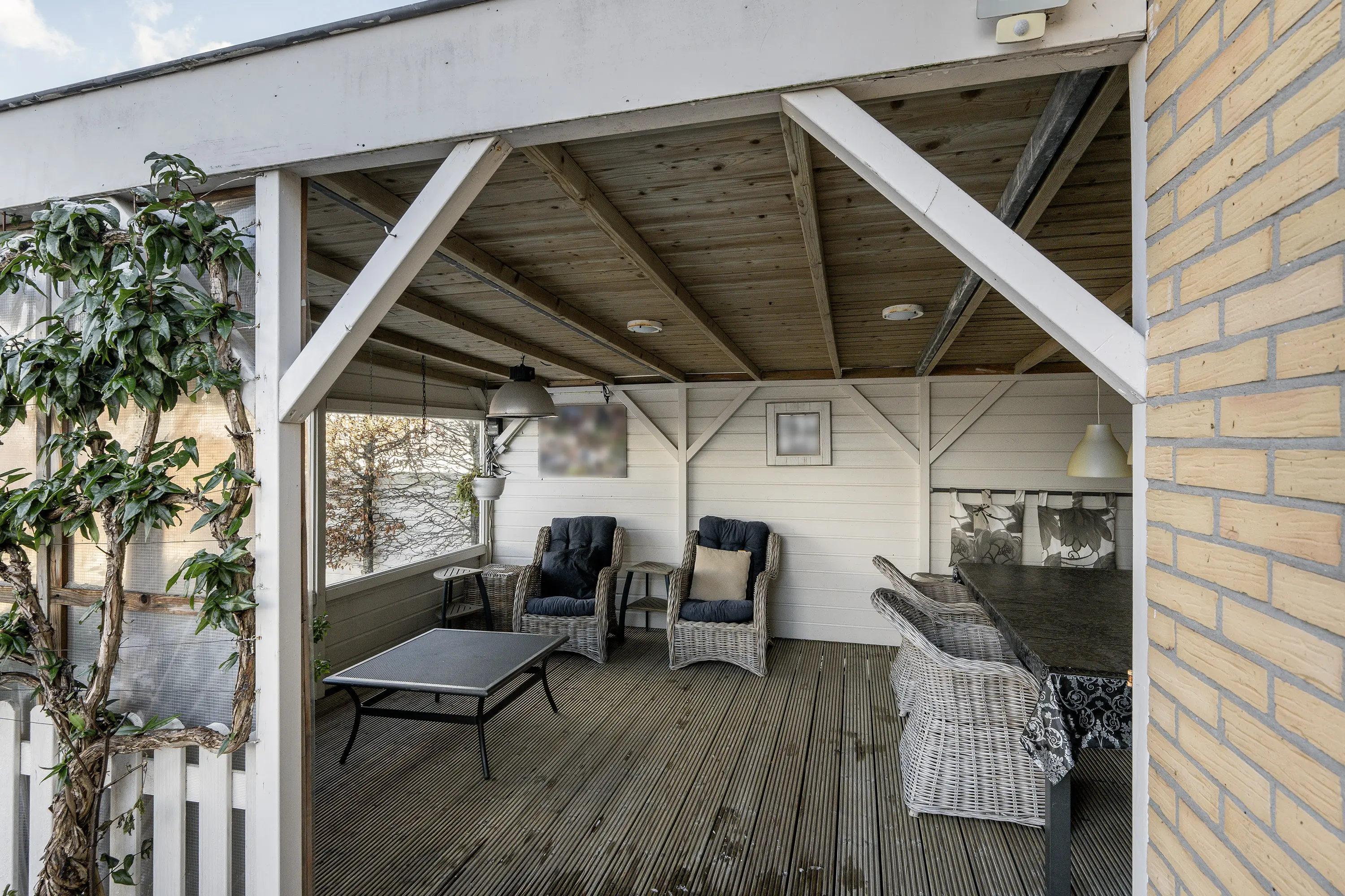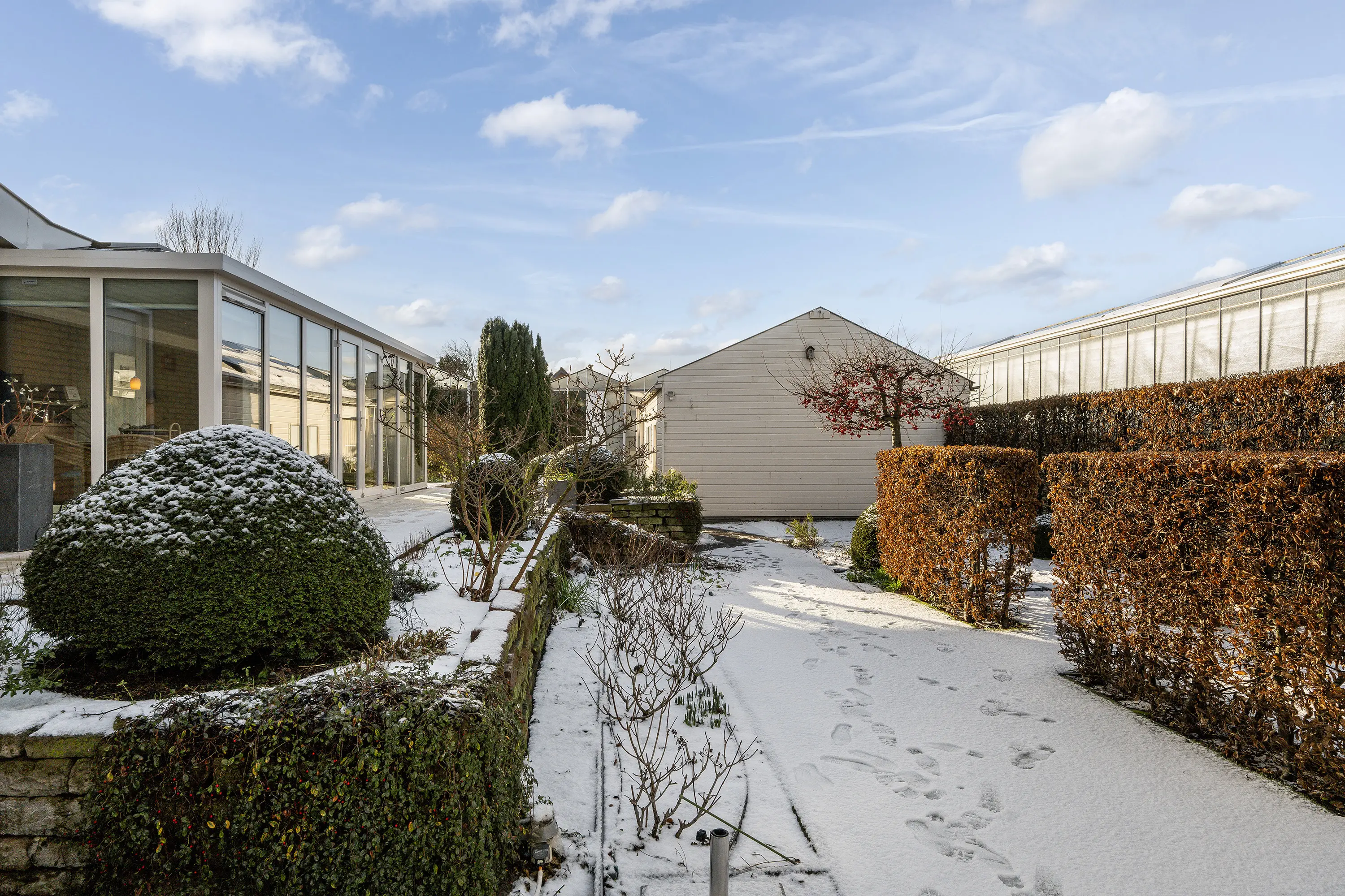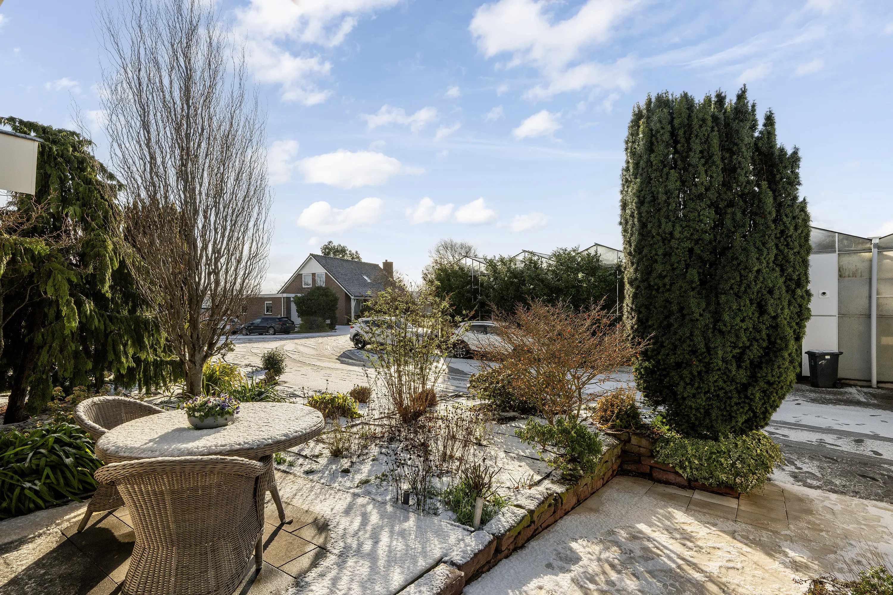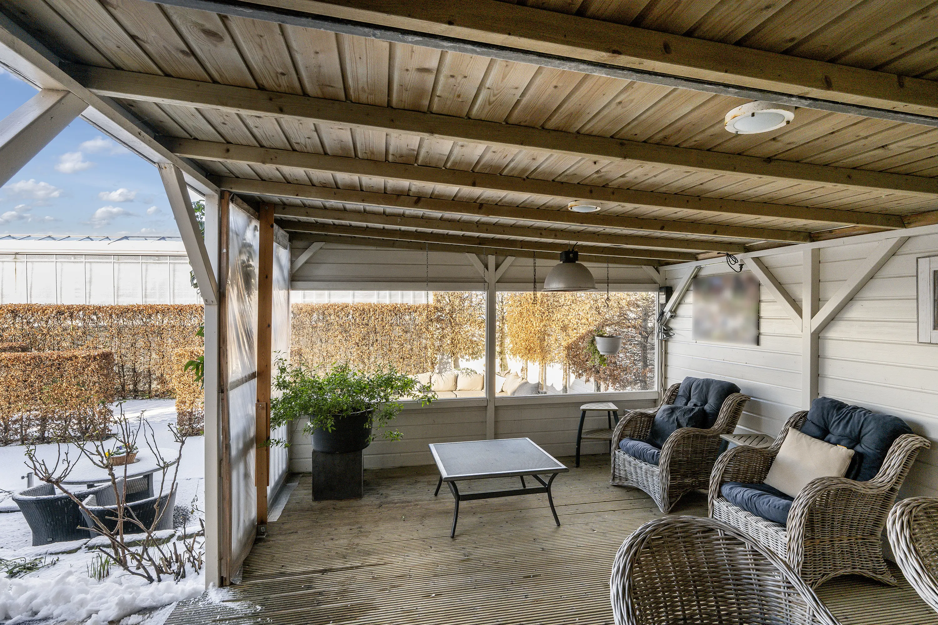 Vanuit de serre leiden openslaande deuren naar de fraai aangelegde, groene achtertuin, omringd door een heg en voorzien van meerdere terrassen. Onder de robuuste houten overkapping met elektra kunt u al vroeg in het jaar buiten genieten.