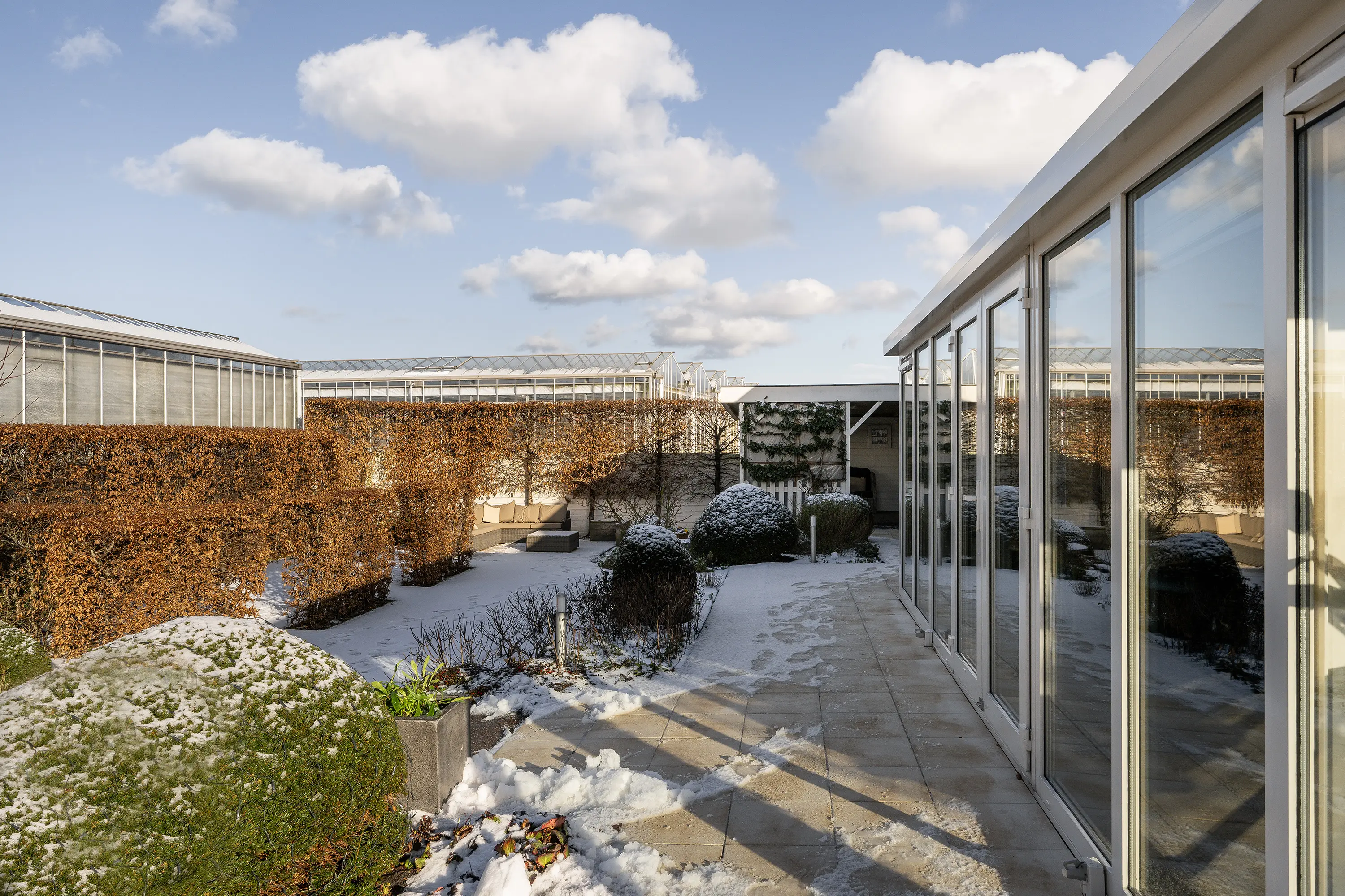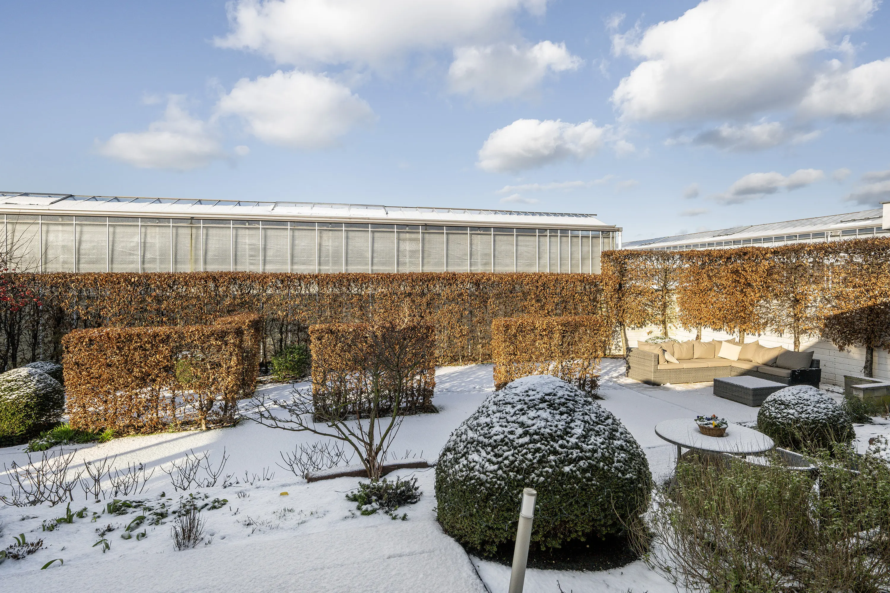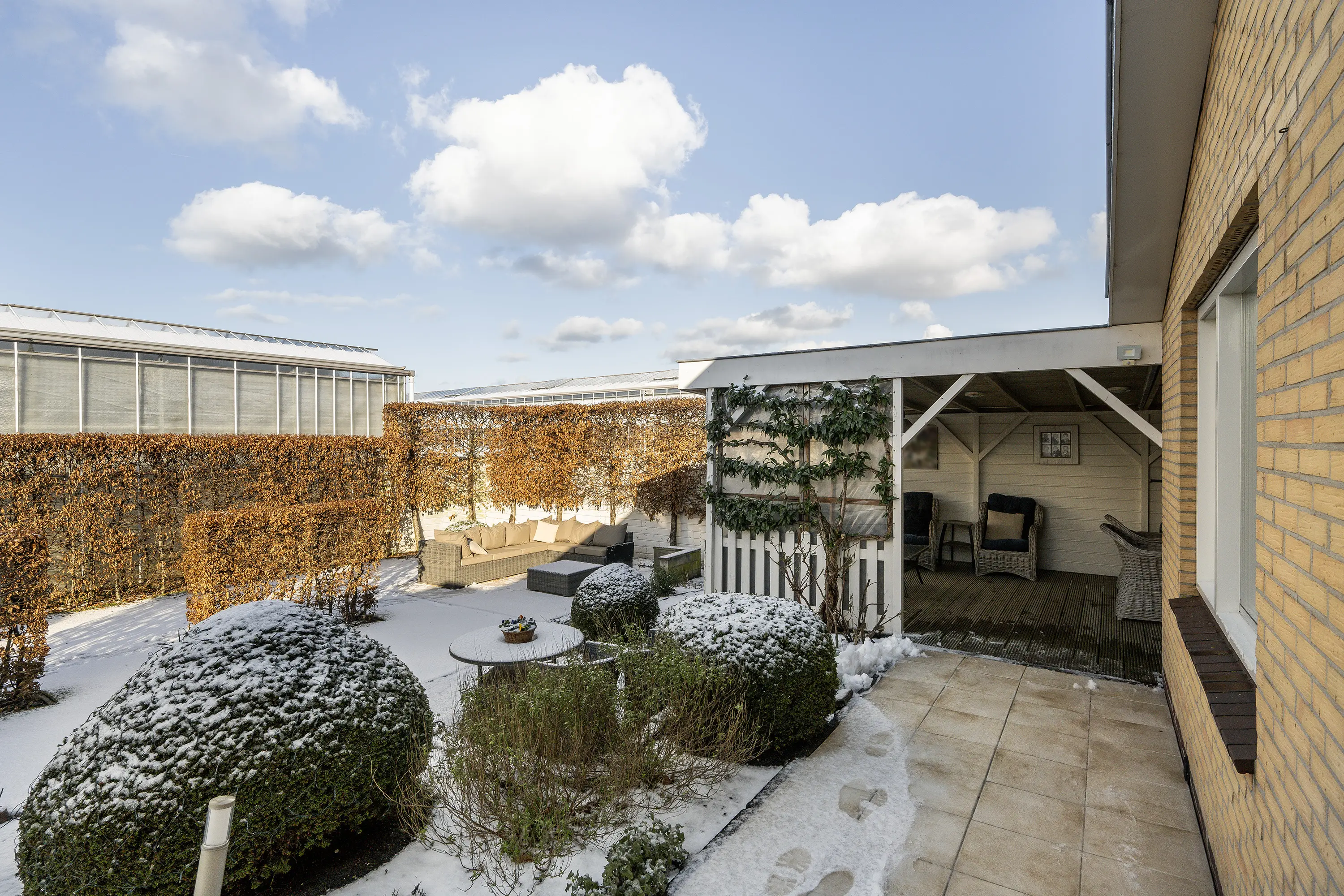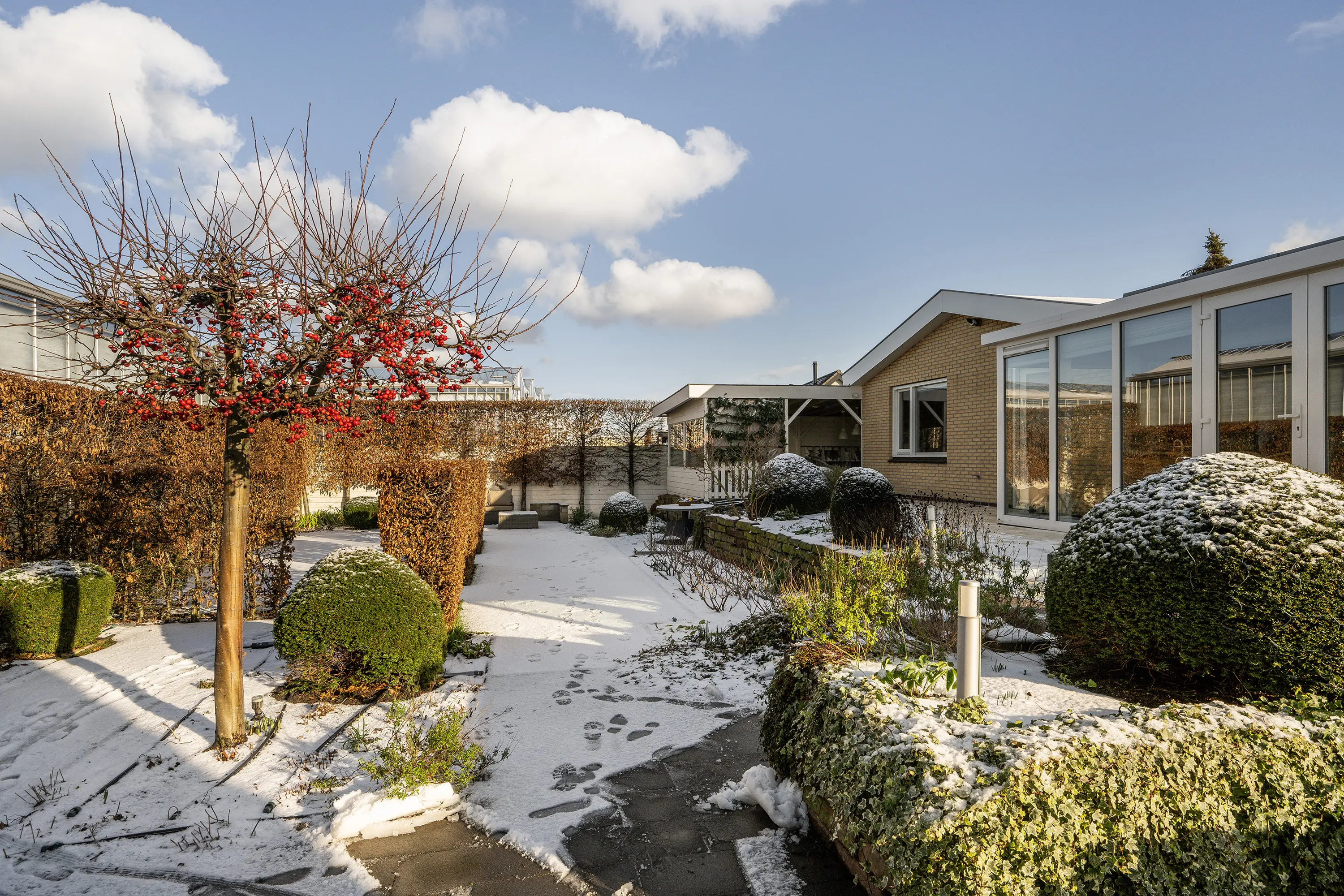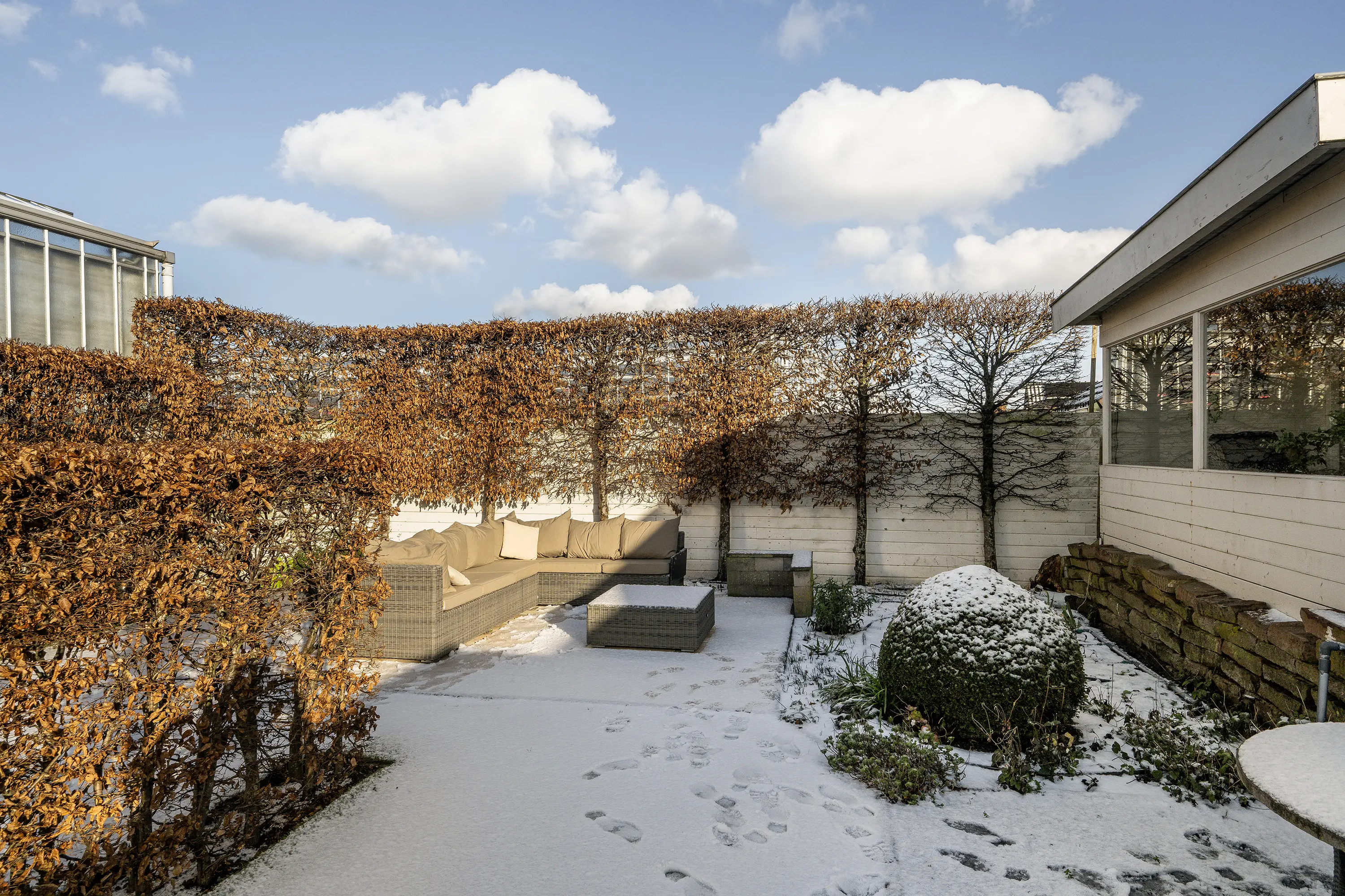 Vanuit de serre leiden openslaande deuren naar de fraai aangelegde, groene achtertuin, omringd door een heg en voorzien van meerdere terrassen. Onder de robuuste houten overkapping met elektra kunt u al vroeg in het jaar buiten genieten.