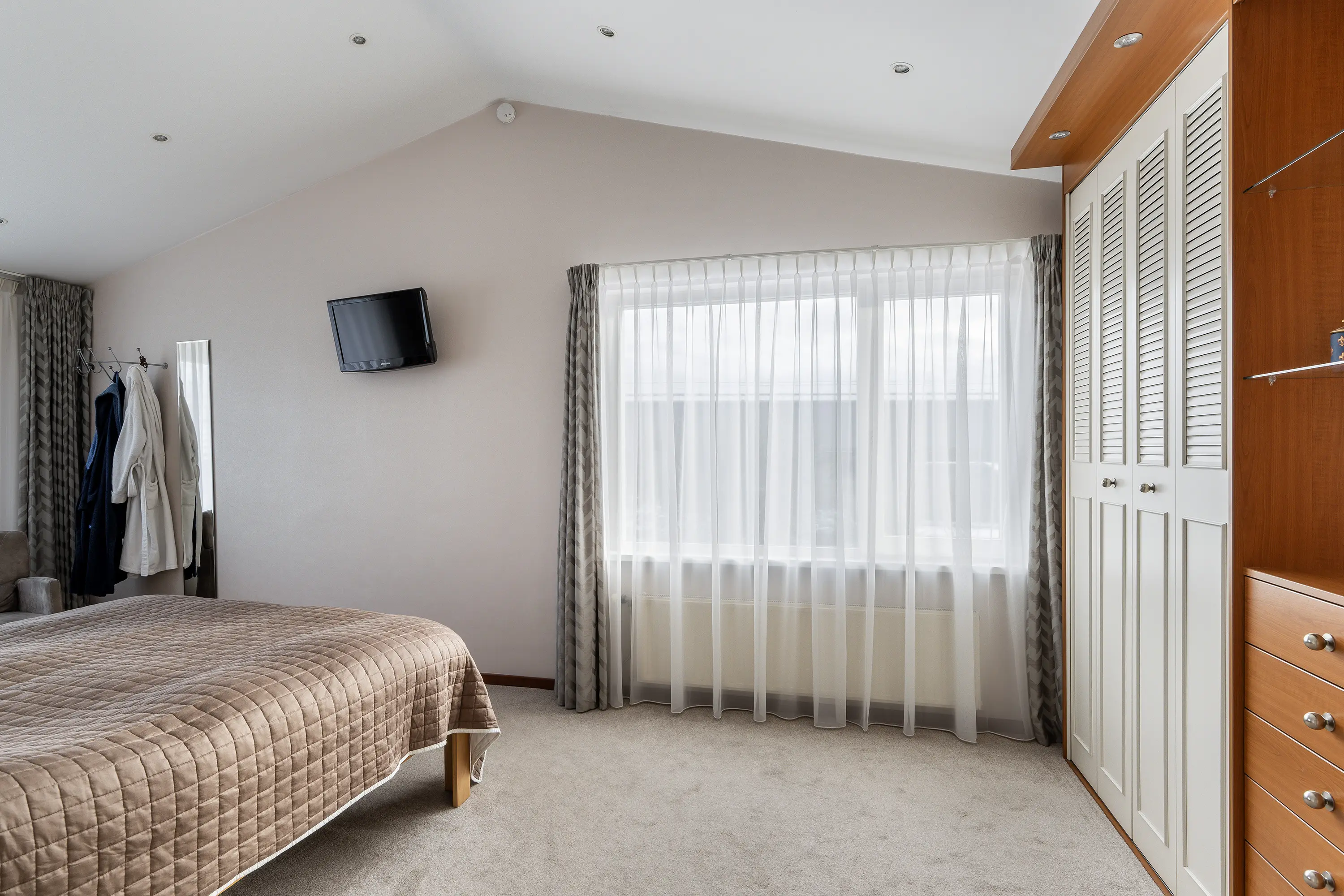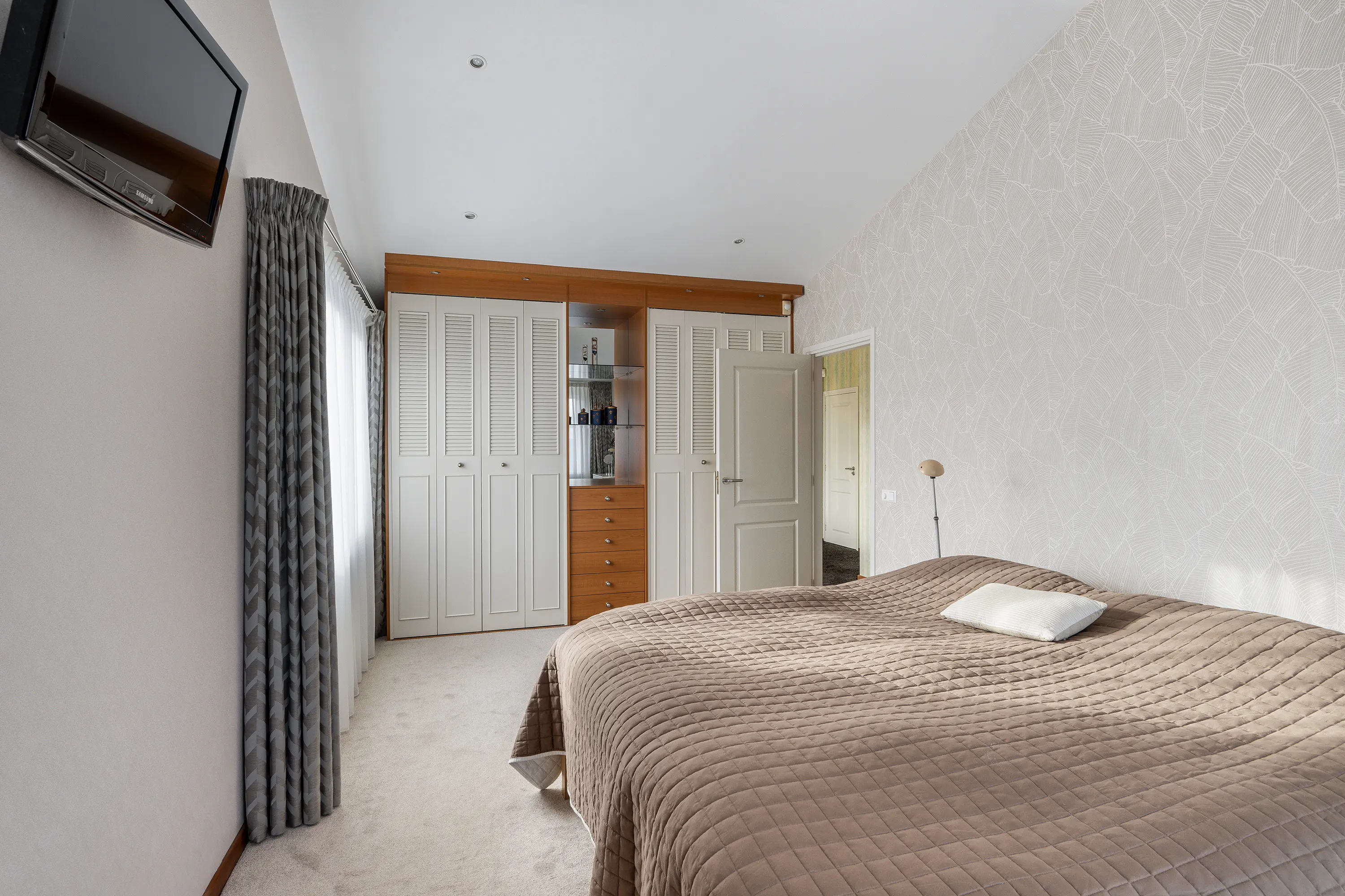 De hoofdslaapkamer aan de voorzijde, is een lichte ruimte van ca. 22.7 m2 met vaste kastruimte, tv-aansluiting, en twee grote raampartijen. Voorheen waren dit twee slaapkamers, indien gewenst kan dit vrij eenvoudig weer gerealiseerd worden.