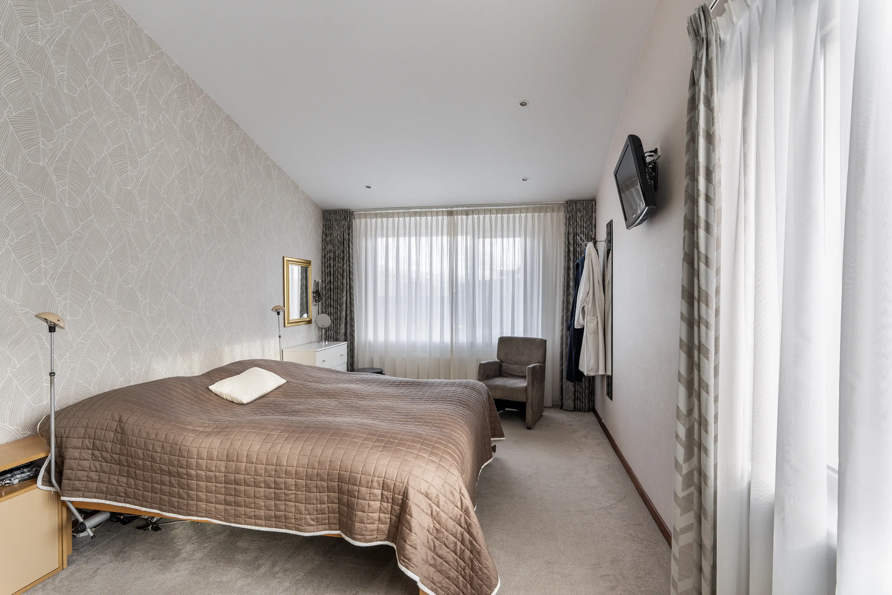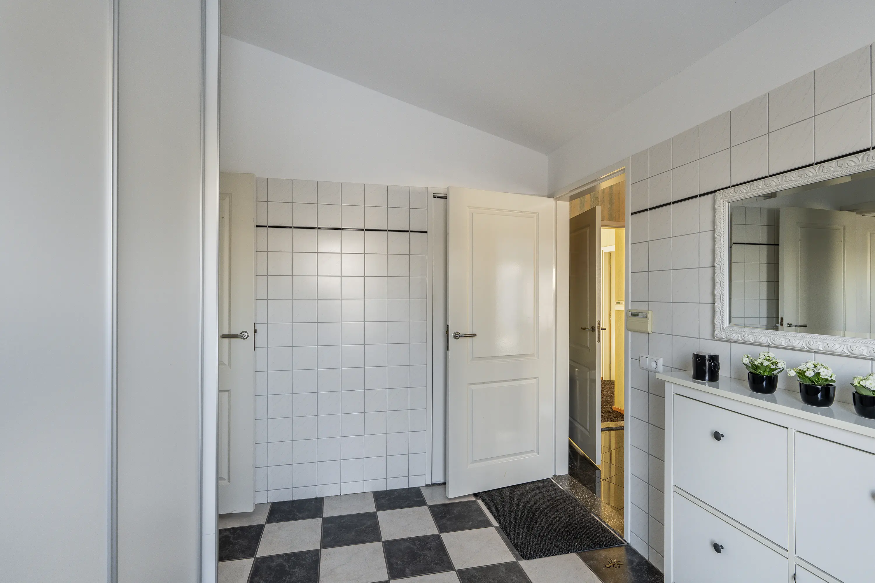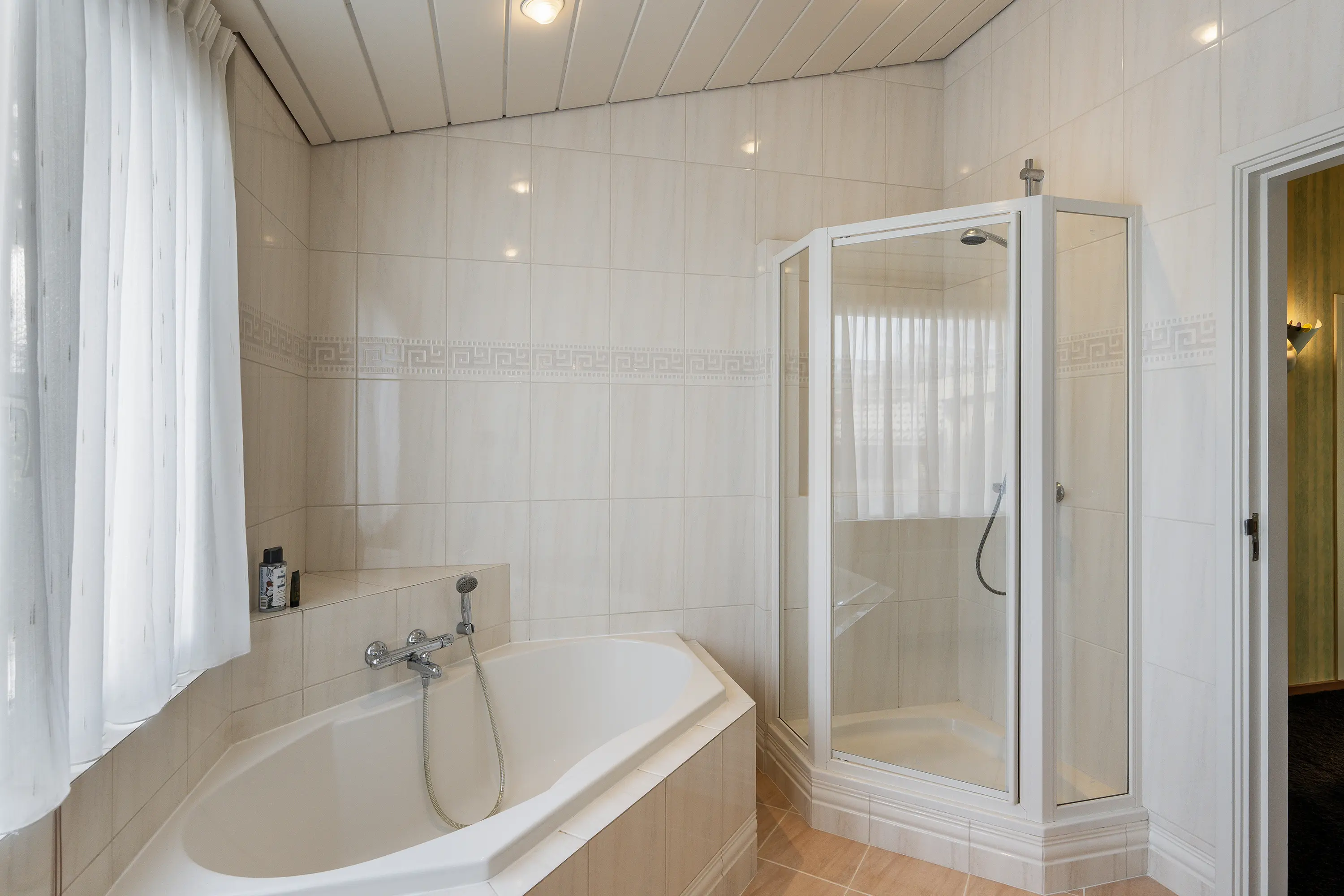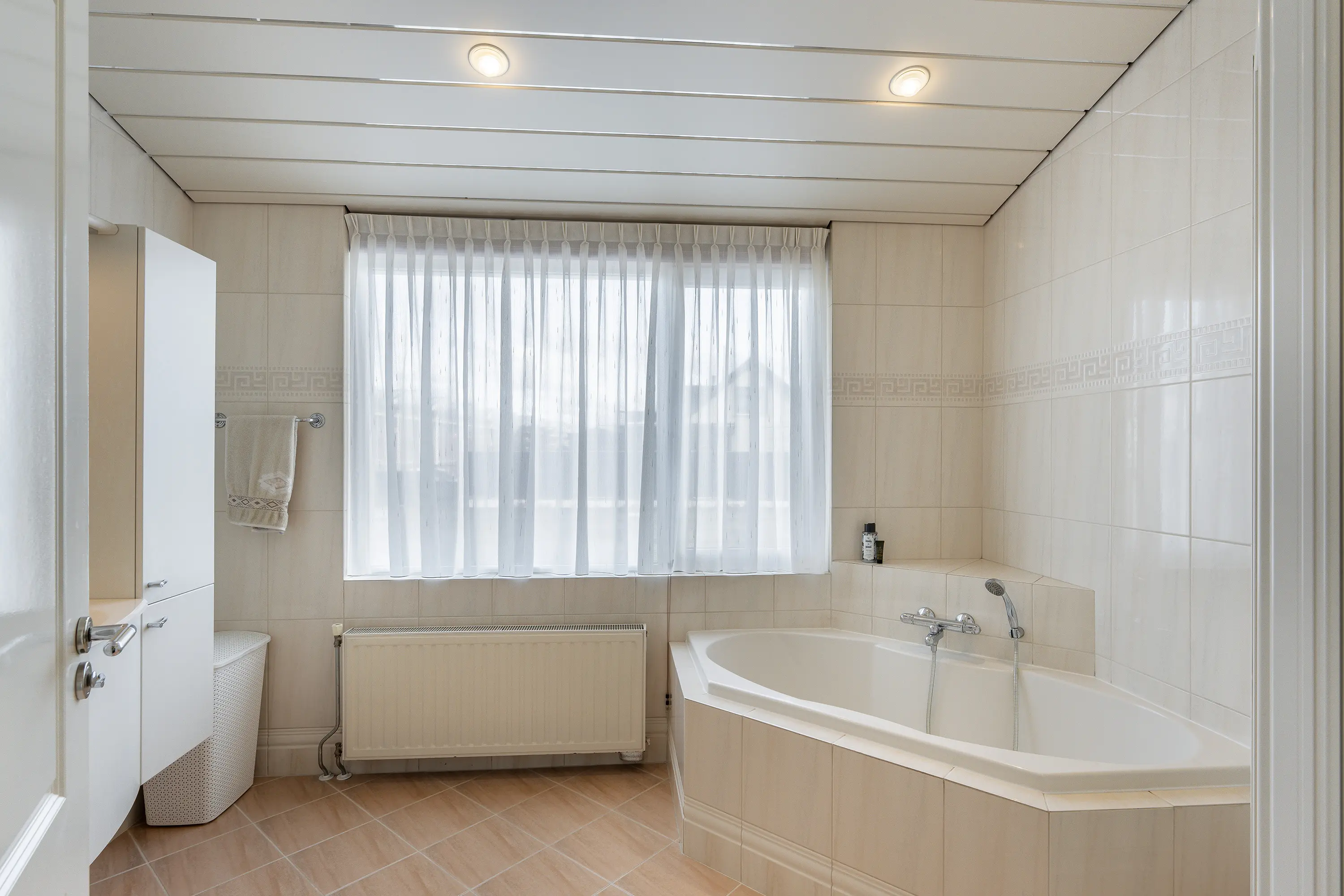 Aangrenzend bevindt zich de volledig betegelde badkamer, compleet ingericht met ligbad, douchecabine, en dubbel wastafelmeubel. De neutrale tegels in lichte kleurstelling en het grote kozijn met te openen raam maken de badkamer licht en tijdloos. De radiator en aanwezige vloerverwarming zorgen voor een aangename temperatuur.