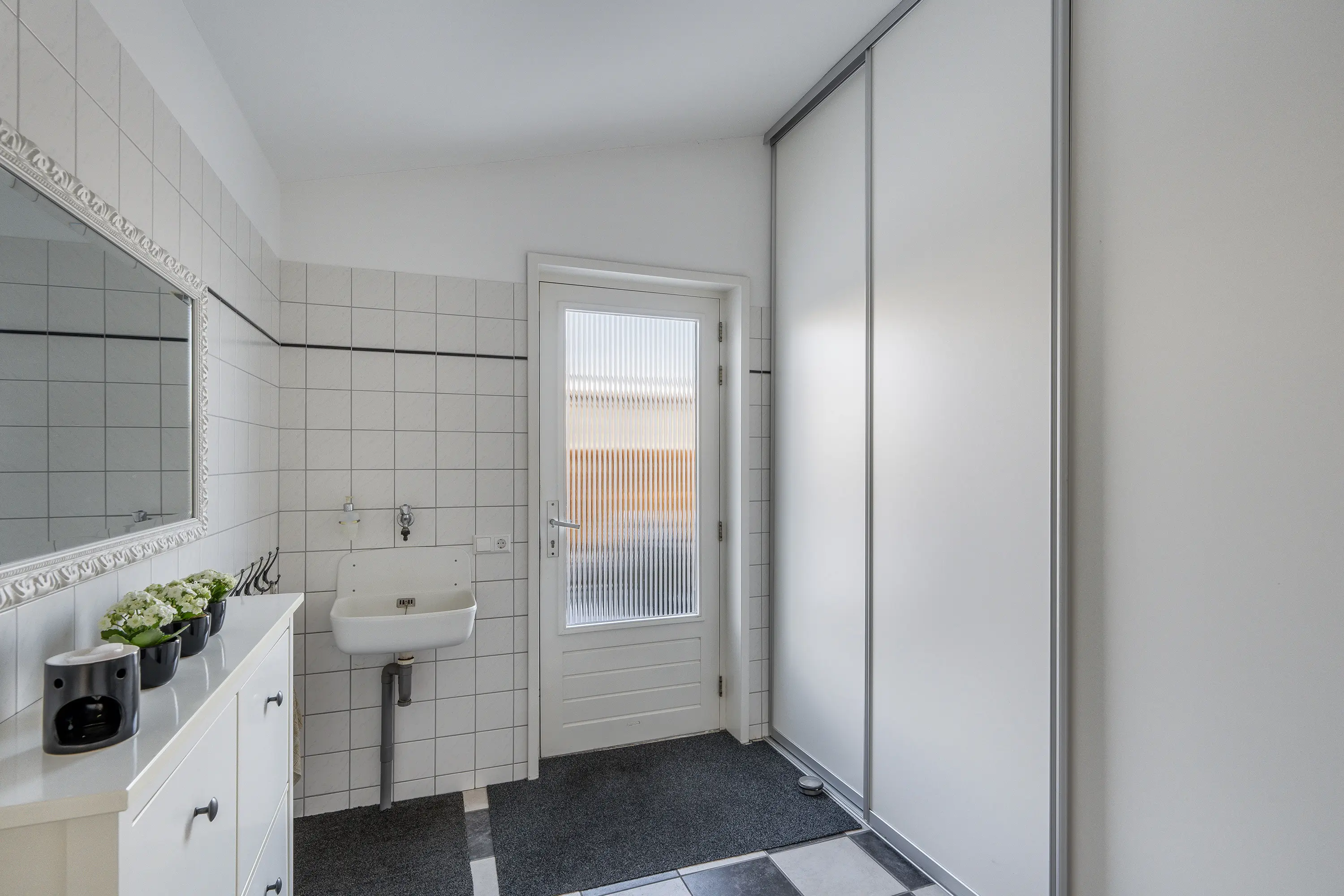 Ideaal is de aangrenzende bijkeuken, voorzien van vloerverwarming, achter de keuken. Hier kunt u uw emmer vullen in de spoelbak, natte jassen te drogen hangen, en spullen kwijt in de plafondhoge schuifwandenkast, waarin tevens de cv-ketel (2020), pomp voor de vloerverwarming en de aansluiting voor de wasmachine zijn weggewerkt. Een extra, inpandige kastruimte is eveneens toegankelijk via de bijkeuken. Vanuit de bijkeuken is de tuin te bereiken middels een loopdeur.