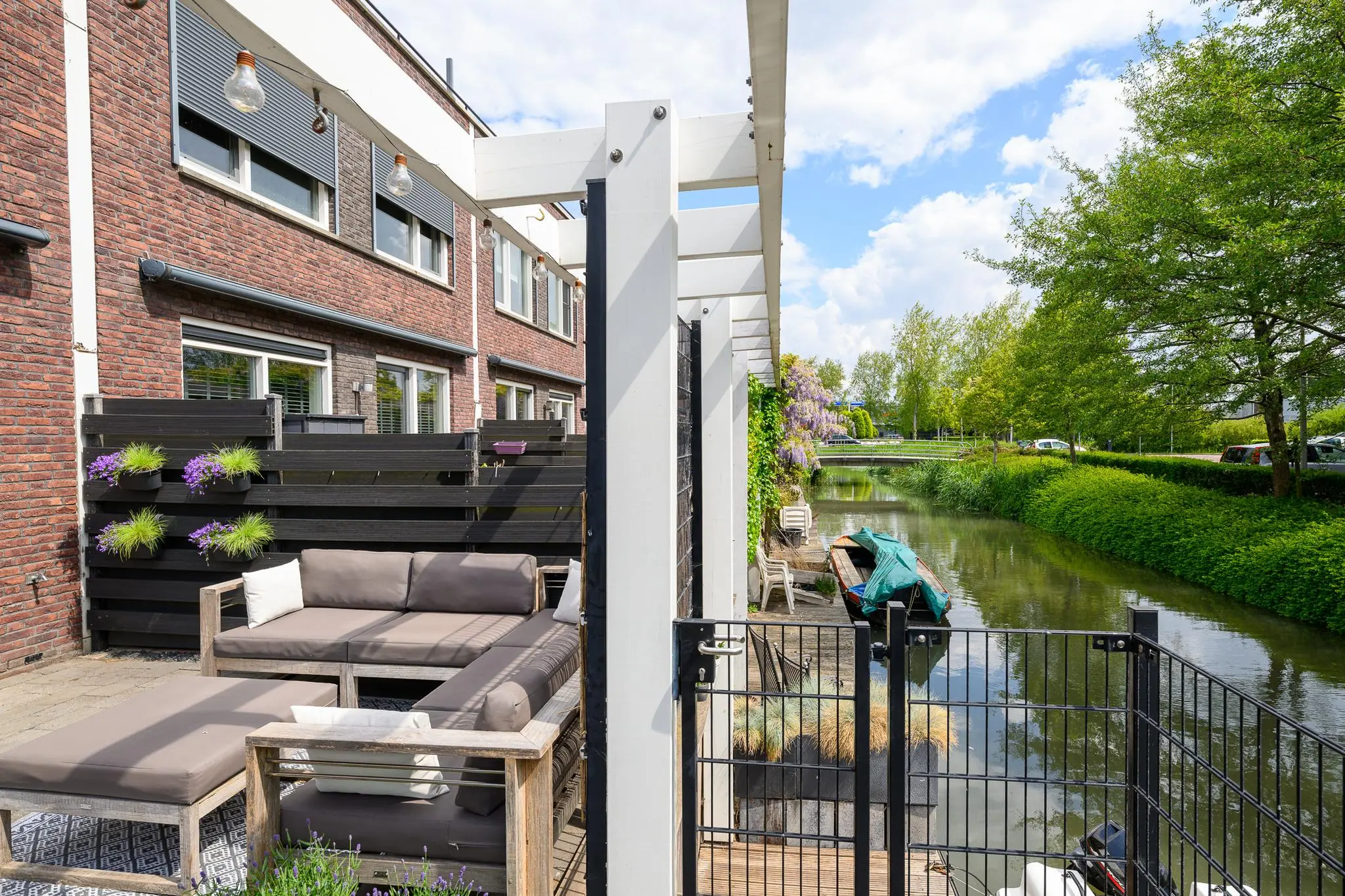 Via de houten schuifpui bereikt u de achtertuin, gelegen op het zuidoosten. De tuin is onderhoudsvriendelijk dankzij de combinatie van tegels en een houten vlonder, die directe toegang biedt tot het aangrenzende vaarwater – een unieke en rustgevende plek aan huis. De sfeervolle pergola en het groene uitzicht creëren een rustgevende en uitnodigende sfeer, perfect om te ontspannen.
