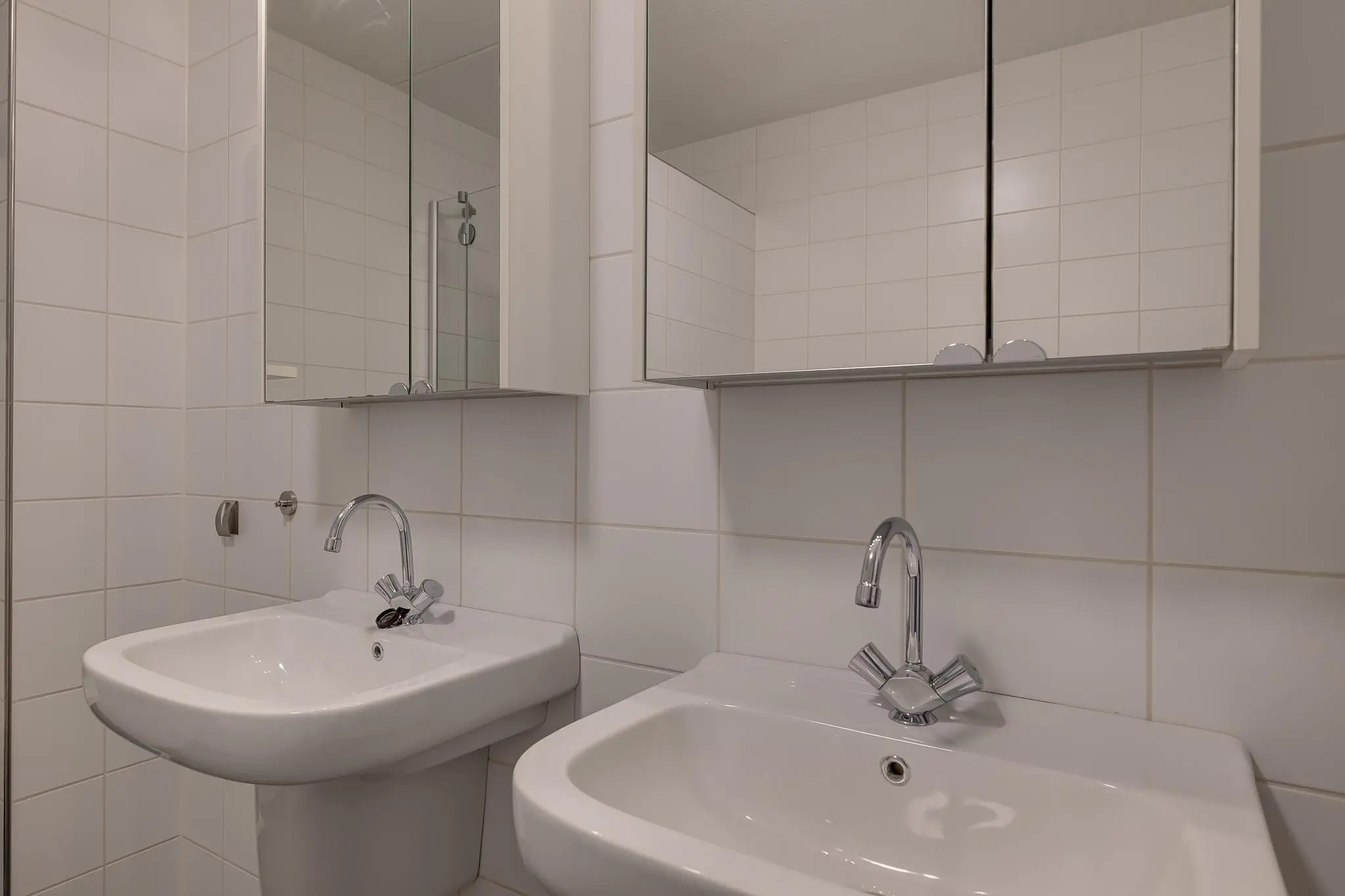 De ruime inpandige badkamer, uitgevoerd in dezelfde stijl als het toilet op de begane grond, is voorzien van een ligbad, een dubbele wastafel en een douche. Het separate toilet, eveneens in de stijl van de andere sanitaire voorzieningen, biedt extra gemak voor het hele gezin.