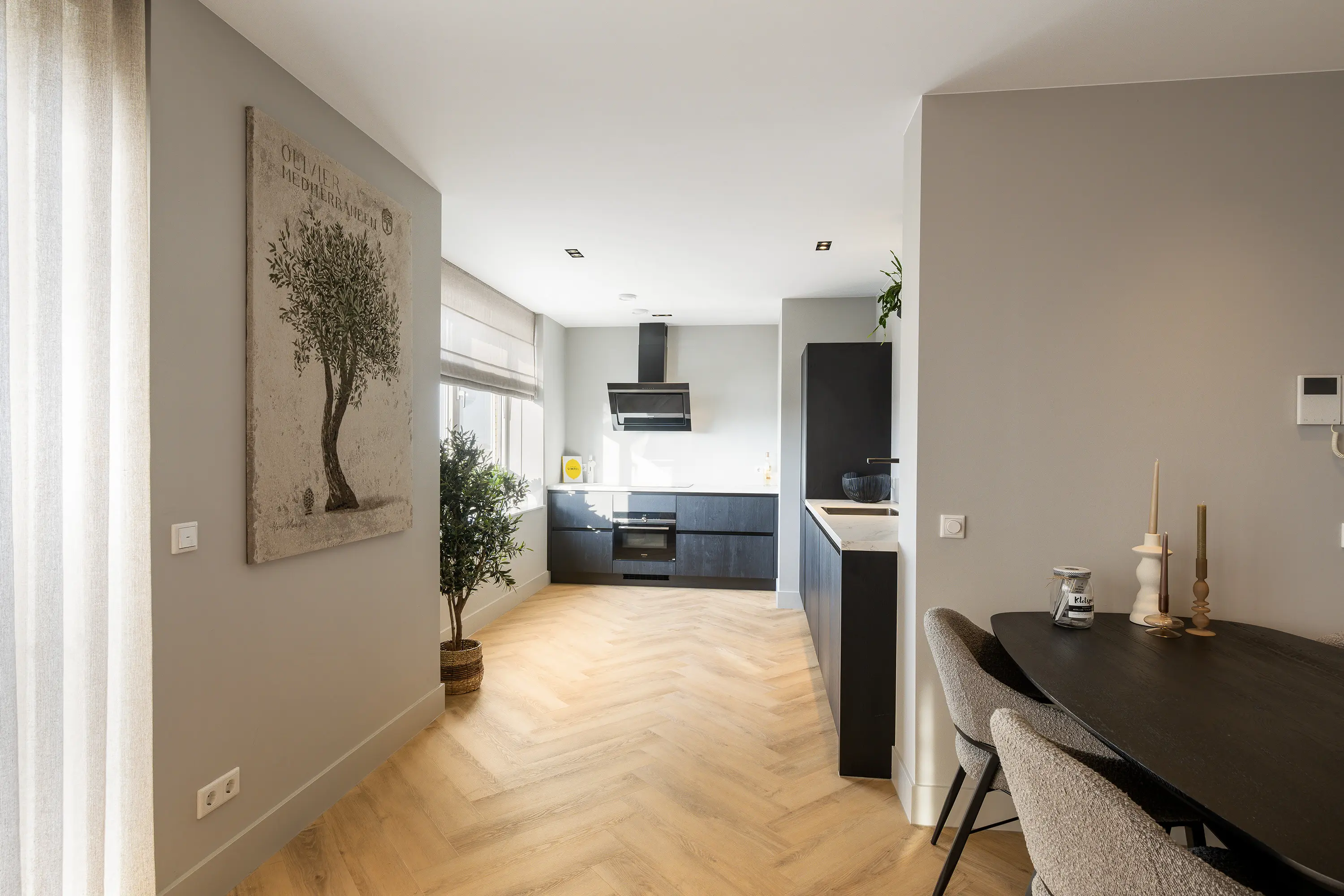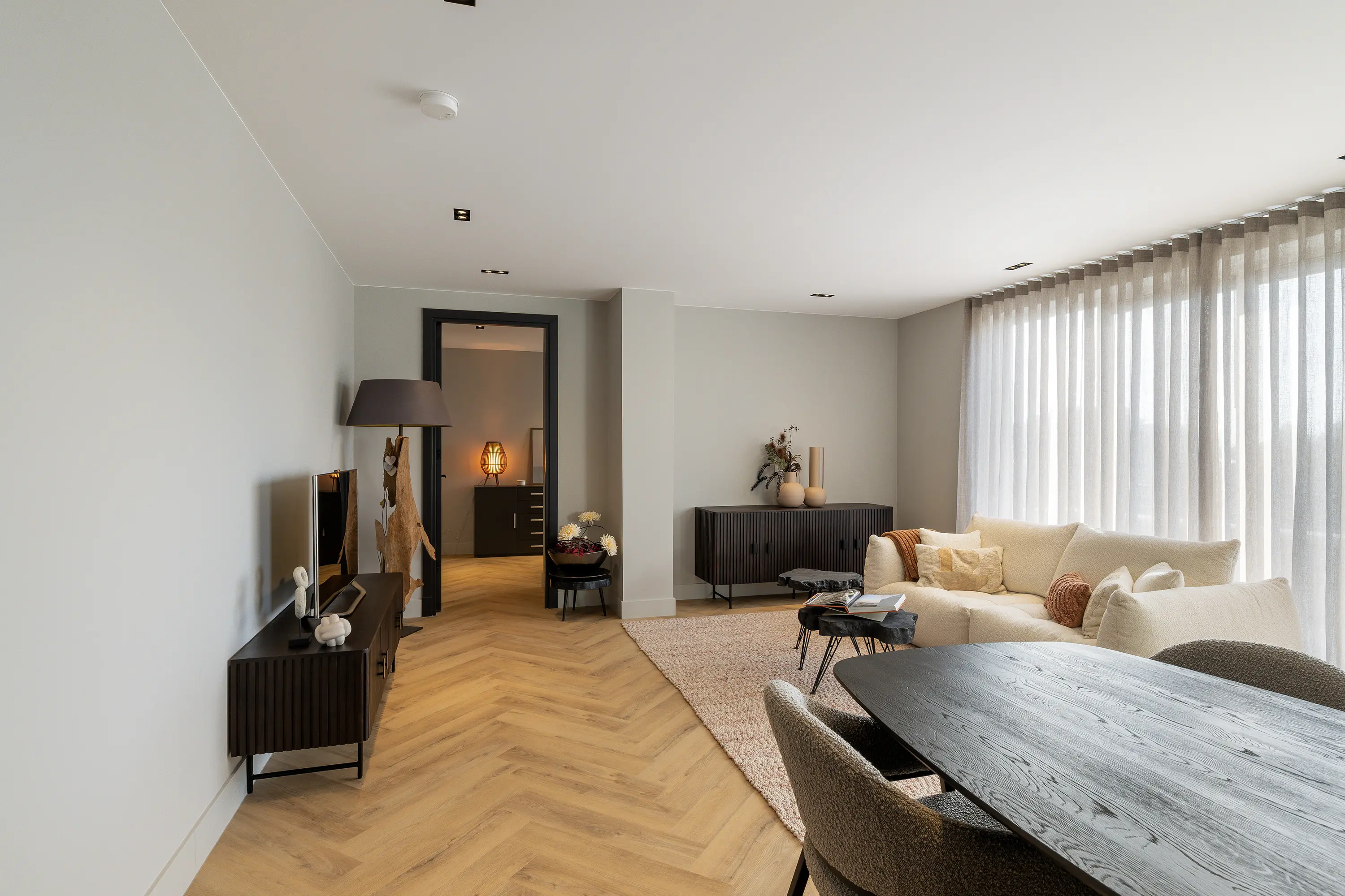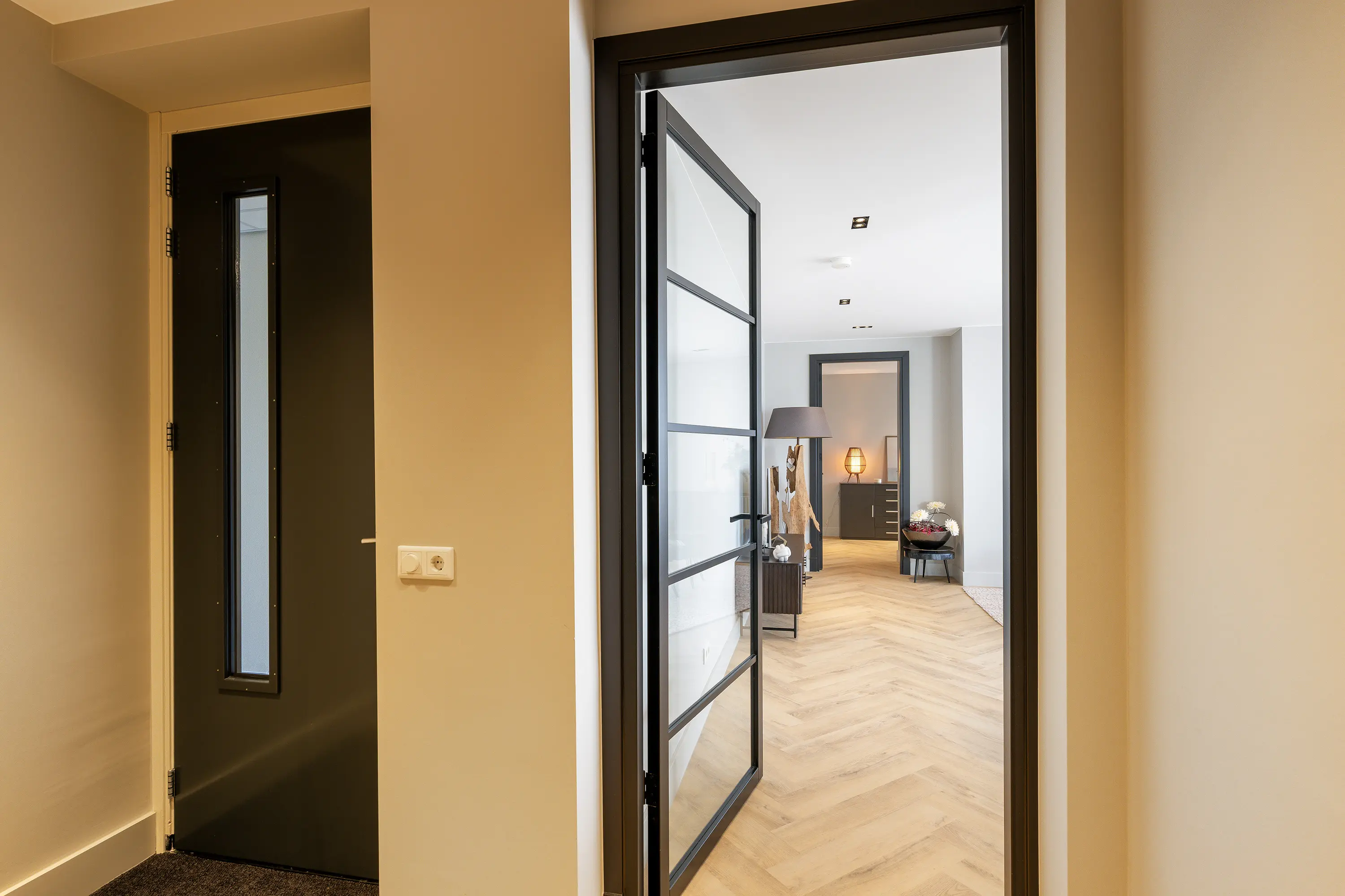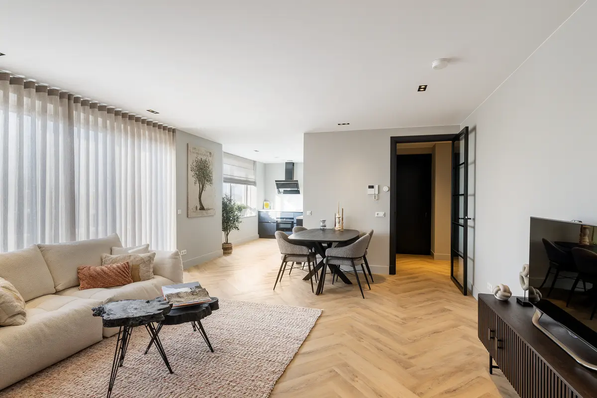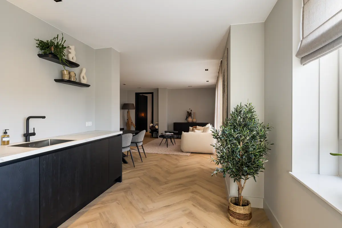 De afwerking van het appartement is stijlvol en consistent. In alle ruimtes ligt een visgraatvloer met vloerverwarming, gecombineerd met hoge plinten en strak gestucte wanden. Het plafond is in het gehele appartement verlaagd en voorzien van inbouwspots. De woonkamer is bereikbaar via een zwarte deur in staallook, wat het interieur een moderne uitstraling geeft.