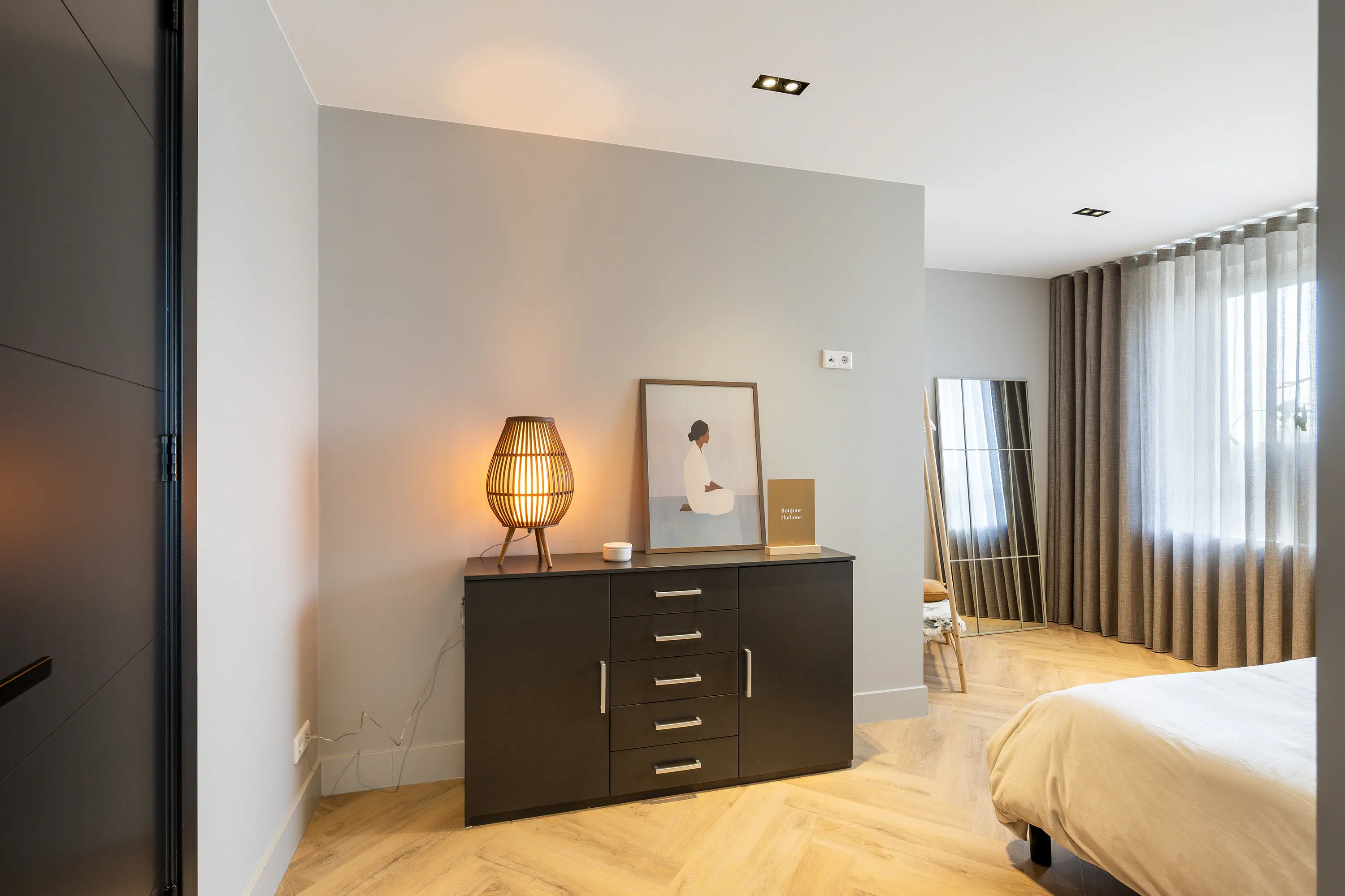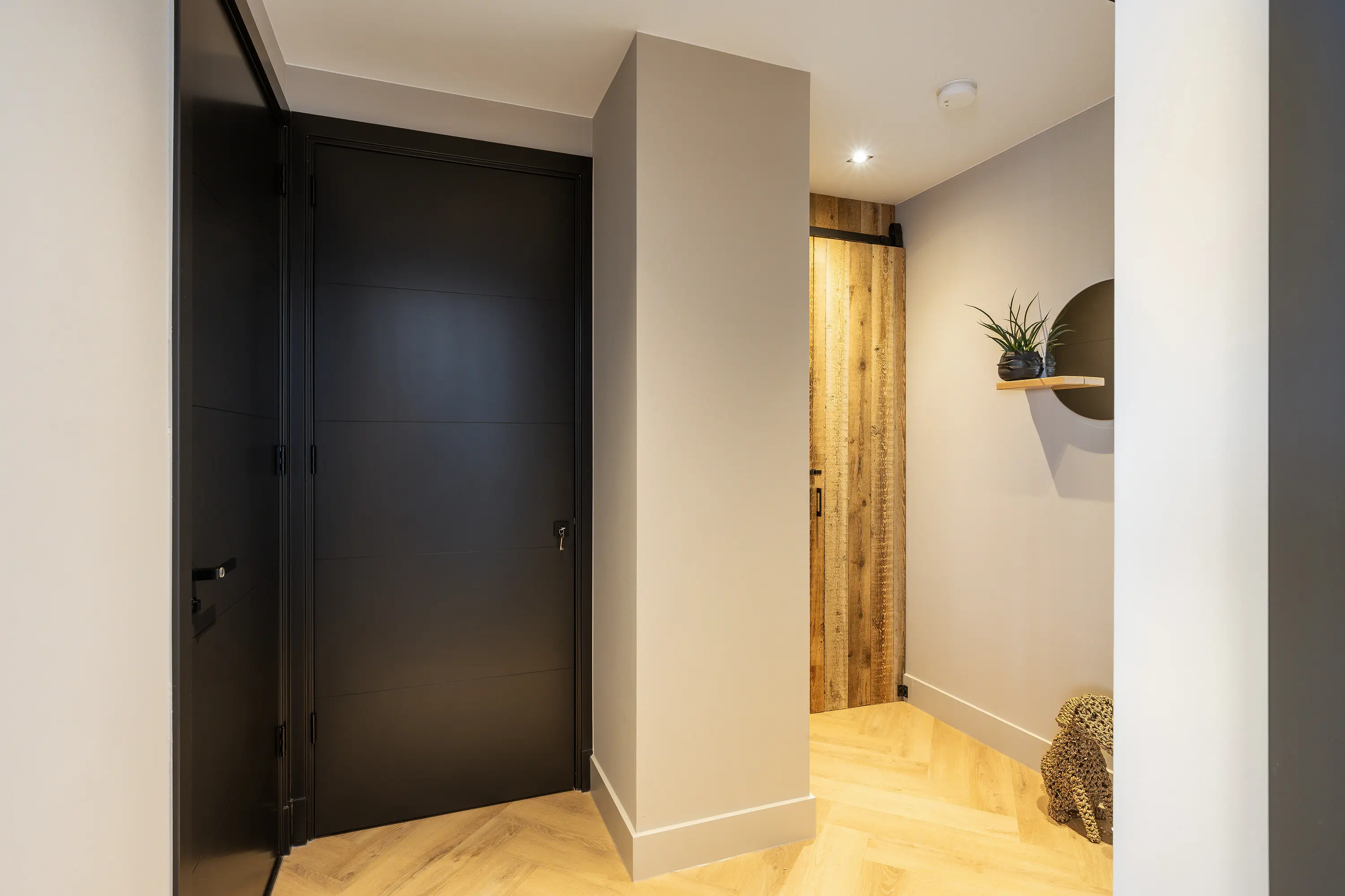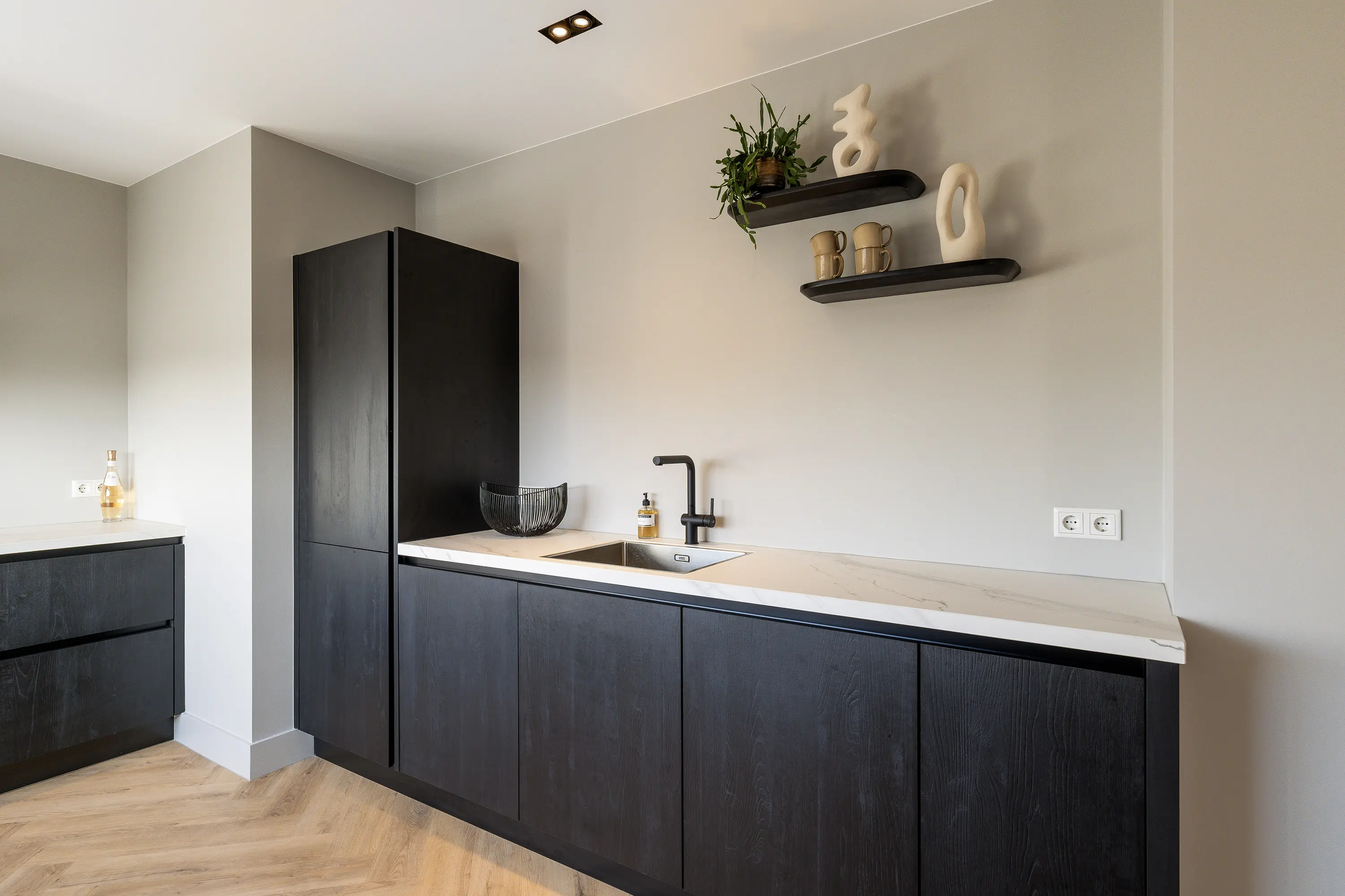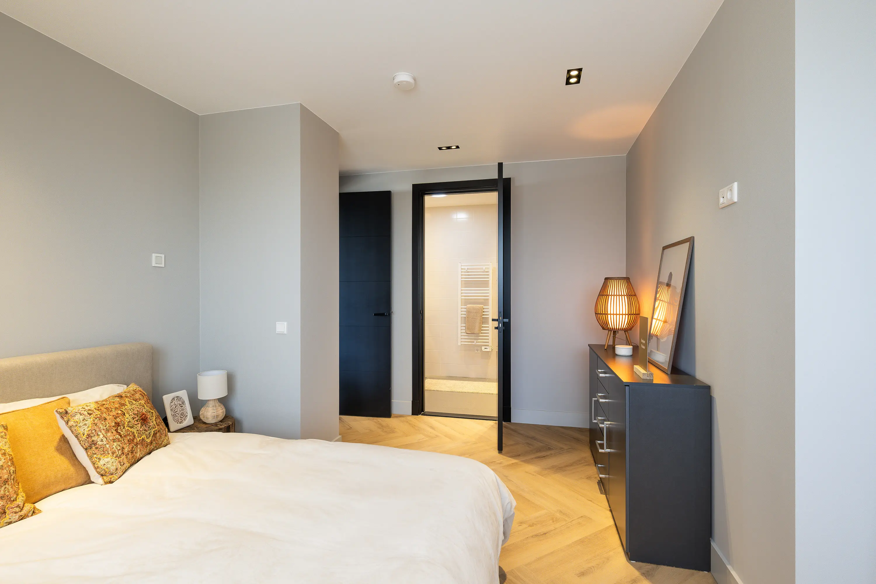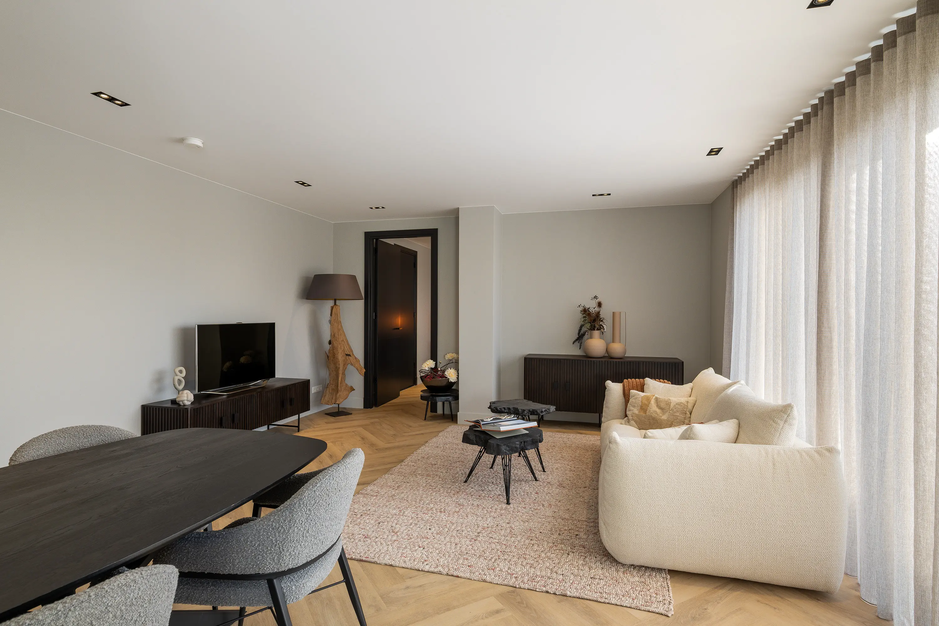 De afwerking van het appartement is stijlvol en consistent. In alle ruimtes ligt een visgraatvloer met vloerverwarming, gecombineerd met hoge plinten en strak gestucte wanden. Het plafond is in het gehele appartement verlaagd en voorzien van inbouwspots. De woonkamer is bereikbaar via een zwarte deur in staallook, wat het interieur een moderne uitstraling geeft.