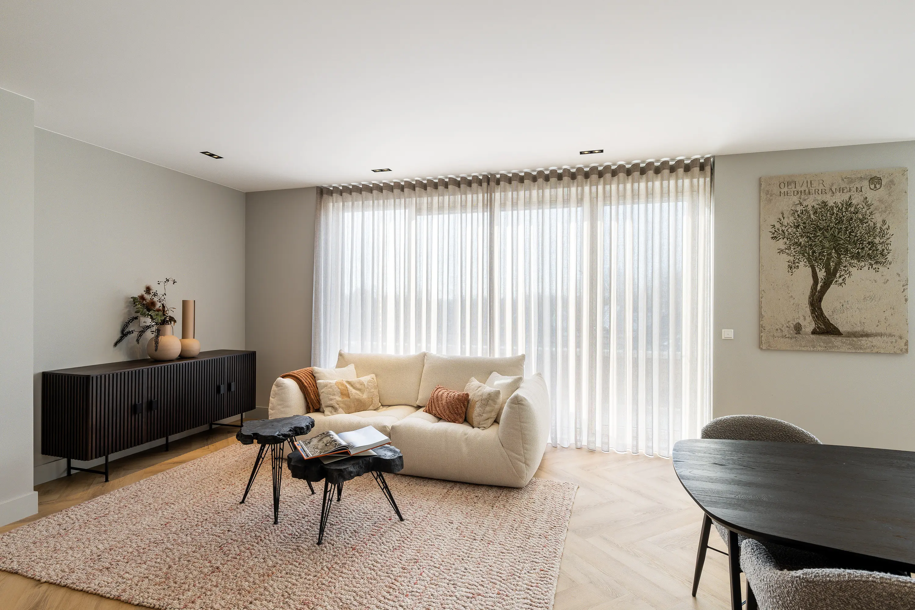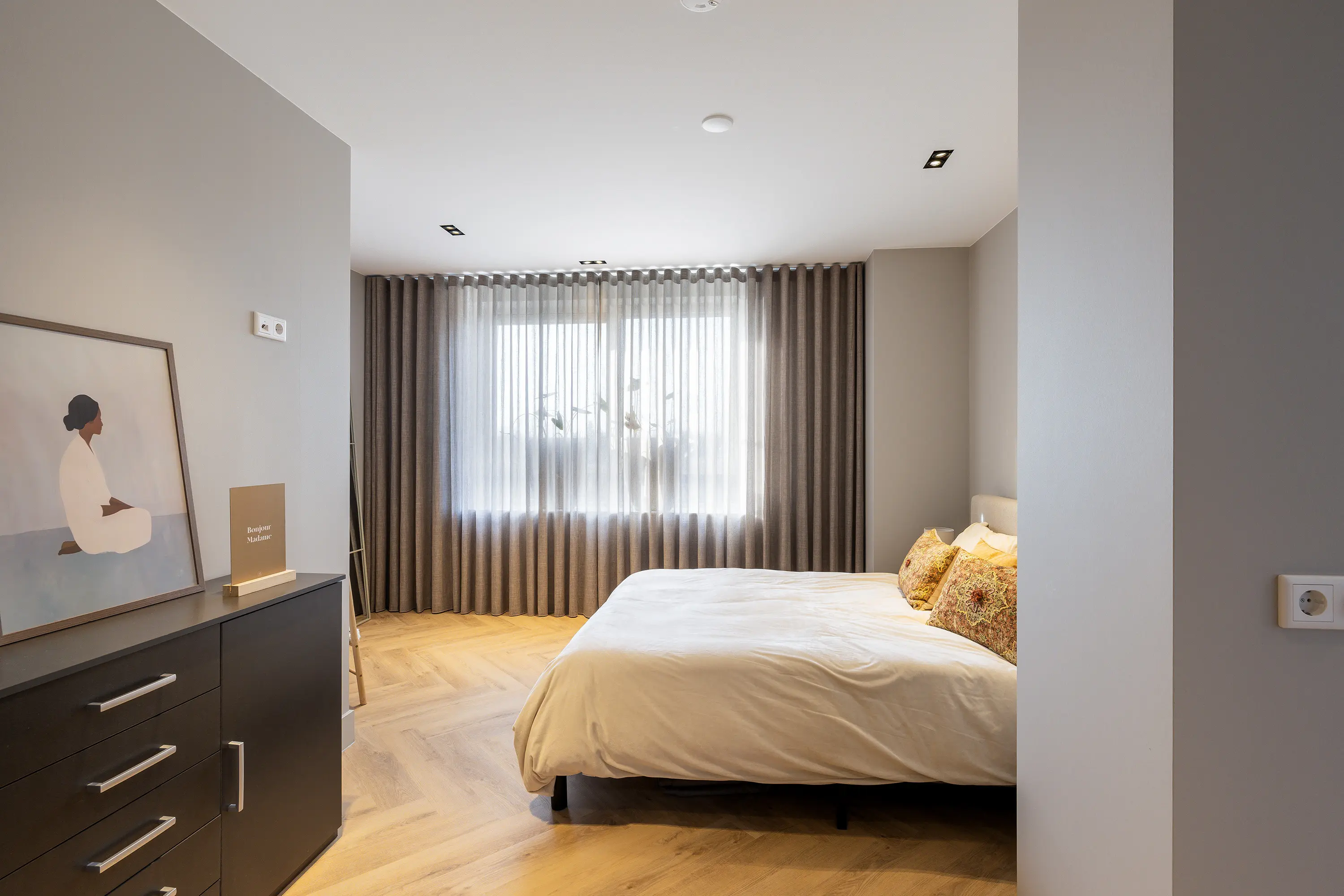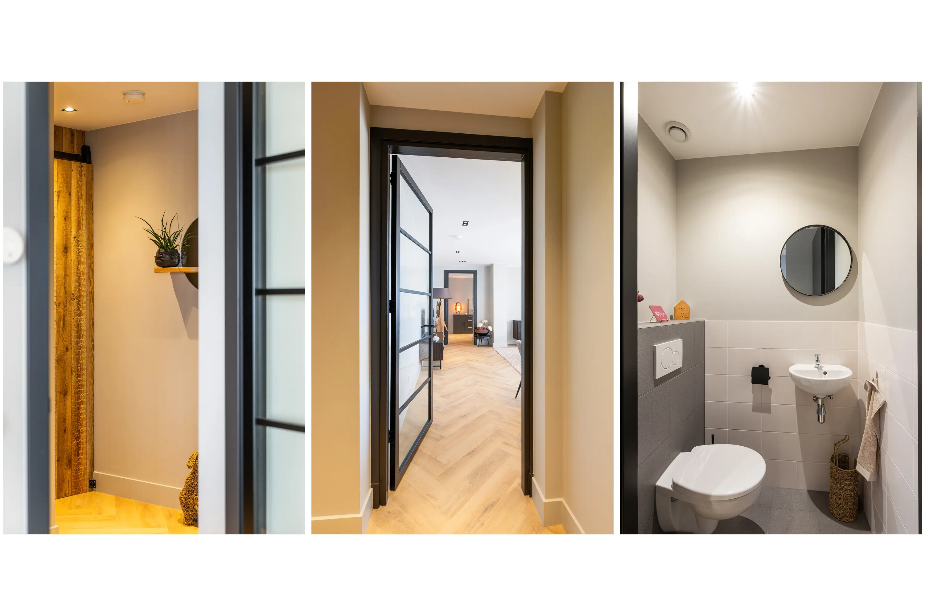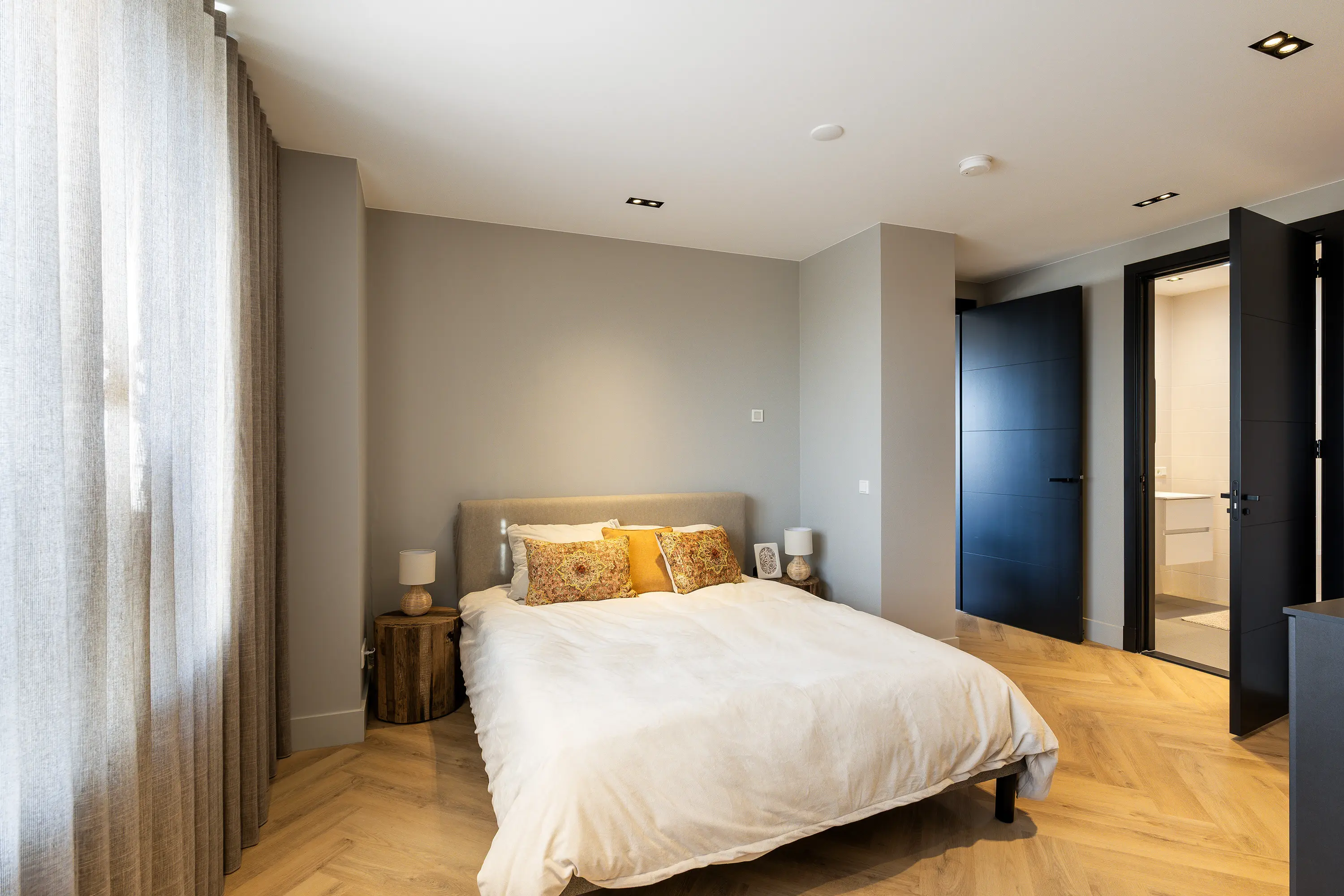 De afwerking van het appartement is stijlvol en consistent. In alle ruimtes ligt een visgraatvloer met vloerverwarming, gecombineerd met hoge plinten en strak gestucte wanden. Het plafond is in het gehele appartement verlaagd en voorzien van inbouwspots. De woonkamer is bereikbaar via een zwarte deur in staallook, wat het interieur een moderne uitstraling geeft.