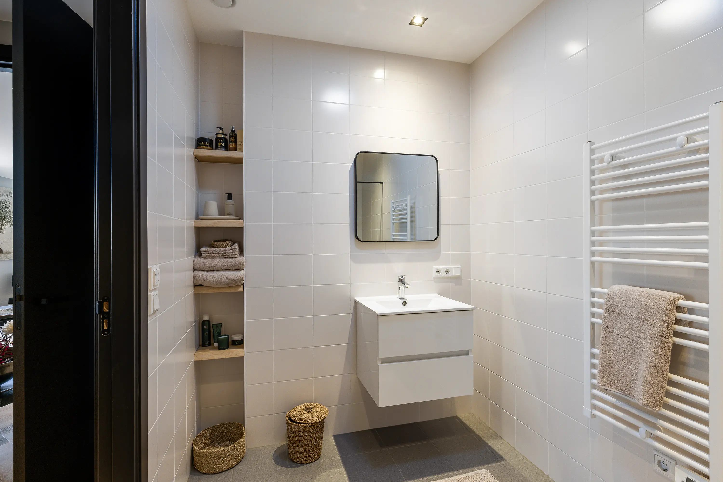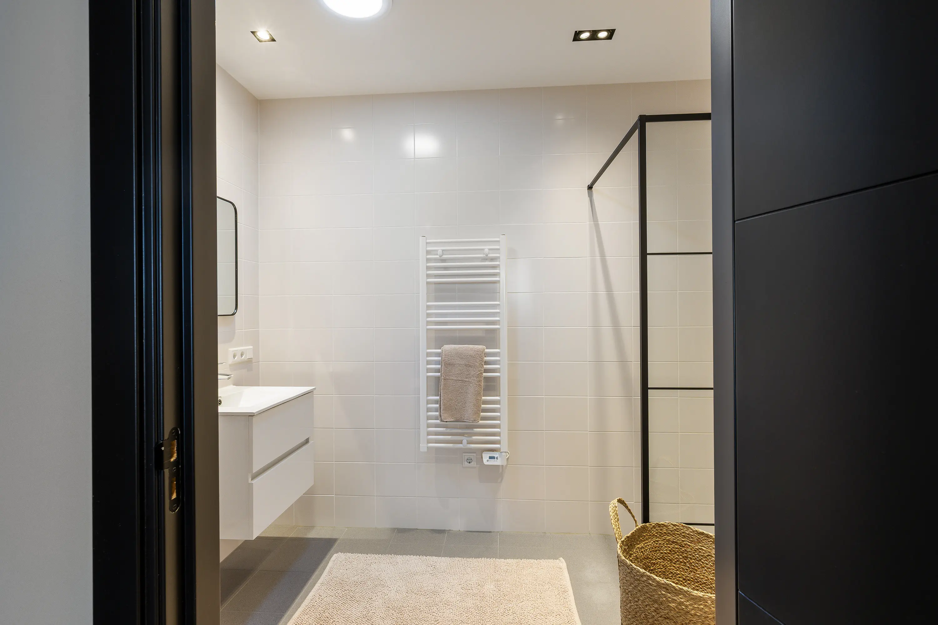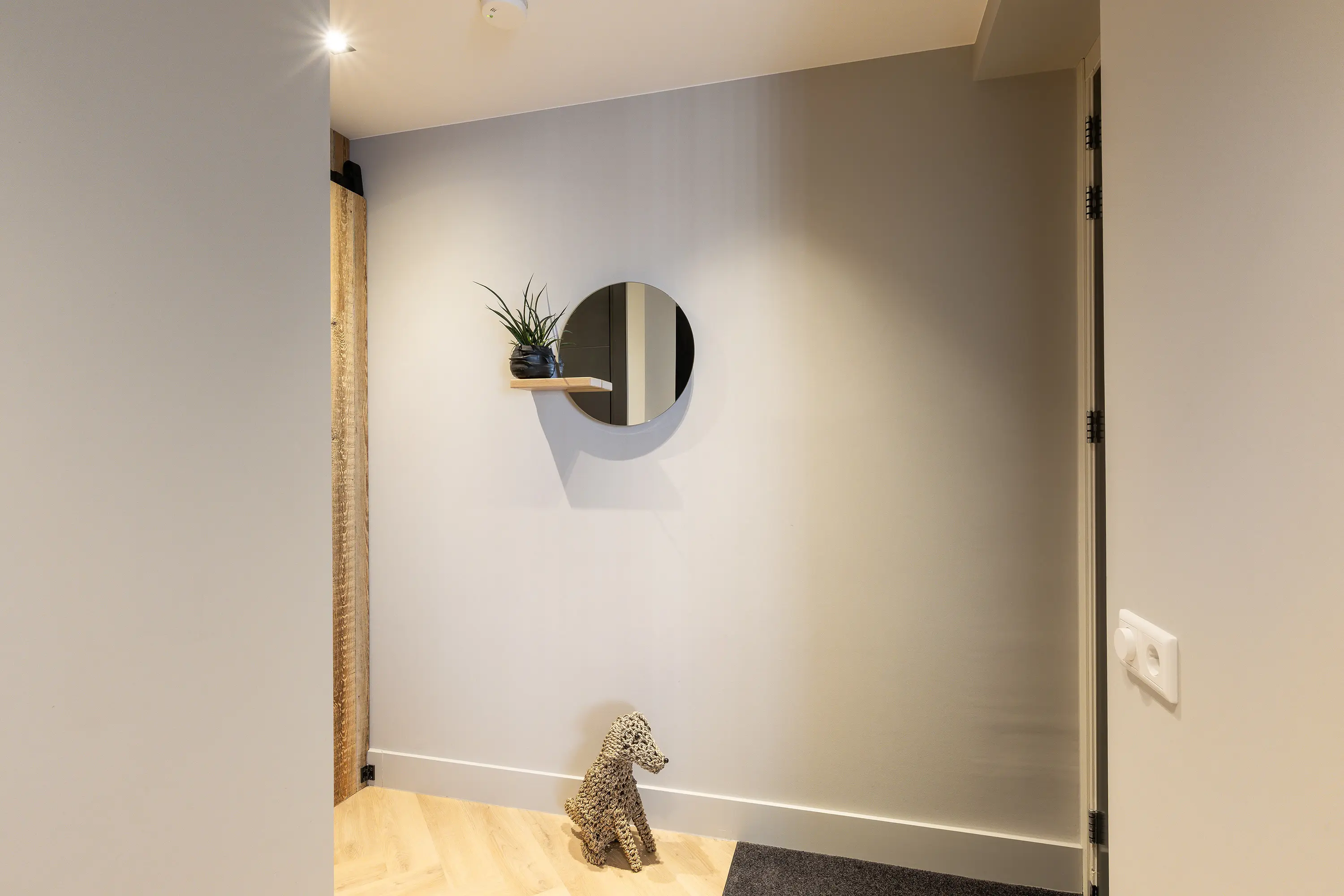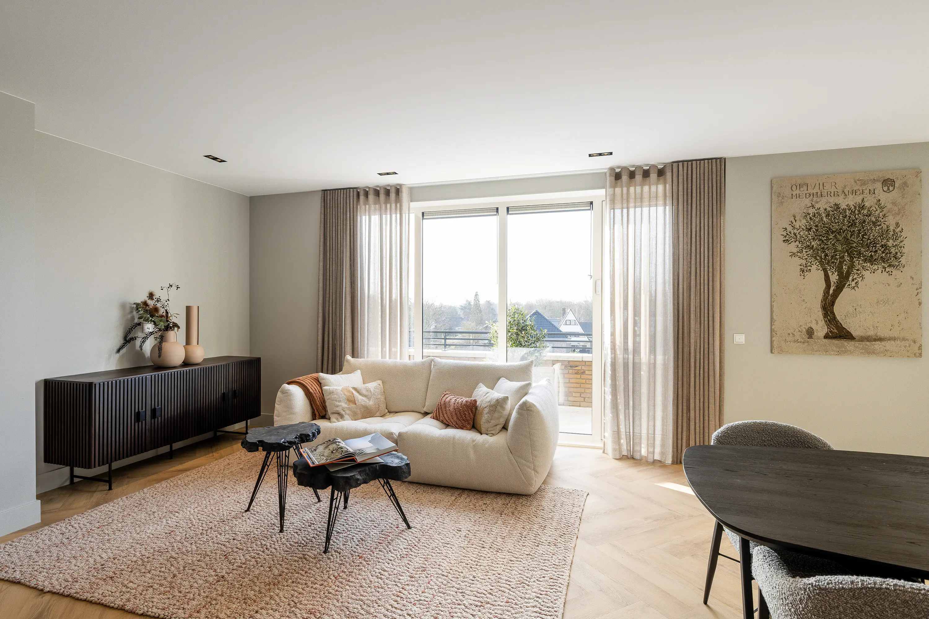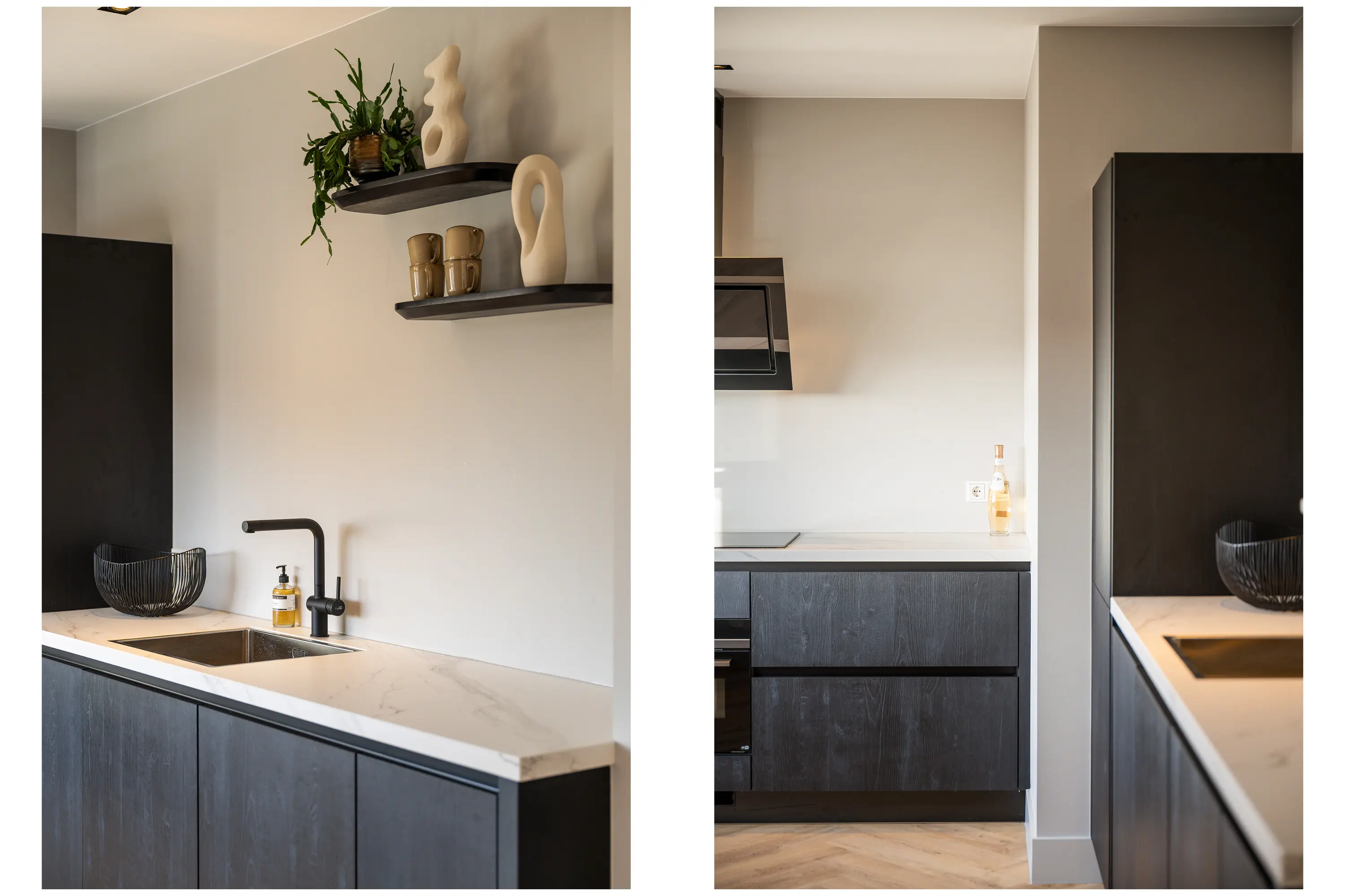 De afwerking van het appartement is stijlvol en consistent. In alle ruimtes ligt een visgraatvloer met vloerverwarming, gecombineerd met hoge plinten en strak gestucte wanden. Het plafond is in het gehele appartement verlaagd en voorzien van inbouwspots. De woonkamer is bereikbaar via een zwarte deur in staallook, wat het interieur een moderne uitstraling geeft.