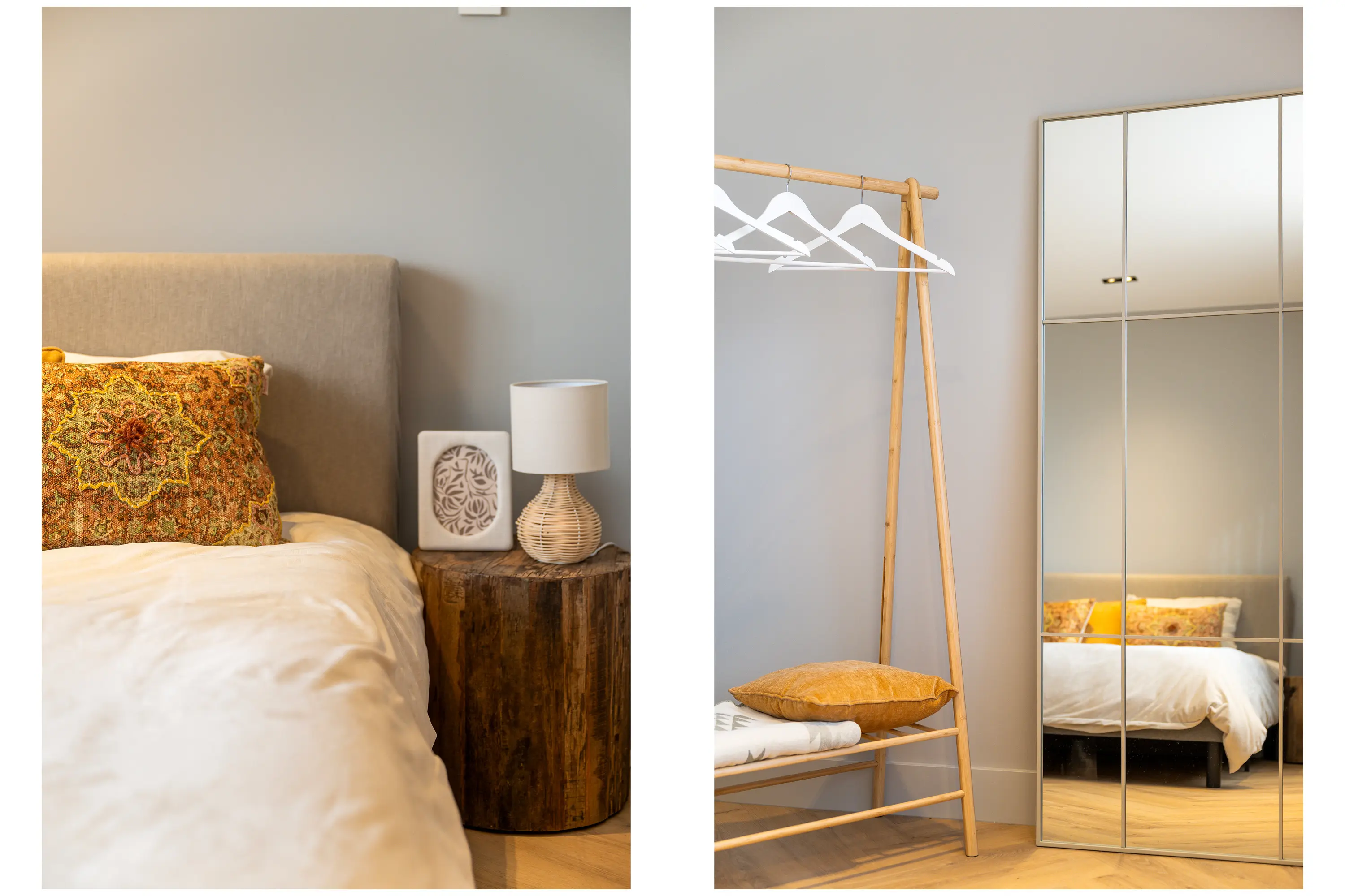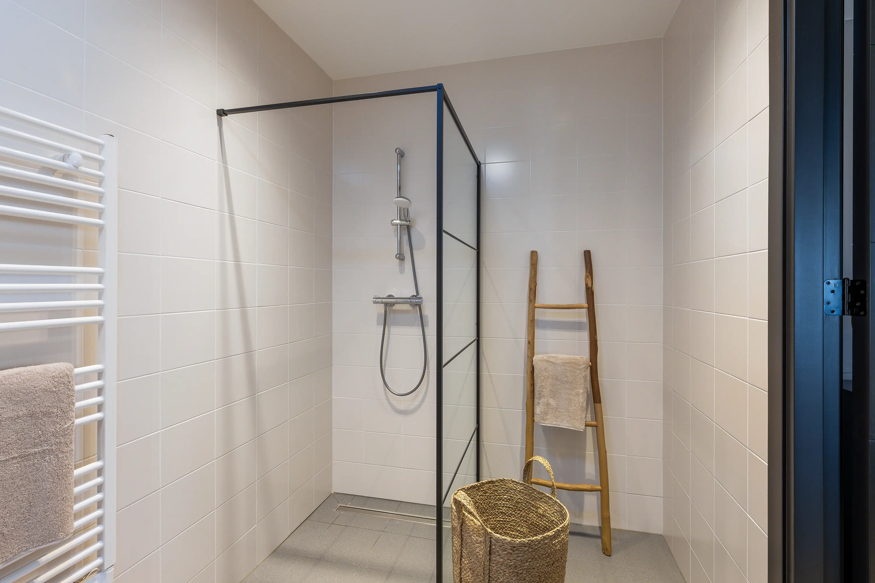 Aan de achterzijde van het appartement bevindt zich de royale slaapkamer, met direct aangrenzend de badkamer. De badkamer is neutraal afgewerkt en voorzien van een inloopdouche, wastafel, elektrische radiator en een lichttube in het plafond.