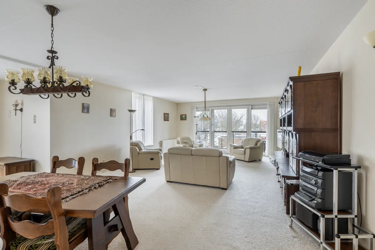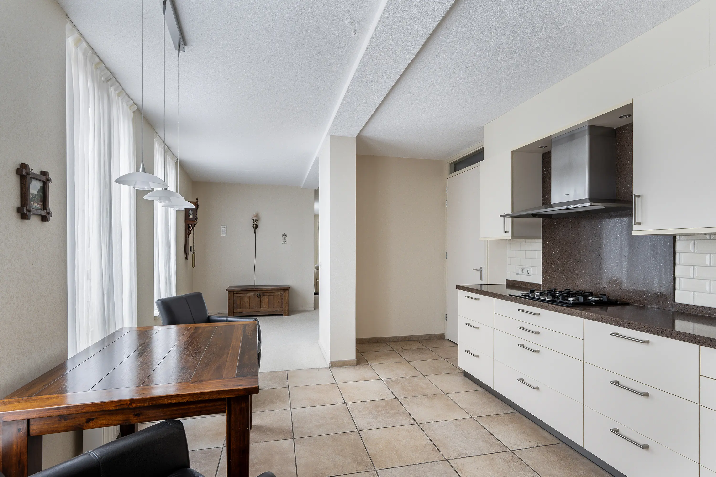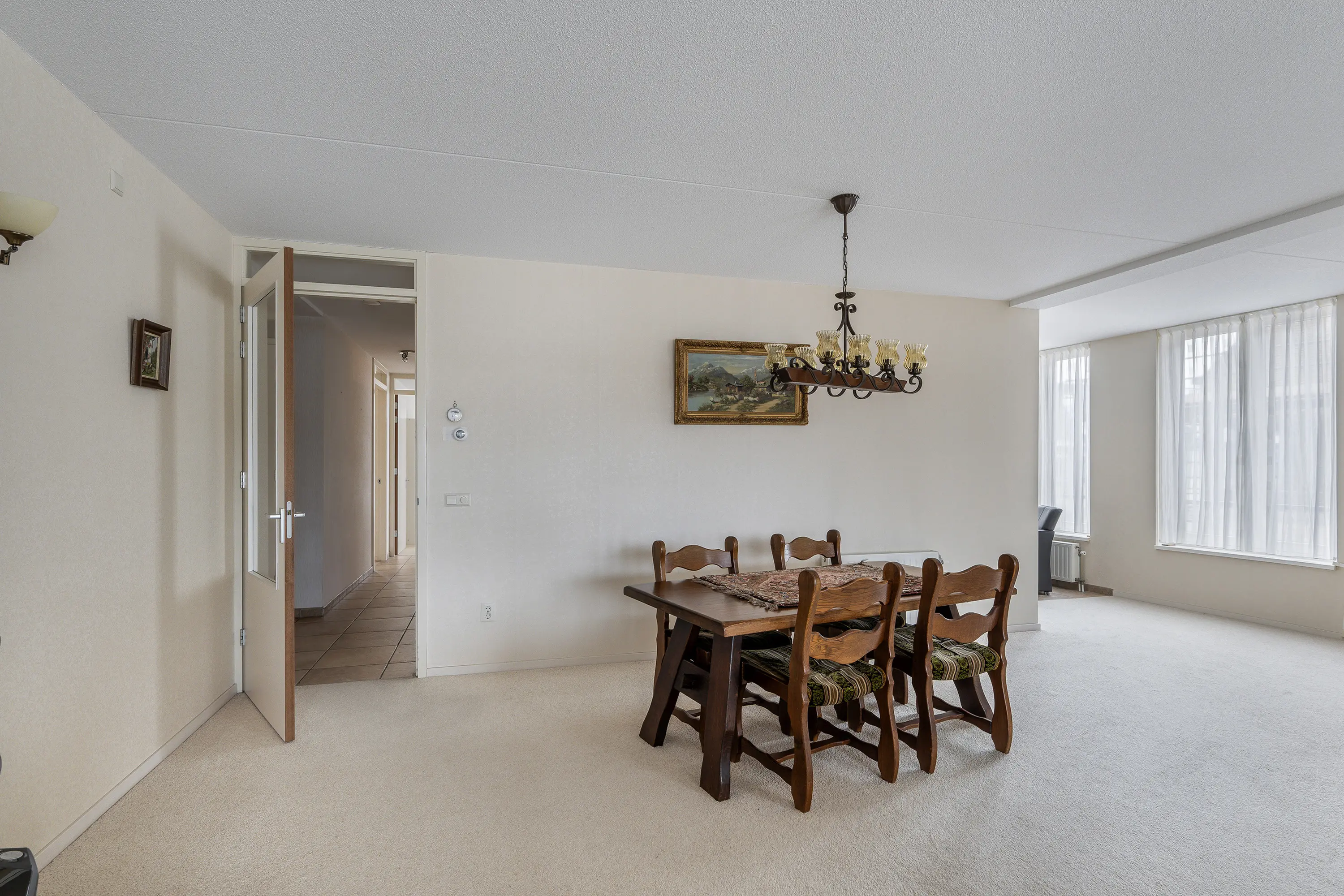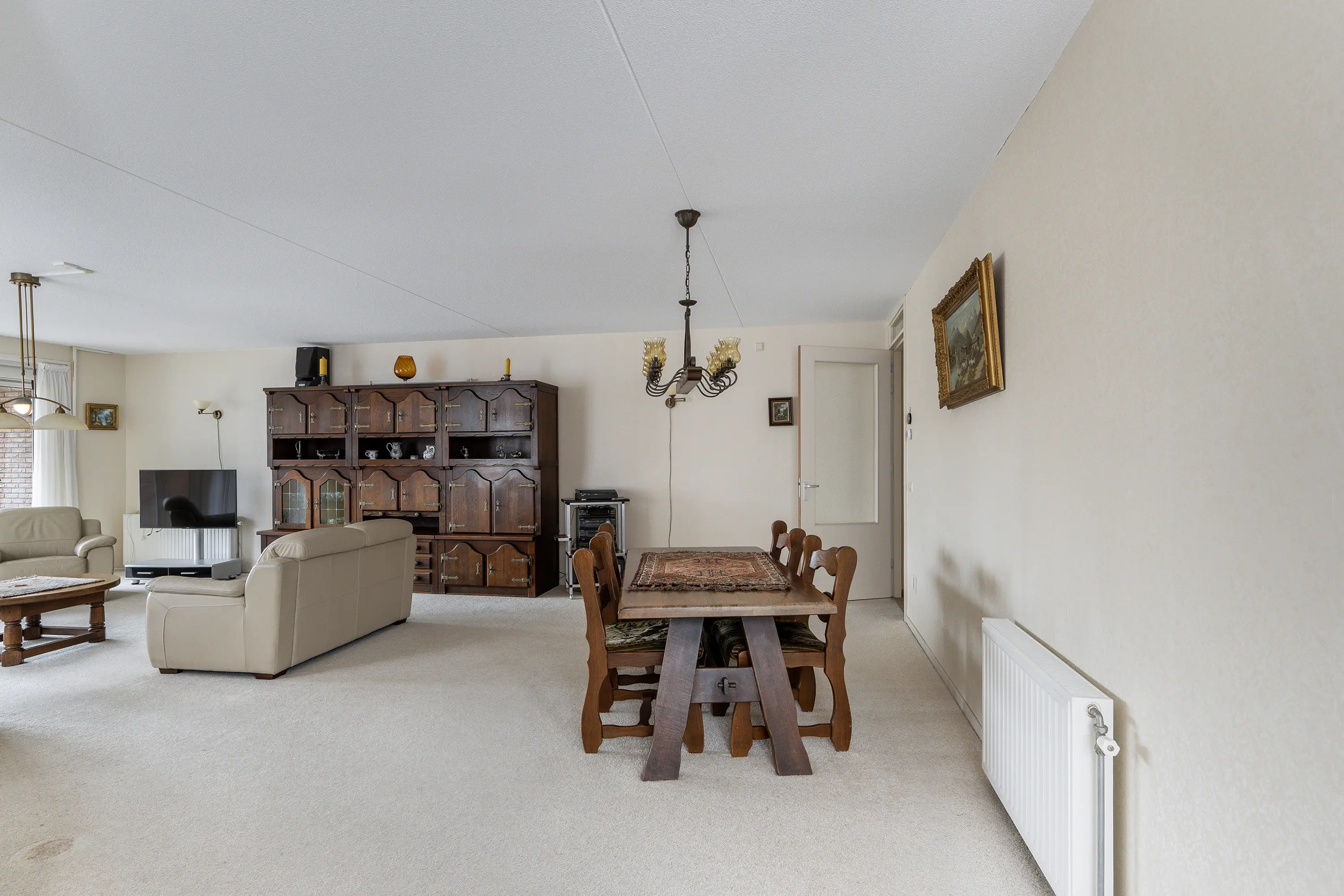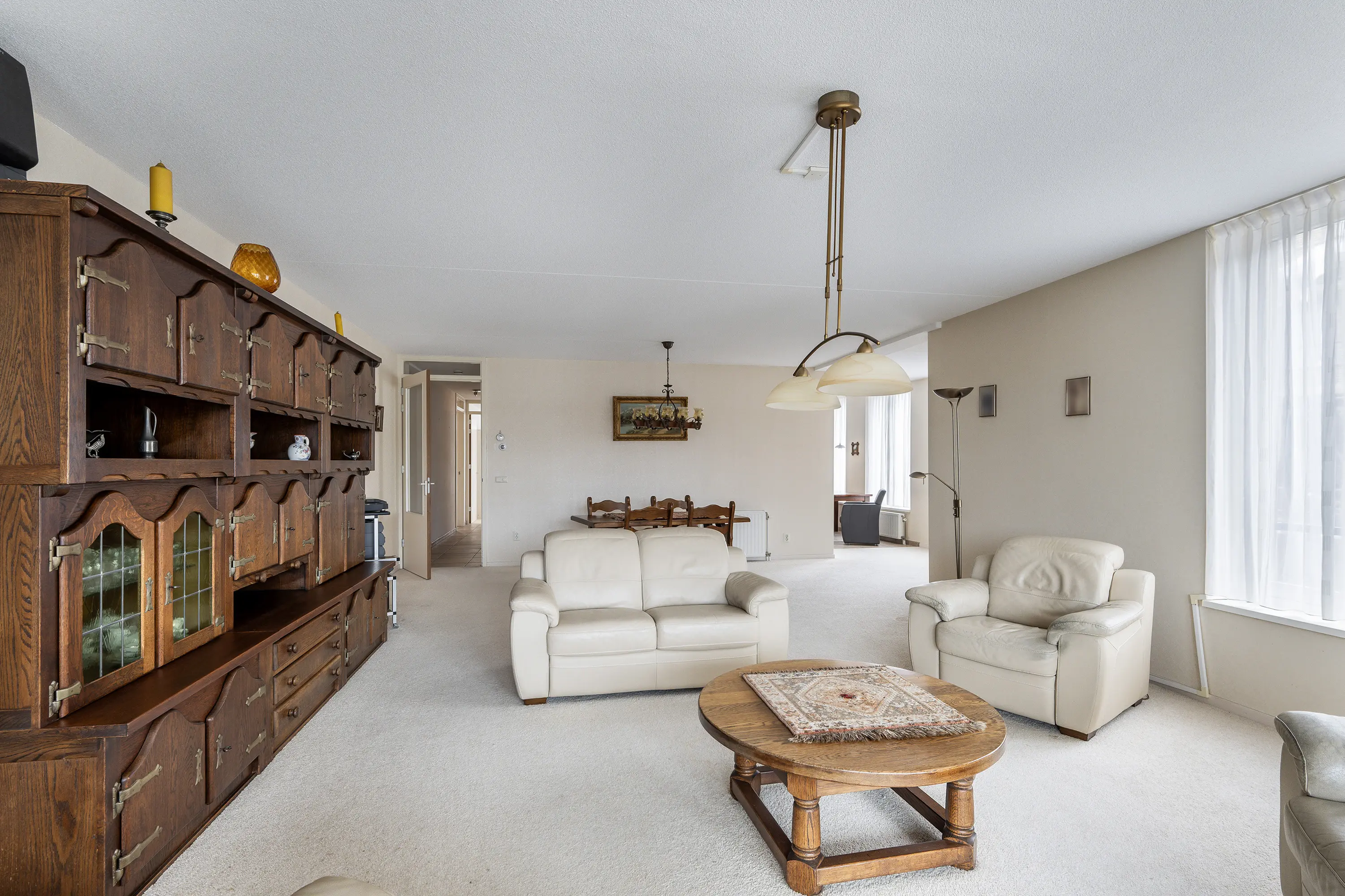 Kenmerkend voor de woonkamer is de lichtinval, mede door de grote raampartij met schuifpui aan de balkonzijde maar zeker ook door de diverse raampartijen aan de zijkant. Het licht, de afmeting en de lichte kleuren op de strak afgewerkte wanden maken de woonkamer heel ruimtelijk.