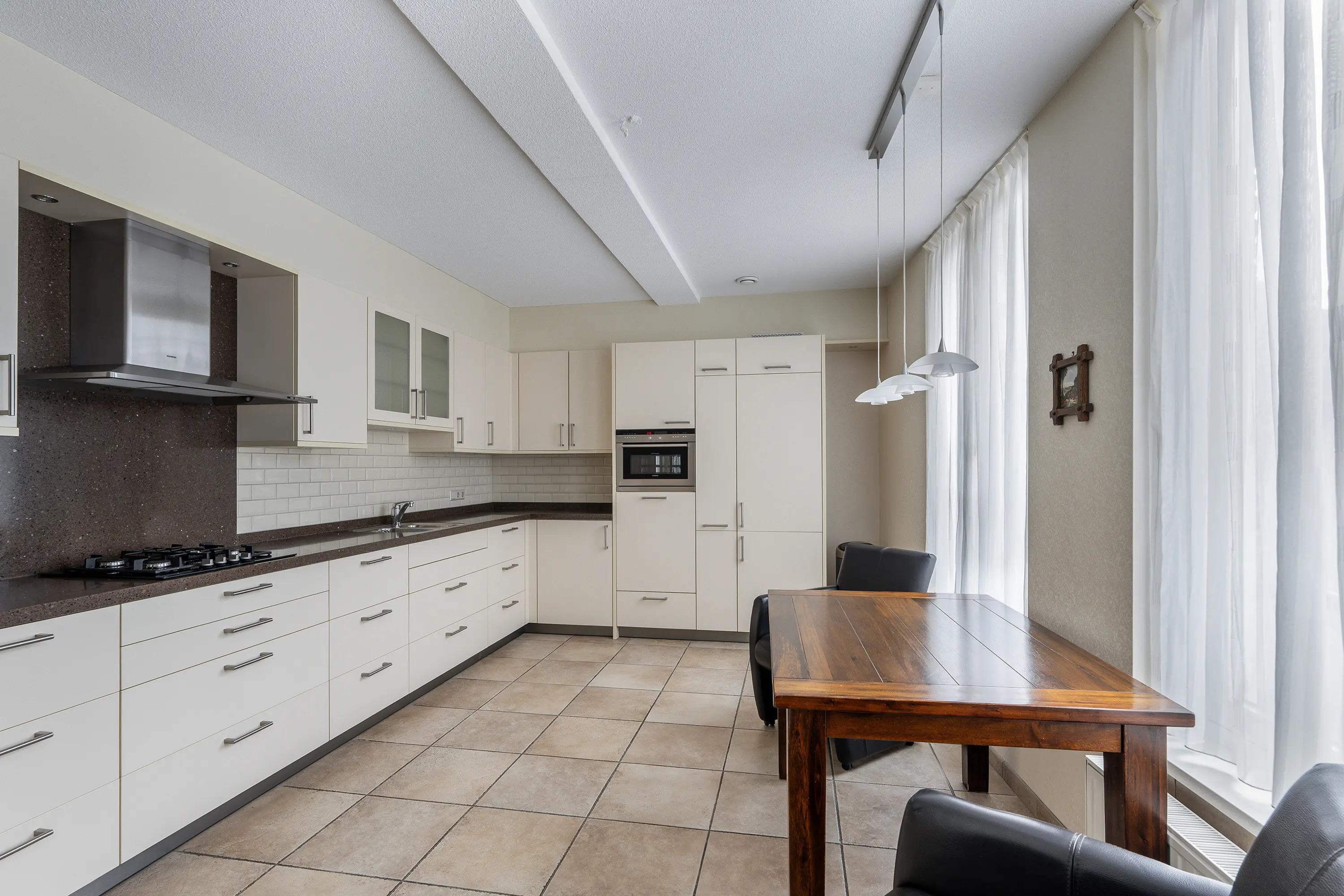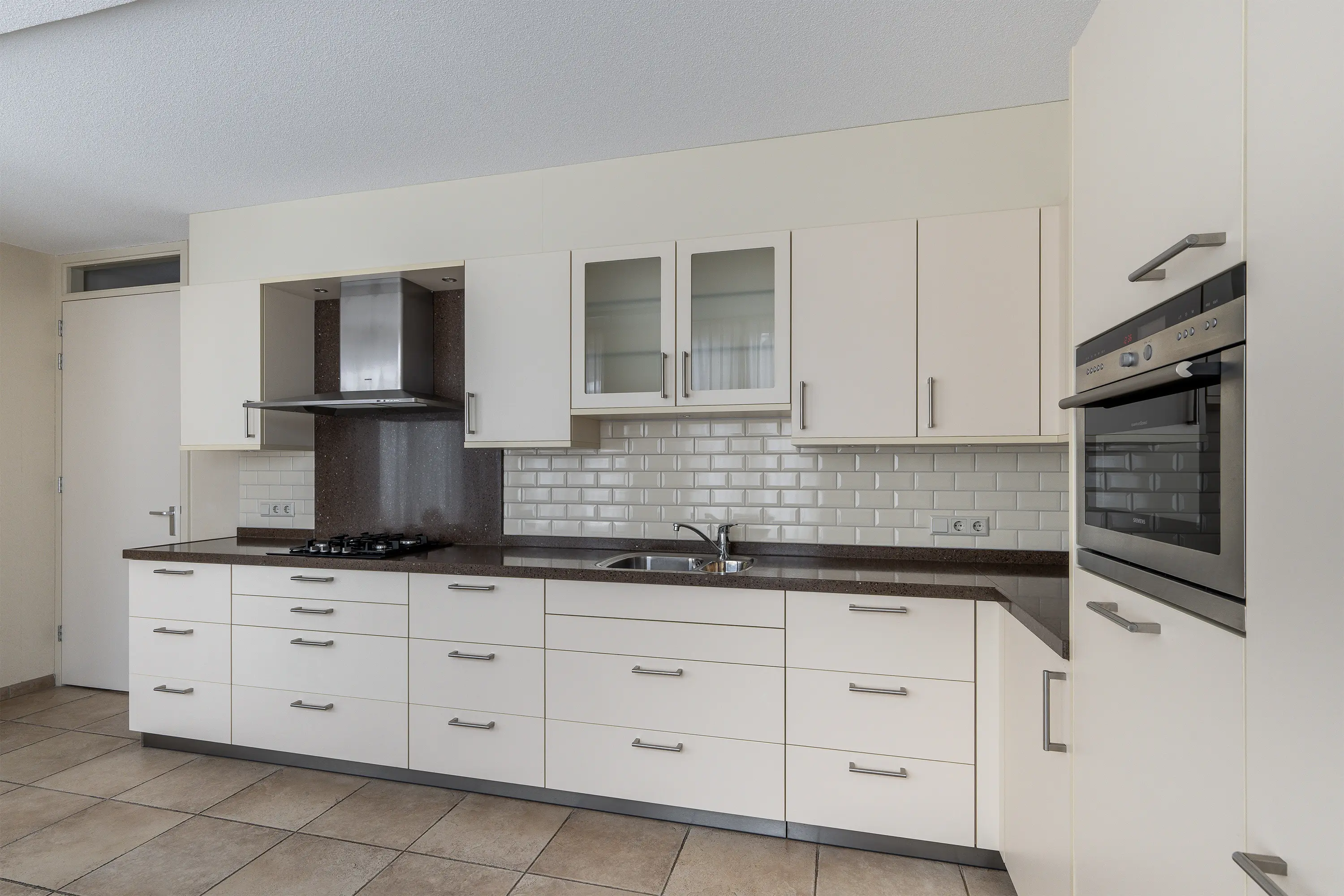 In de L-opstelling is niet alleen voldoende bergruimte in kasten en lades, er is voldoende inbouwapparatuur voor de kookliefhebber om heerlijke maaltijden te bereiden. Naast het 4-pits gasfornuis met RVS afzuigkap, is er een anderhalve spoelbak met mengkraan, combi-oven, koelkast, vriezer en vaatwasser.