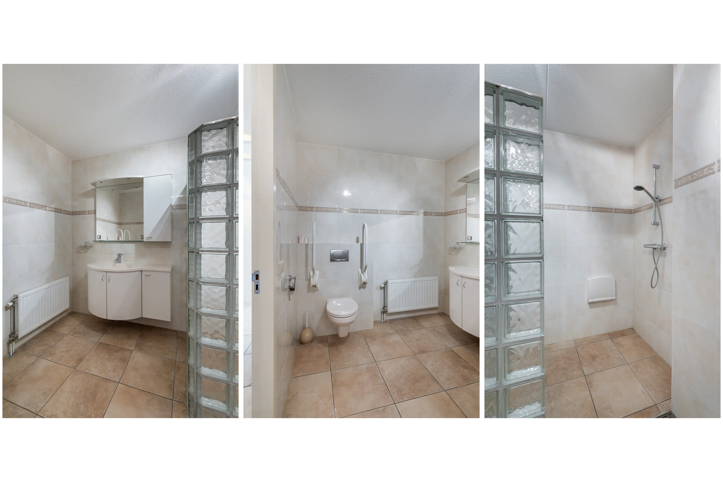De volledig betegelde badkamer in lichte kleurstelling is ingericht met inloopdouche, wastafelmeubel en tweede toilet.