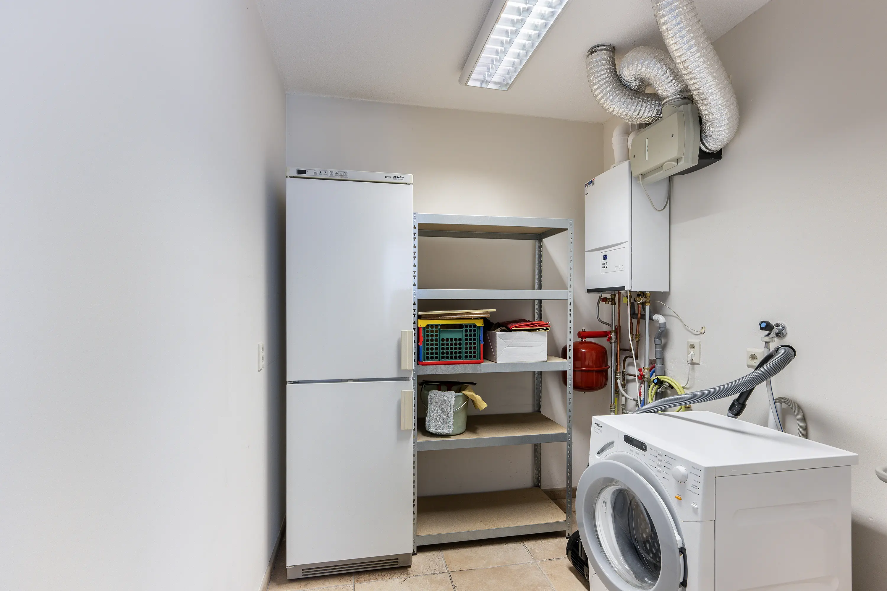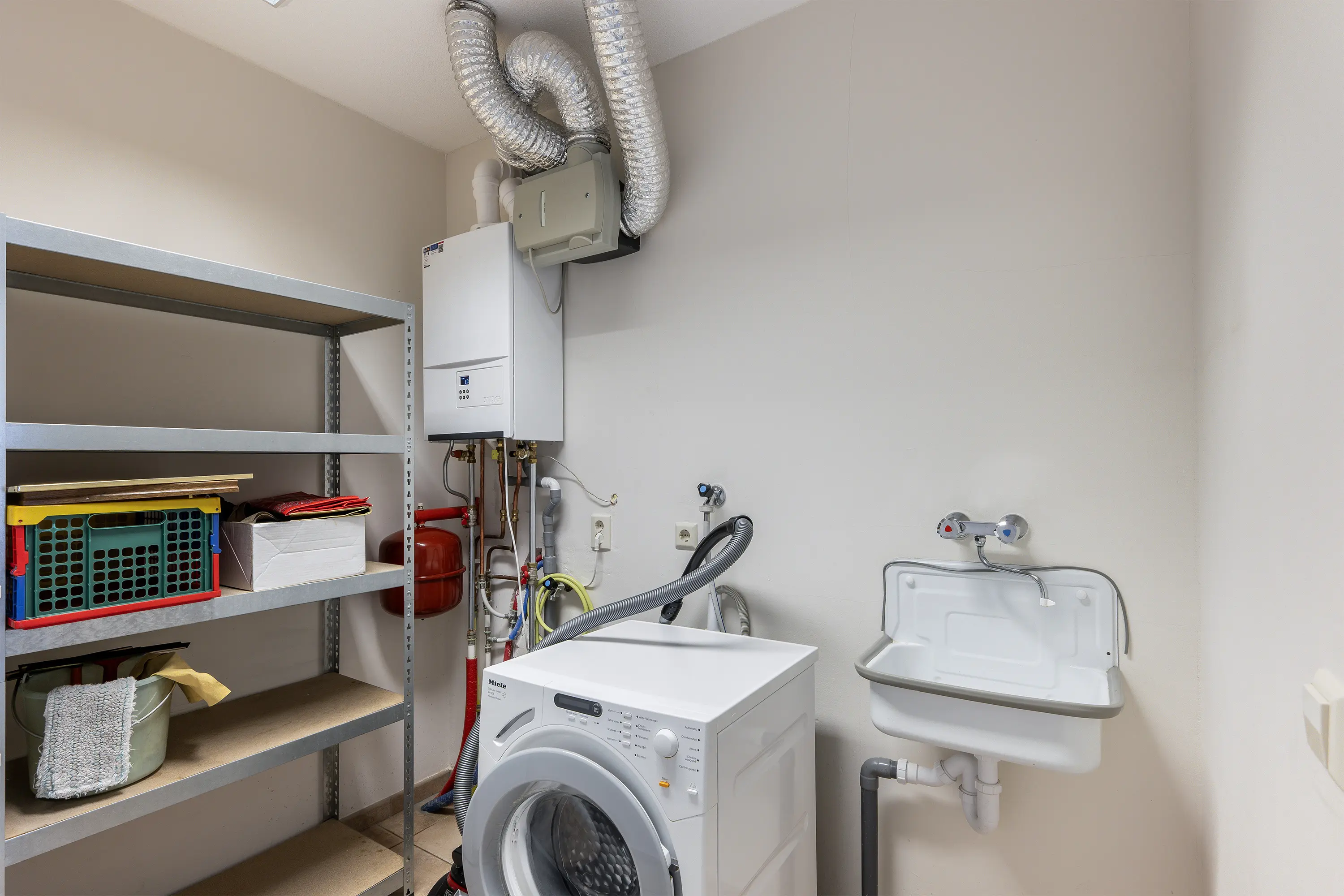 Een deur leidt naar een praktische wasruimte, waar niet alleen de aansluiting voor wasmachine, een spoelbak en de opstelplaats voor de cv-ketel is gesitueerd, er is tevens extra opbergruimte.