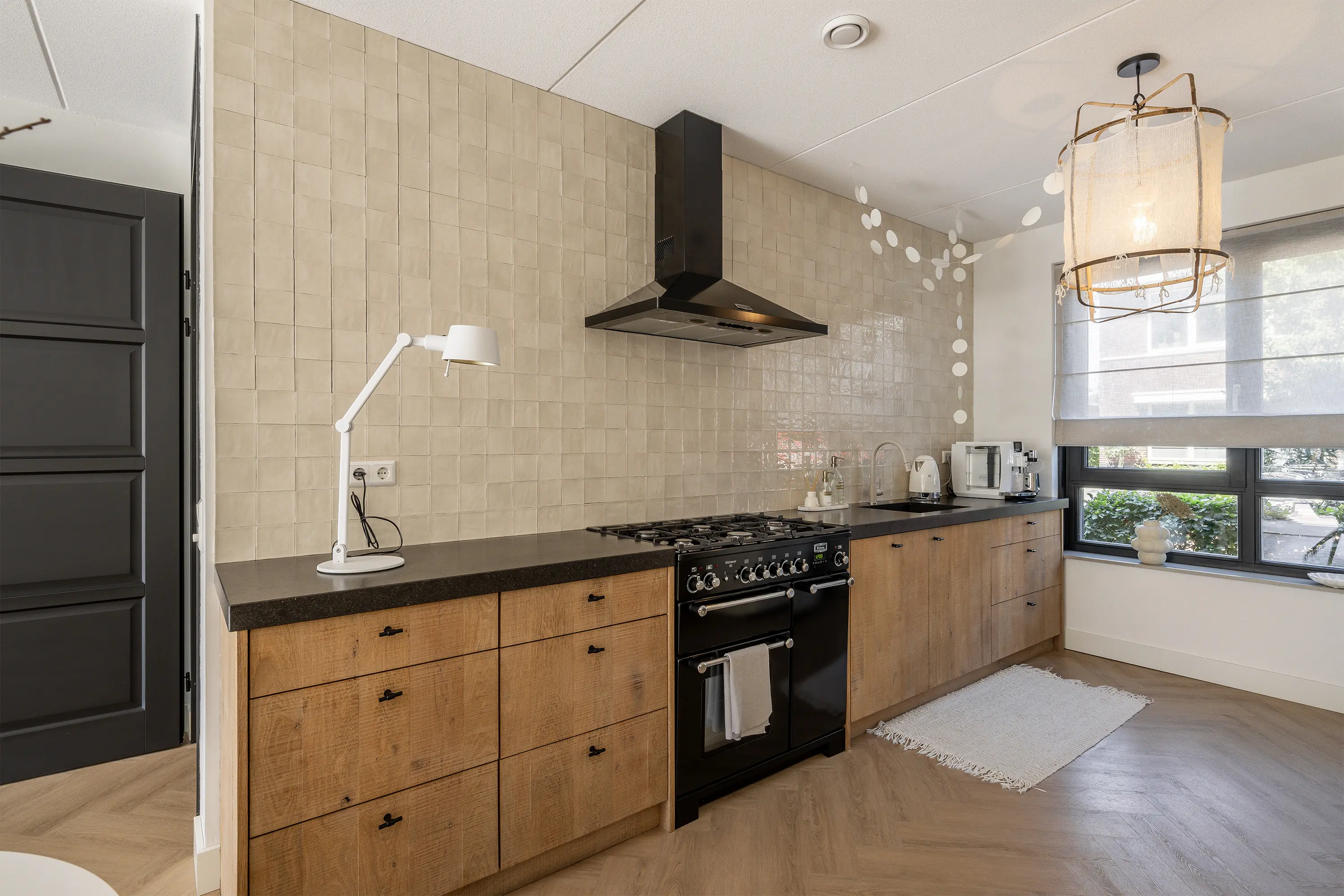 In de woonkamer valt meteen de royale ruimte op, die door de grote ramen aan de tuinzijde volop natuurlijk licht ontvangt. Openslaande deuren geven direct toegang tot de tuin. Aan de voorzijde van de woning bevindt zich de open keuken, geplaatst in een praktische nis. De keuken is voorzien van houten fronten, een composiet werkblad en diverse inbouwapparatuur, waaronder een 5-pits gasfornuis met afzuigkap (Falkon kitchener), dubbele oven, vaatwasser, spoelbak met heet waterkraan en een koel-/vriescombinatie.