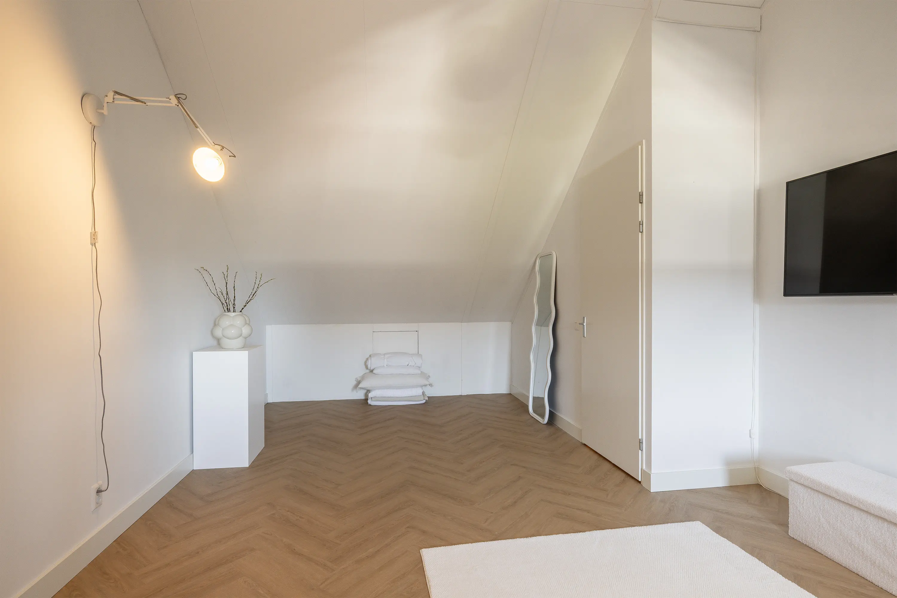 De zolder vormt een aangename verrassing: een ruime, lichte verdieping met een hoog plafond van ca. 3,35 meter en een raampartij aan de voorzijde. Momenteel is deze etage ingericht als hoofdslaapkamer, waar de warme visgraatvloer en zachte beige tinten zorgen voor een rustgevende sfeer. Het raam aan de voorzijde van de tweede verdieping is voorzien van een elektrisch rolluik.