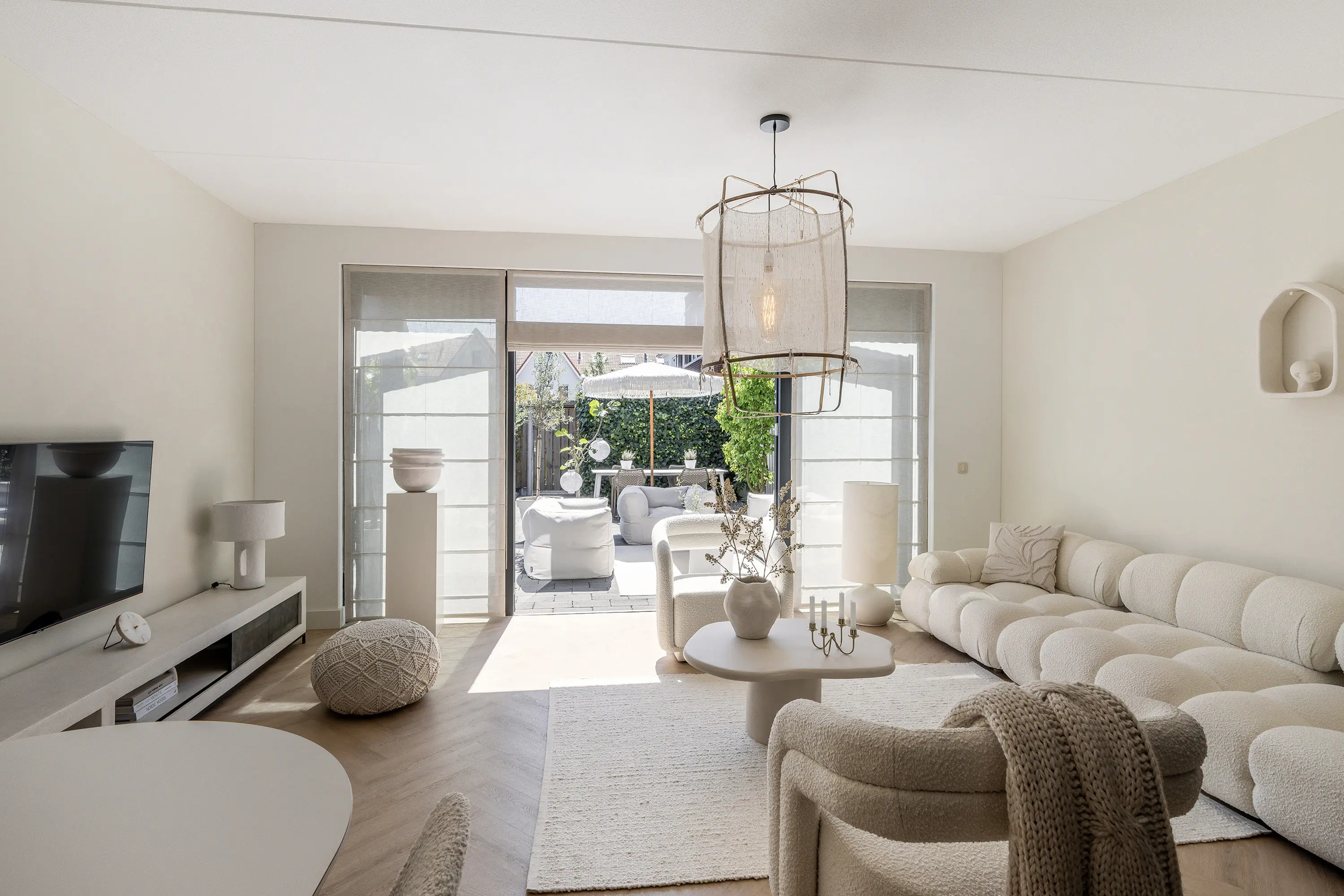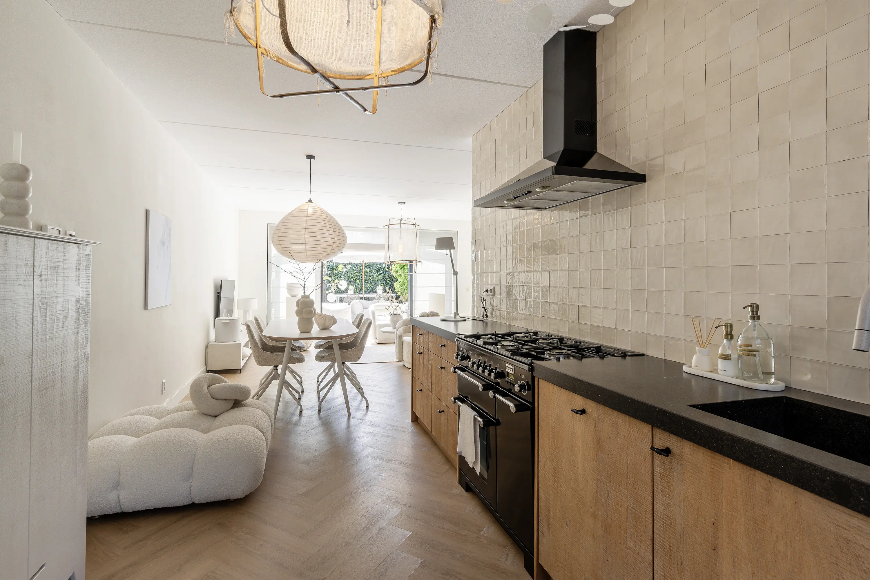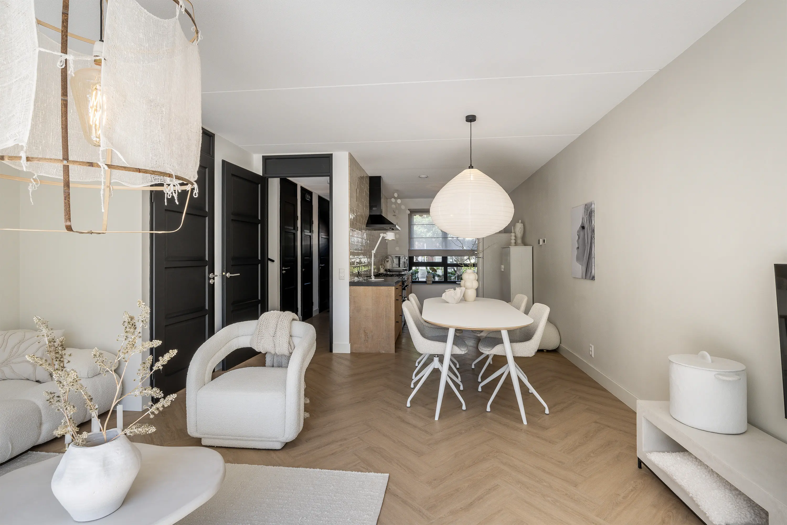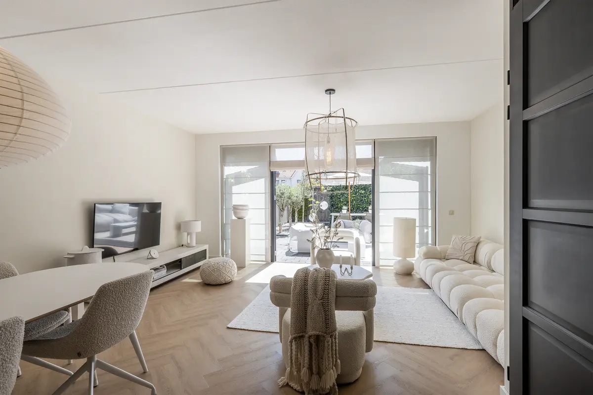 Aan de achterzijde van de woonkamer is een royale zithoek gesitueerd. De pvc-visgraatvloer, die vanuit de gang is doorgelegd, geeft de ruimte extra warmte en sfeer. Met de strakke lichte wanden, de openslaande deuren en de beige tinten ontstaat tevens een stijlvol en eigentijds geheel.