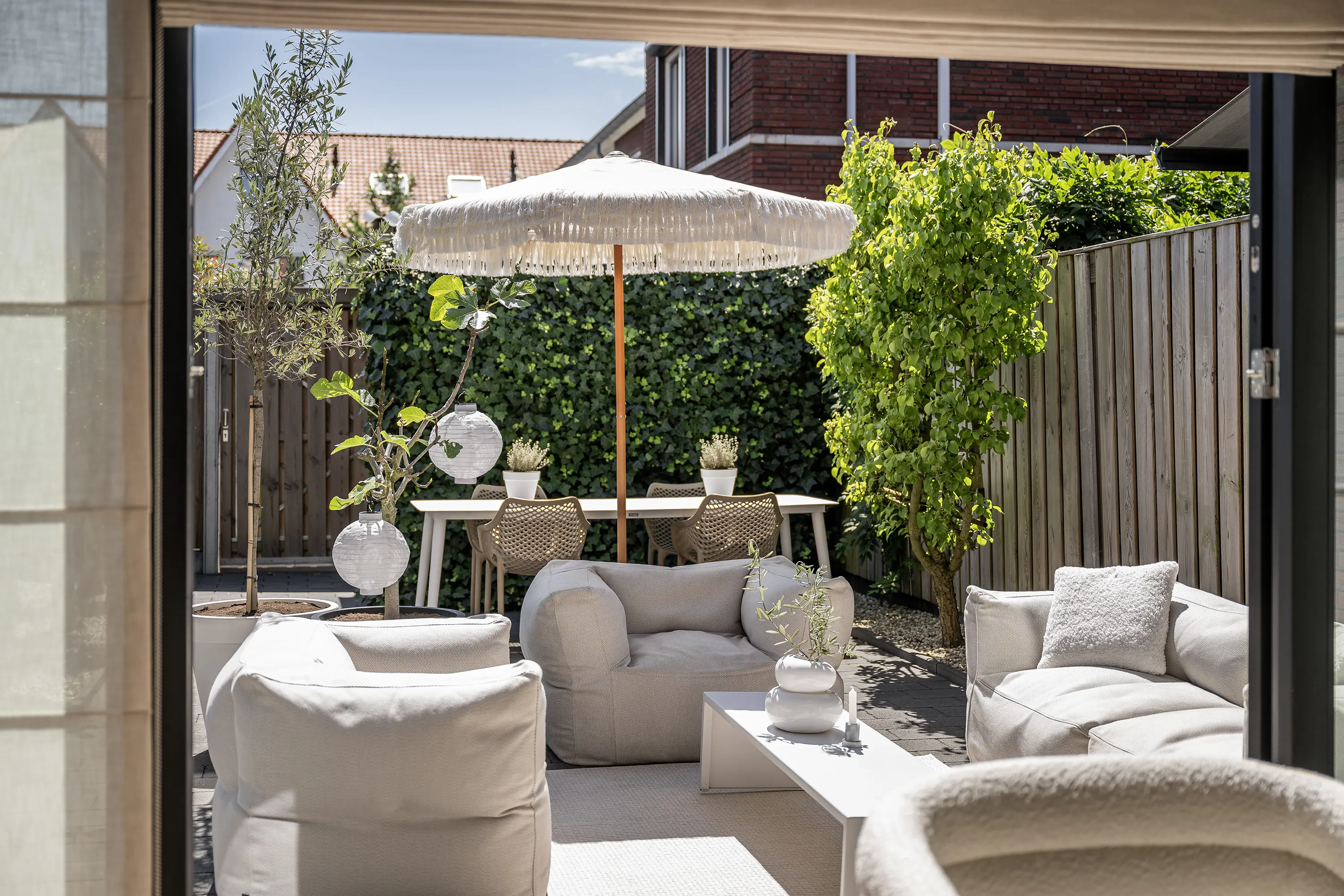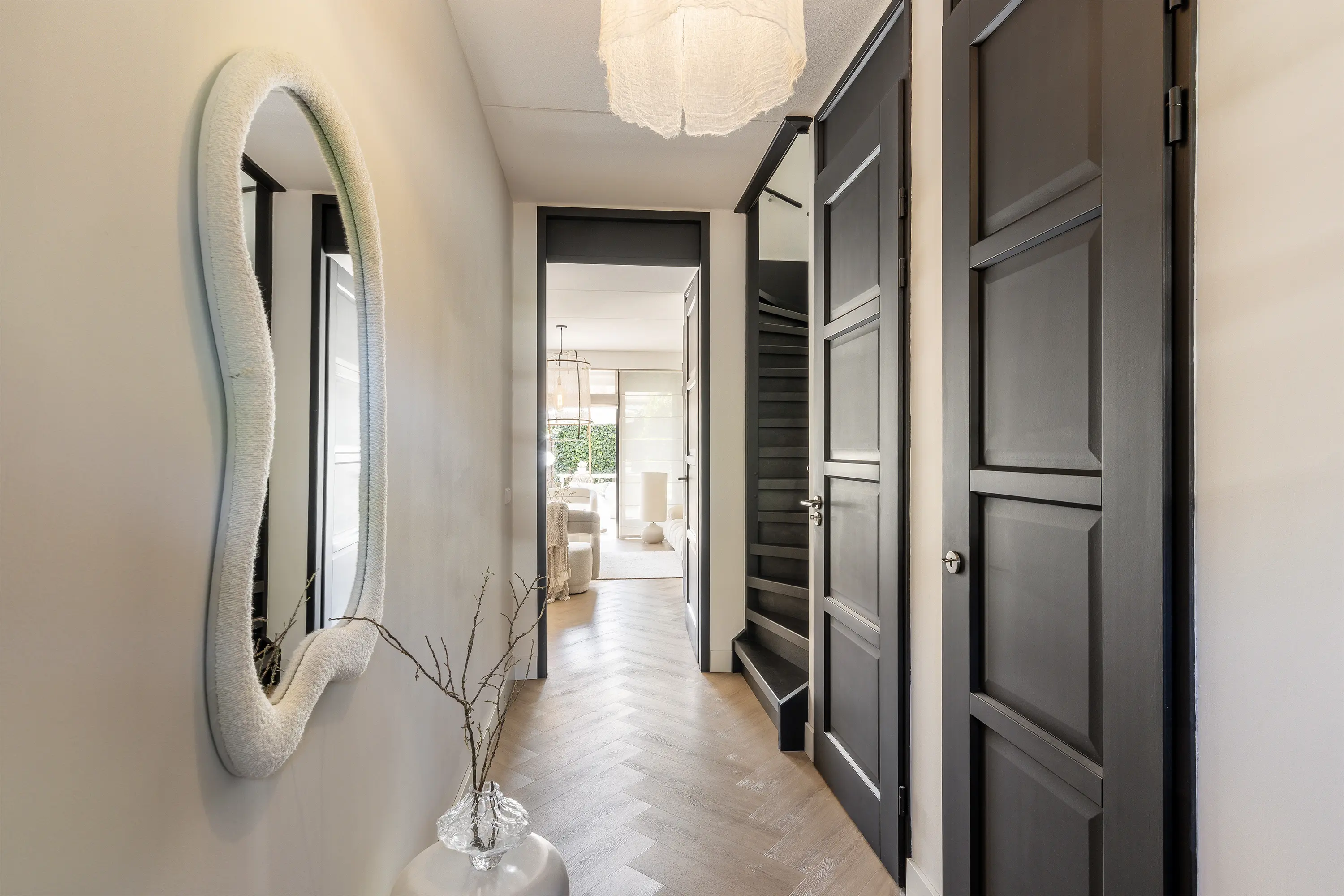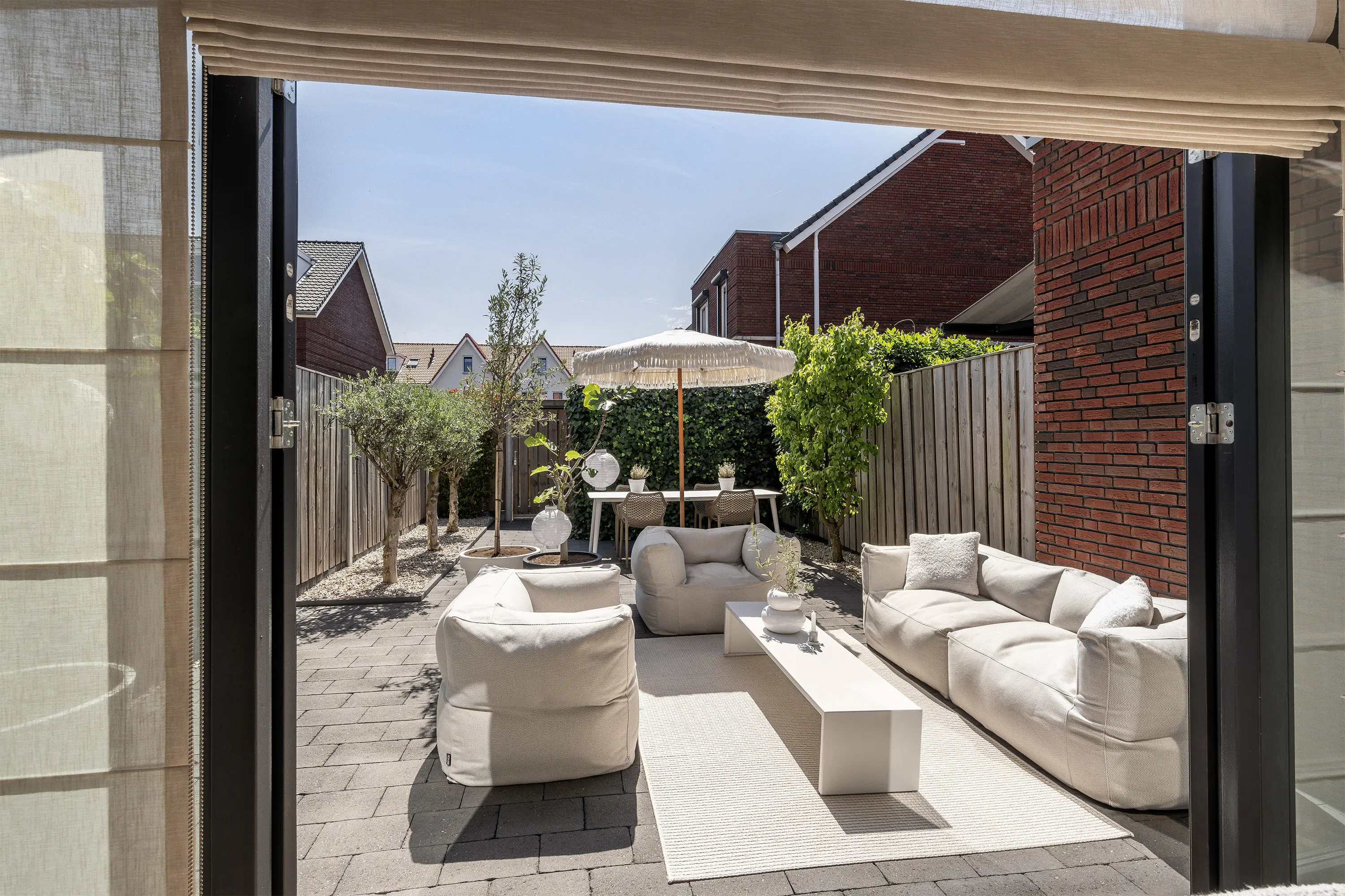 Aan de achterzijde van de woonkamer is een royale zithoek gesitueerd. De pvc-visgraatvloer, die vanuit de gang is doorgelegd, geeft de ruimte extra warmte en sfeer. Met de strakke lichte wanden, de openslaande deuren en de beige tinten ontstaat tevens een stijlvol en eigentijds geheel.