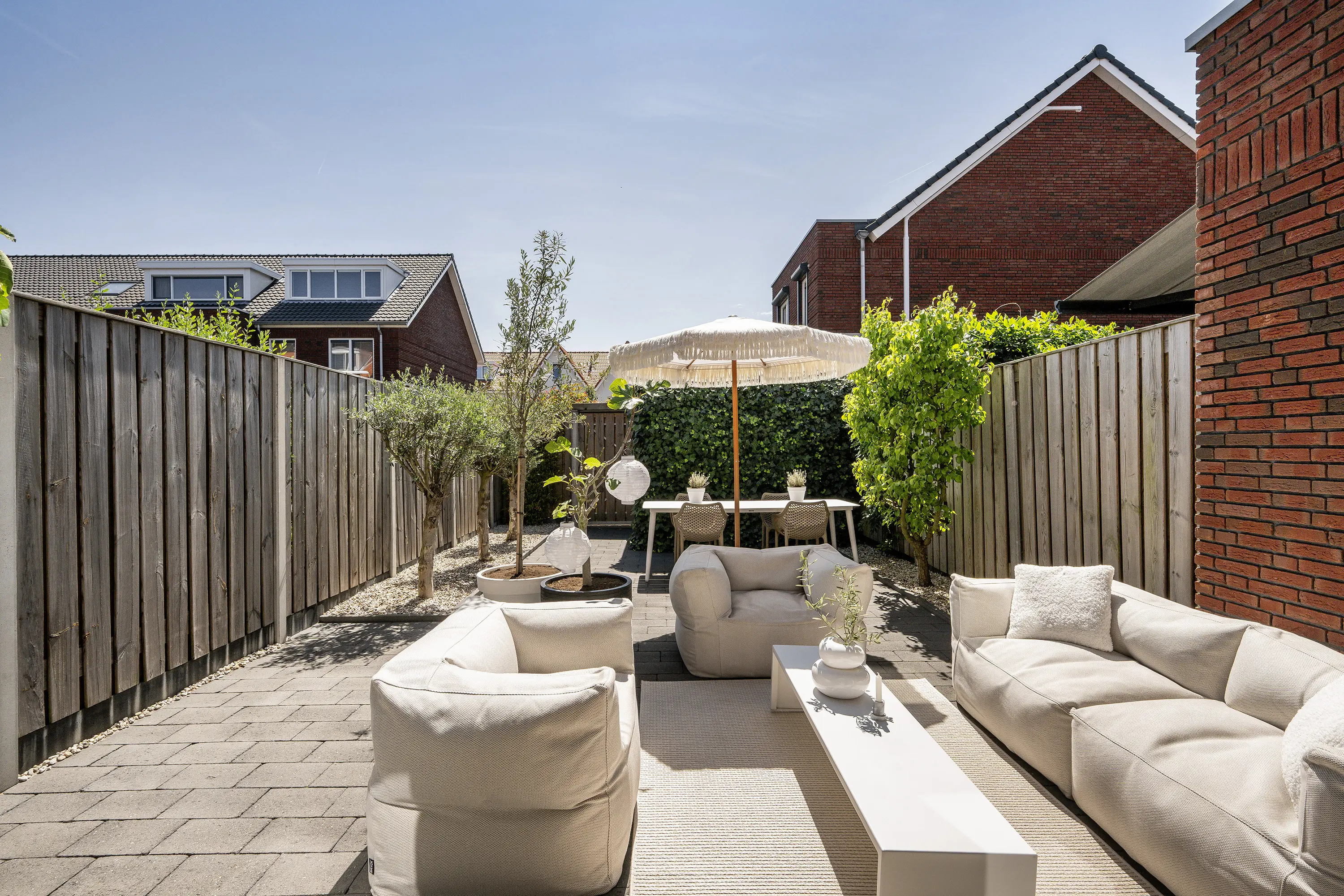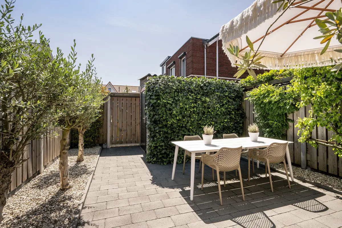 De achtertuin ligt op het zuidoosten en is onderhoudsvriendelijk aangelegd, met een ruim terras, groene beplanting, elektrische zonwering en houten erfafscheiding. Door de ligging en indeling is er veel zon en voldoende privacy. Dit is dé plek waar u elke dag dat ontspannen vakantiegevoel ervaart: maar dan gewoon bij u thuis!