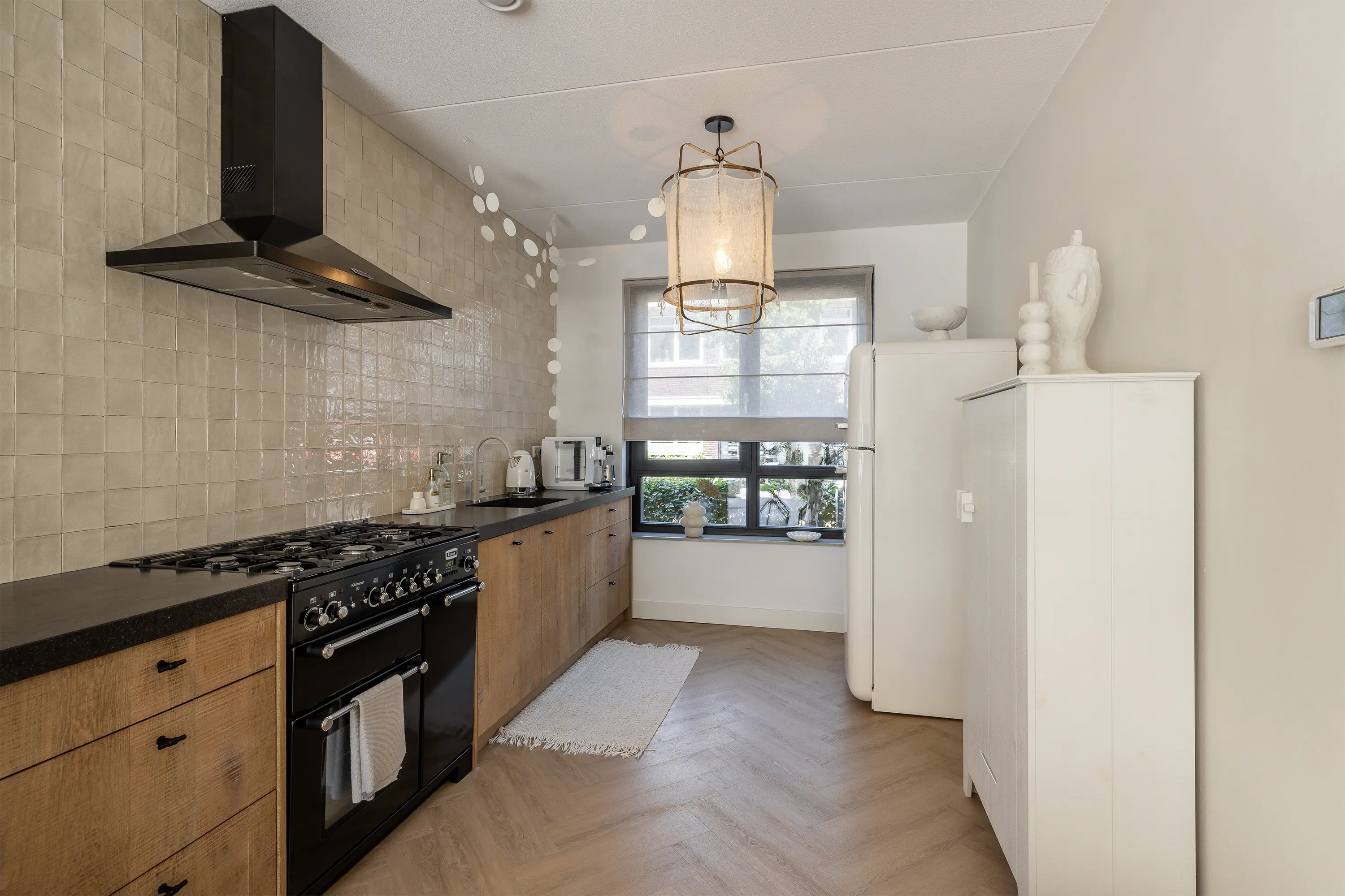 In de woonkamer valt meteen de royale ruimte op, die door de grote ramen aan de tuinzijde volop natuurlijk licht ontvangt. Openslaande deuren geven direct toegang tot de tuin. Aan de voorzijde van de woning bevindt zich de open keuken, geplaatst in een praktische nis. De keuken is voorzien van houten fronten, een composiet werkblad en diverse inbouwapparatuur, waaronder een 5-pits gasfornuis met afzuigkap (Falkon kitchener), dubbele oven, vaatwasser, spoelbak met heet waterkraan en een koel-/vriescombinatie.