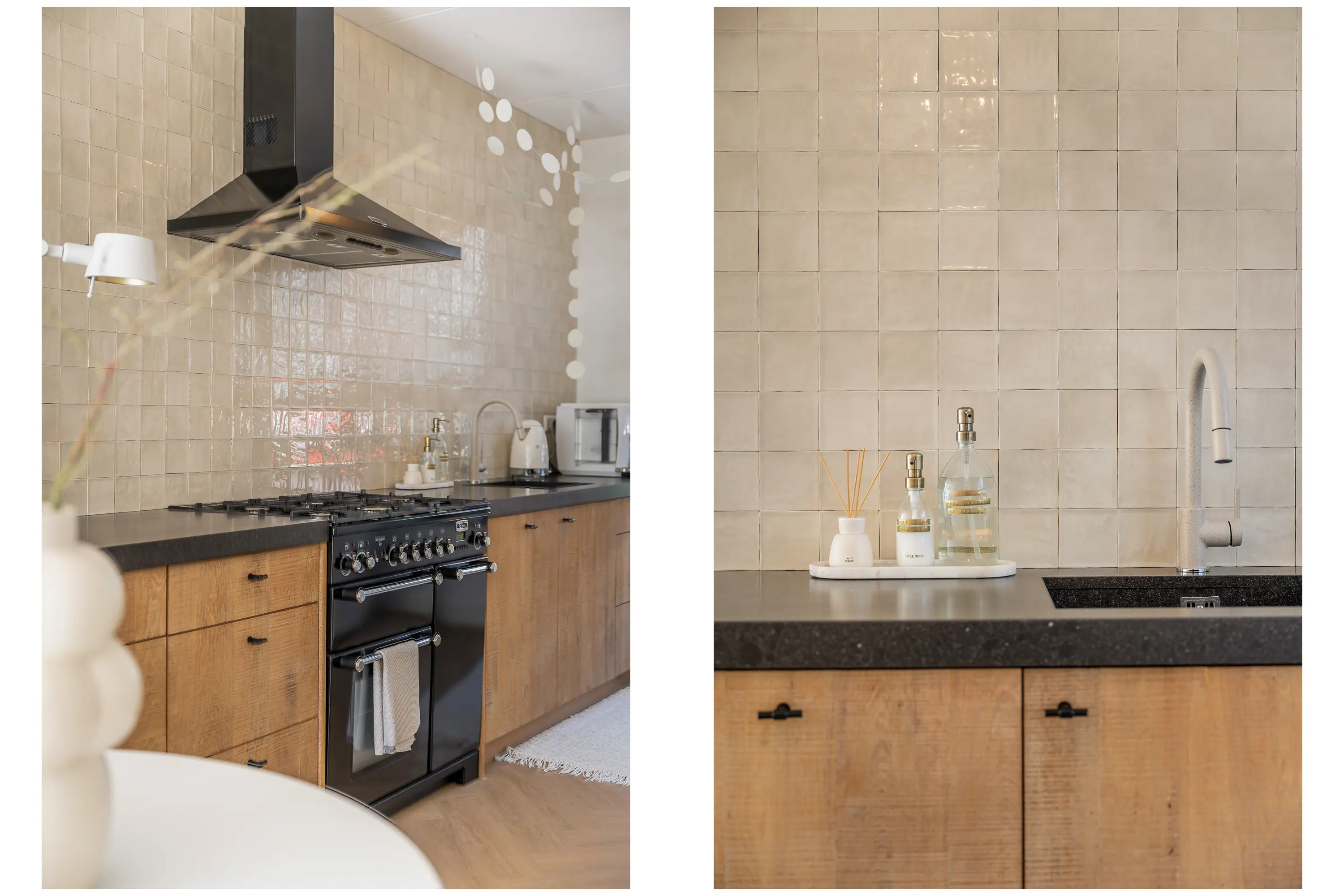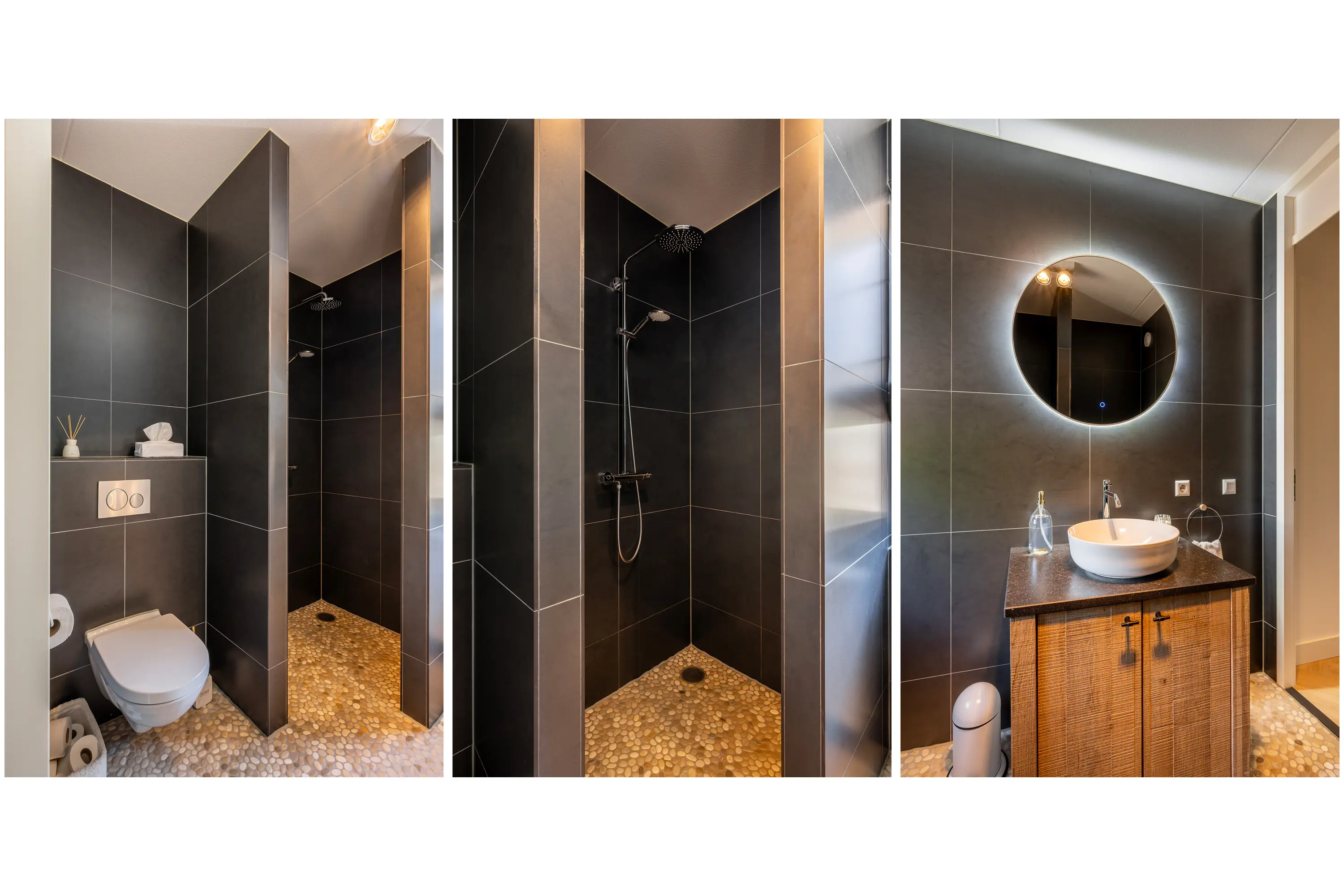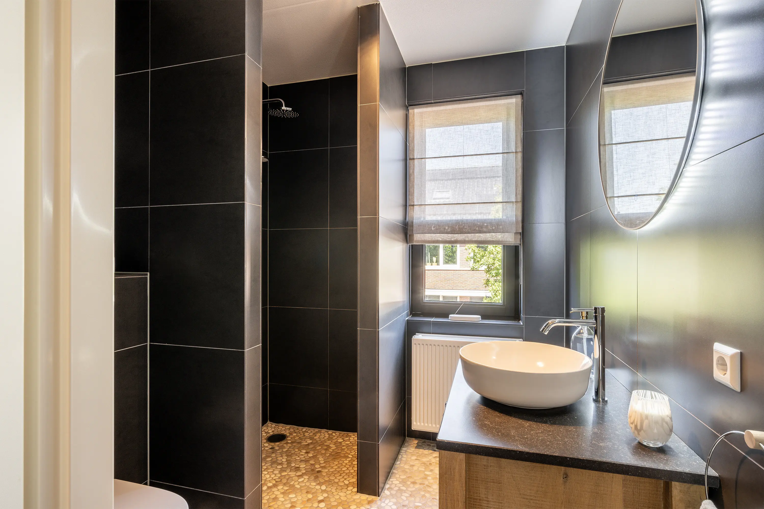 De badkamer, gerealiseerd in 2017, heeft een moderne en luxe uitstraling. Het houten wastafelmeubel met composiet blad en witte waskom vormt een stijlvol contrast met de antraciet wandbetegeling. Op de vloer geven Ibiza-stijl pebblestone een speelse, natuurlijke twist. De inloopdouche is voorzien van een rainshower en het wandtoilet maakt het geheel compleet.