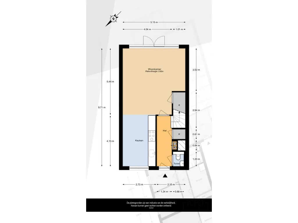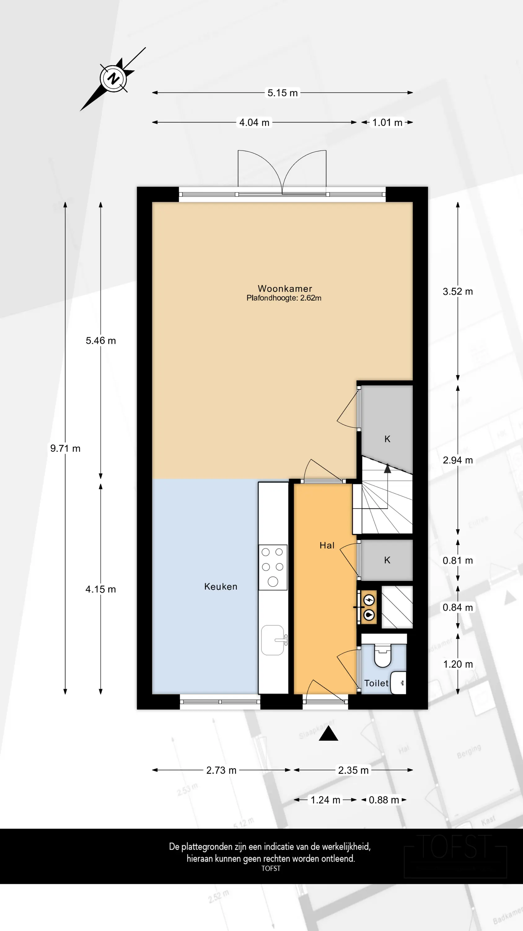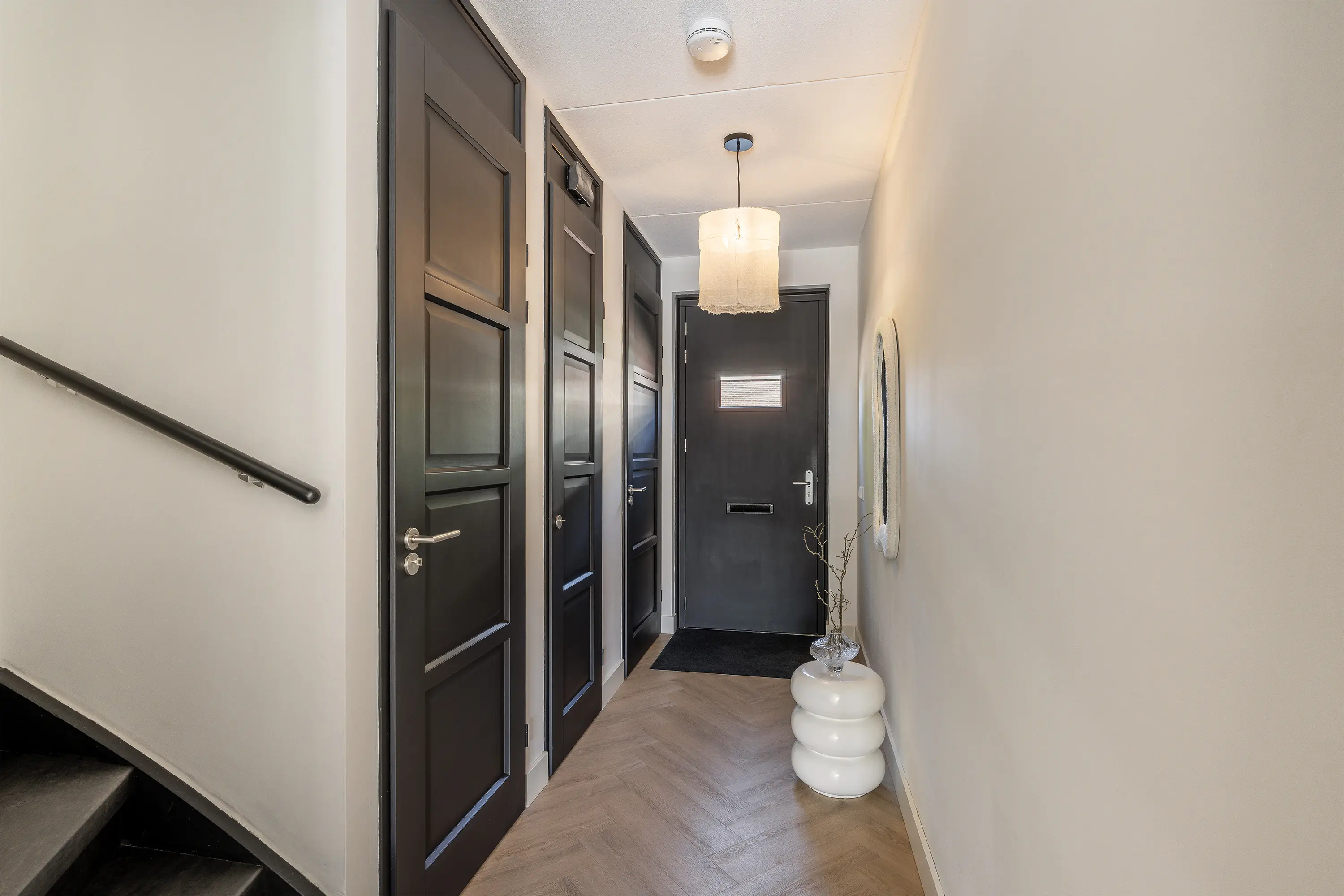 De visgraat PVC-vloer loopt door over de hele begane grond en is voorzien van vloerverwarming. In de hal bevindt zich de garderobe, meterkast, toiletruimte, trapopgang en toegang tot de woonkamer.