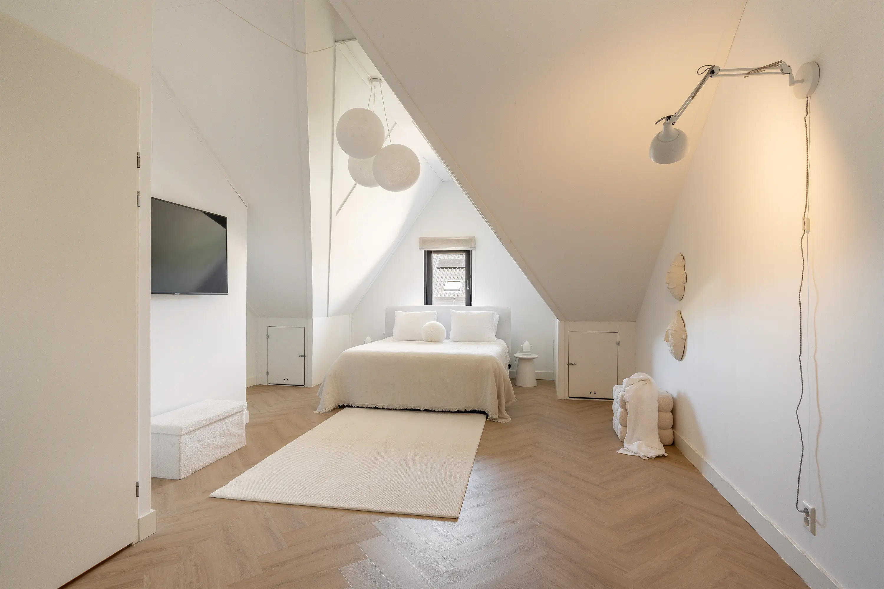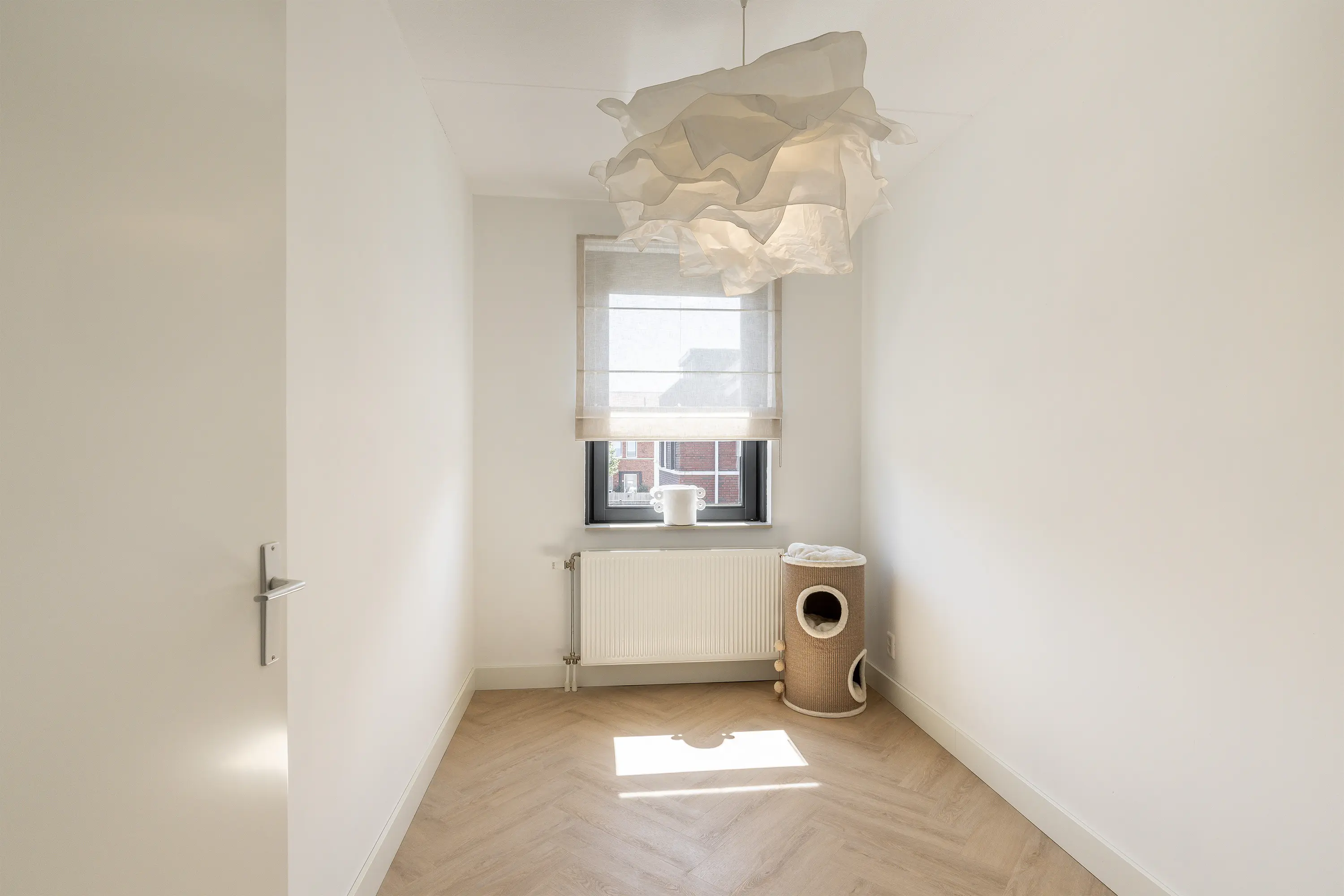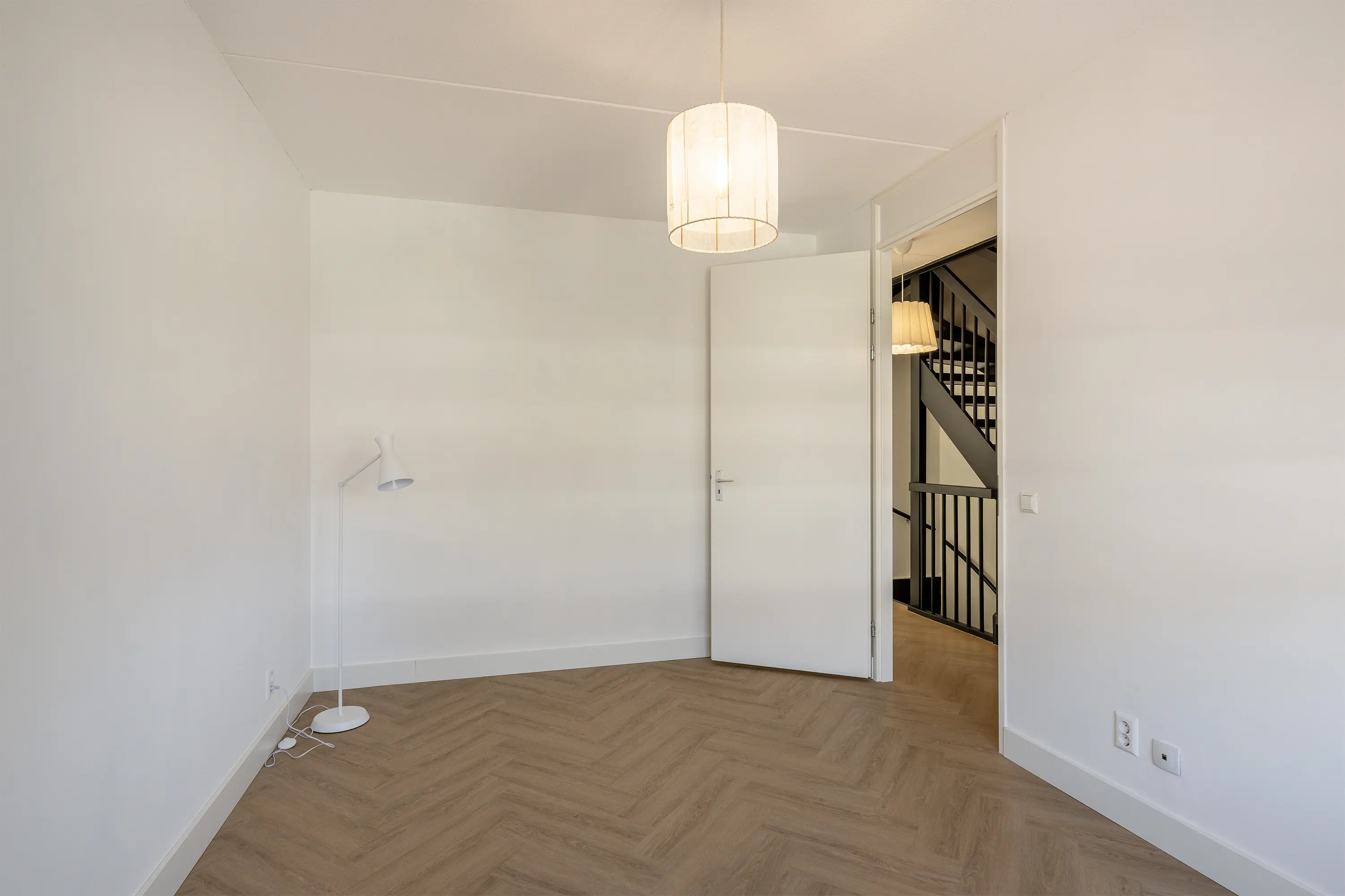 De zolder vormt een aangename verrassing: een ruime, lichte verdieping met een hoog plafond van ca. 3,35 meter en een raampartij aan de voorzijde. Momenteel is deze etage ingericht als hoofdslaapkamer, waar de warme visgraatvloer en zachte beige tinten zorgen voor een rustgevende sfeer. Het raam aan de voorzijde van de tweede verdieping is voorzien van een elektrisch rolluik.