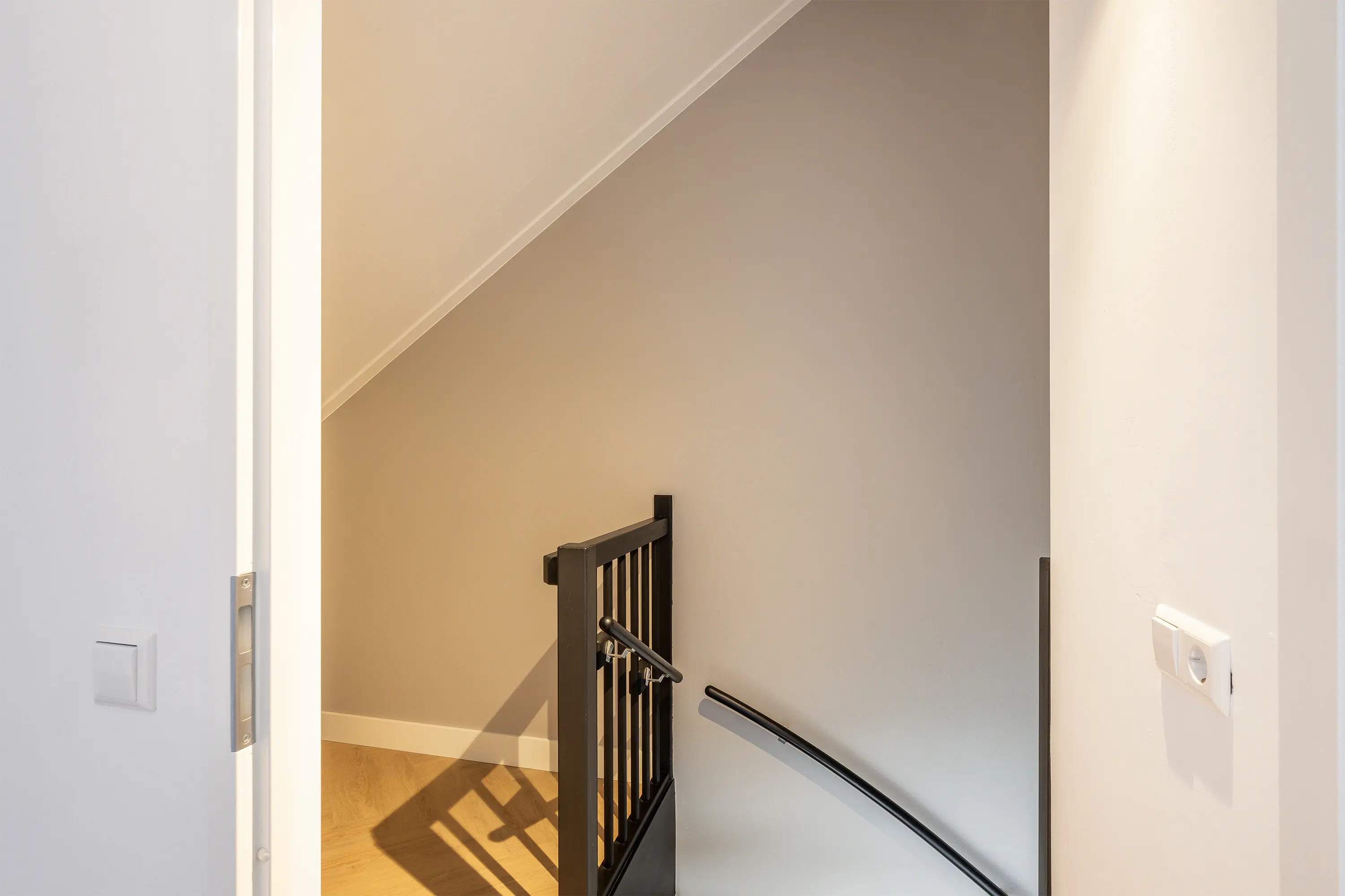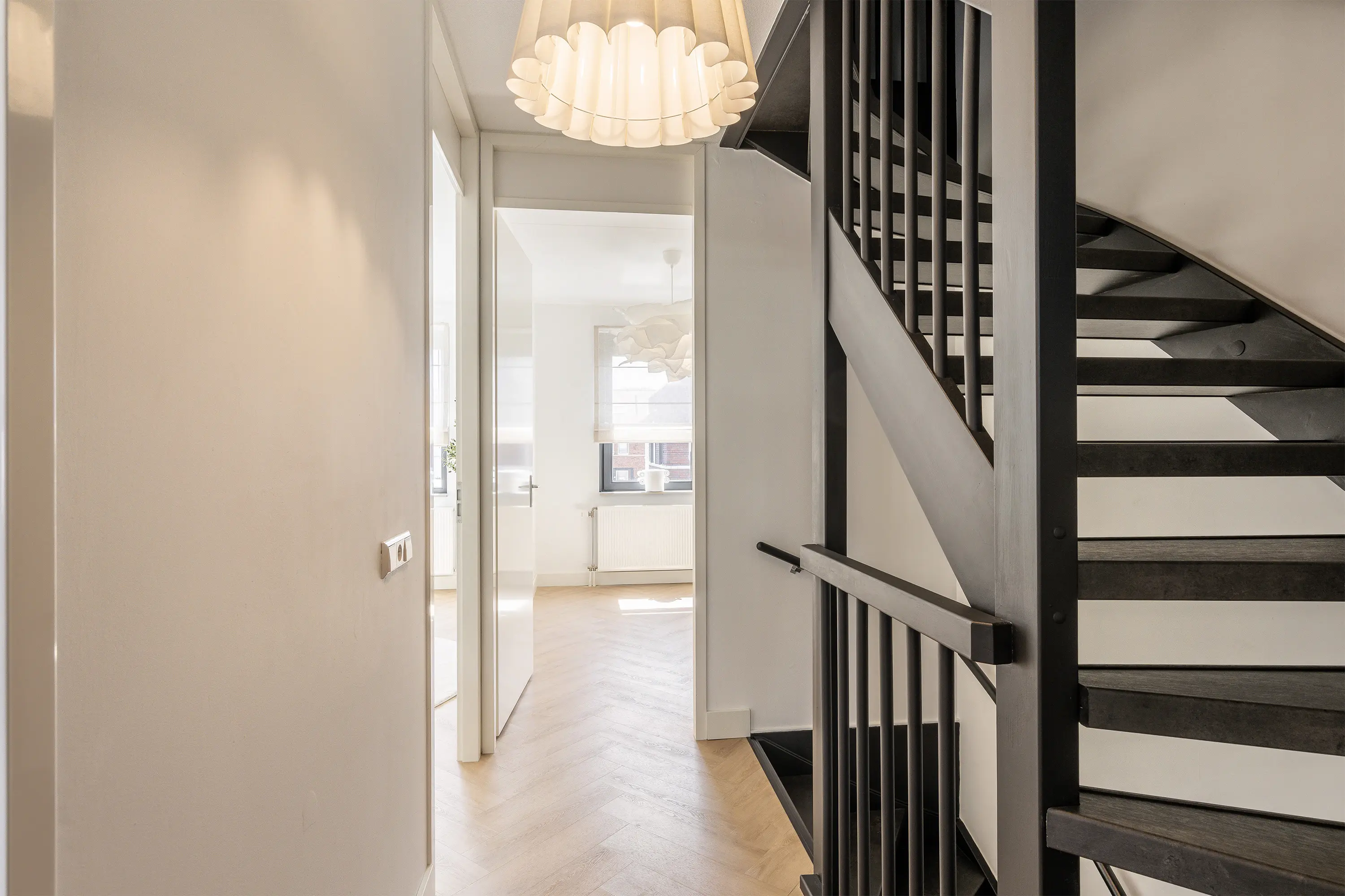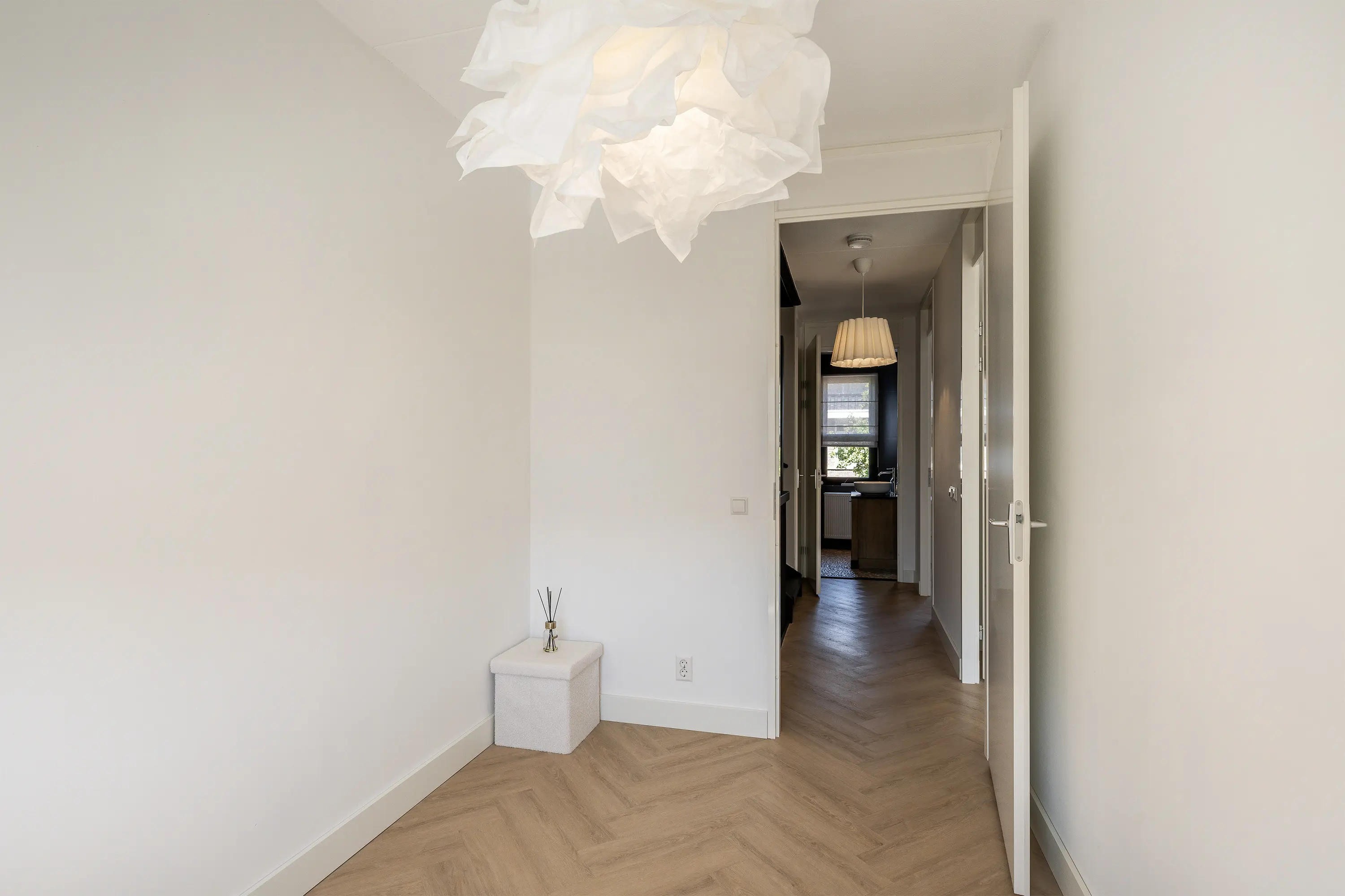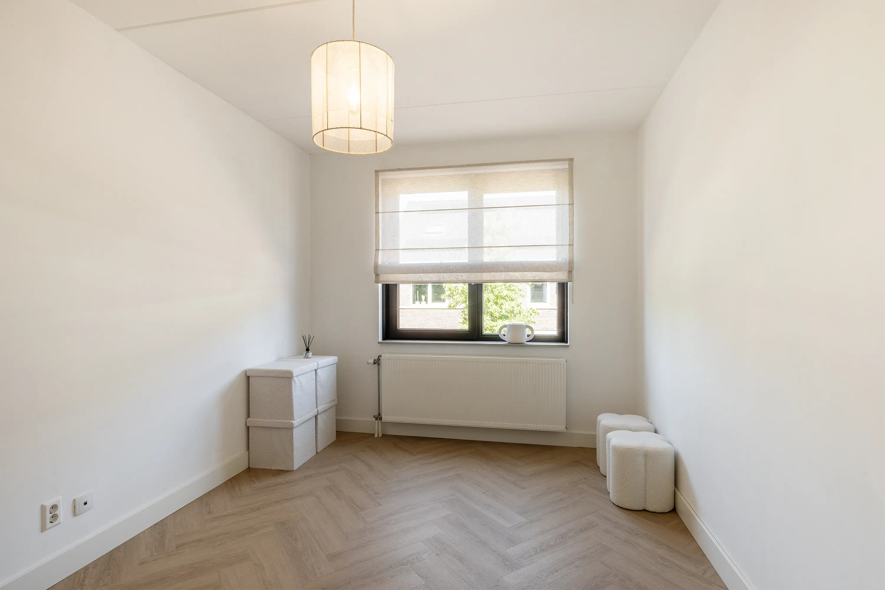 De zolder vormt een aangename verrassing: een ruime, lichte verdieping met een hoog plafond van ca. 3,35 meter en een raampartij aan de voorzijde. Momenteel is deze etage ingericht als hoofdslaapkamer, waar de warme visgraatvloer en zachte beige tinten zorgen voor een rustgevende sfeer. Het raam aan de voorzijde van de tweede verdieping is voorzien van een elektrisch rolluik.