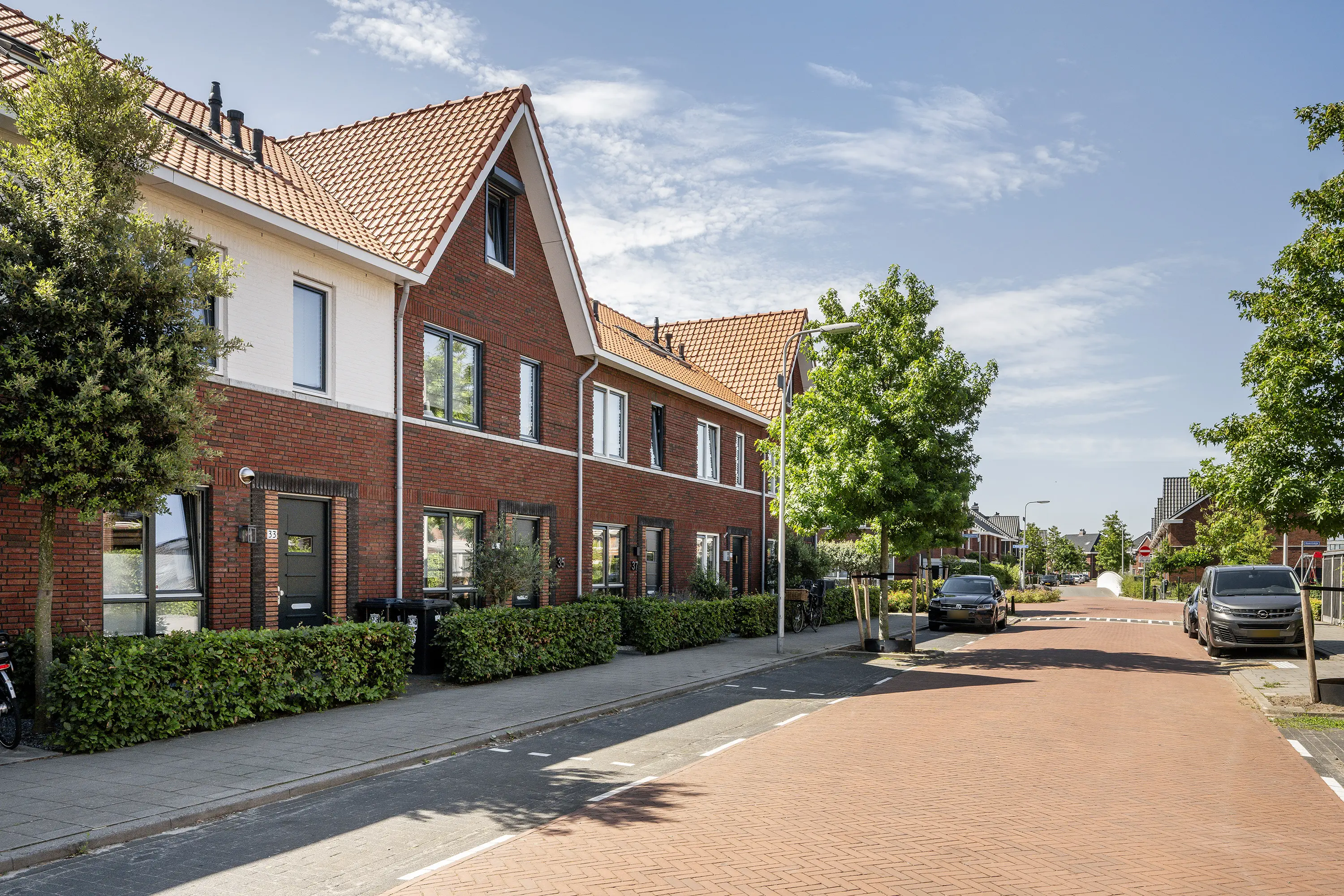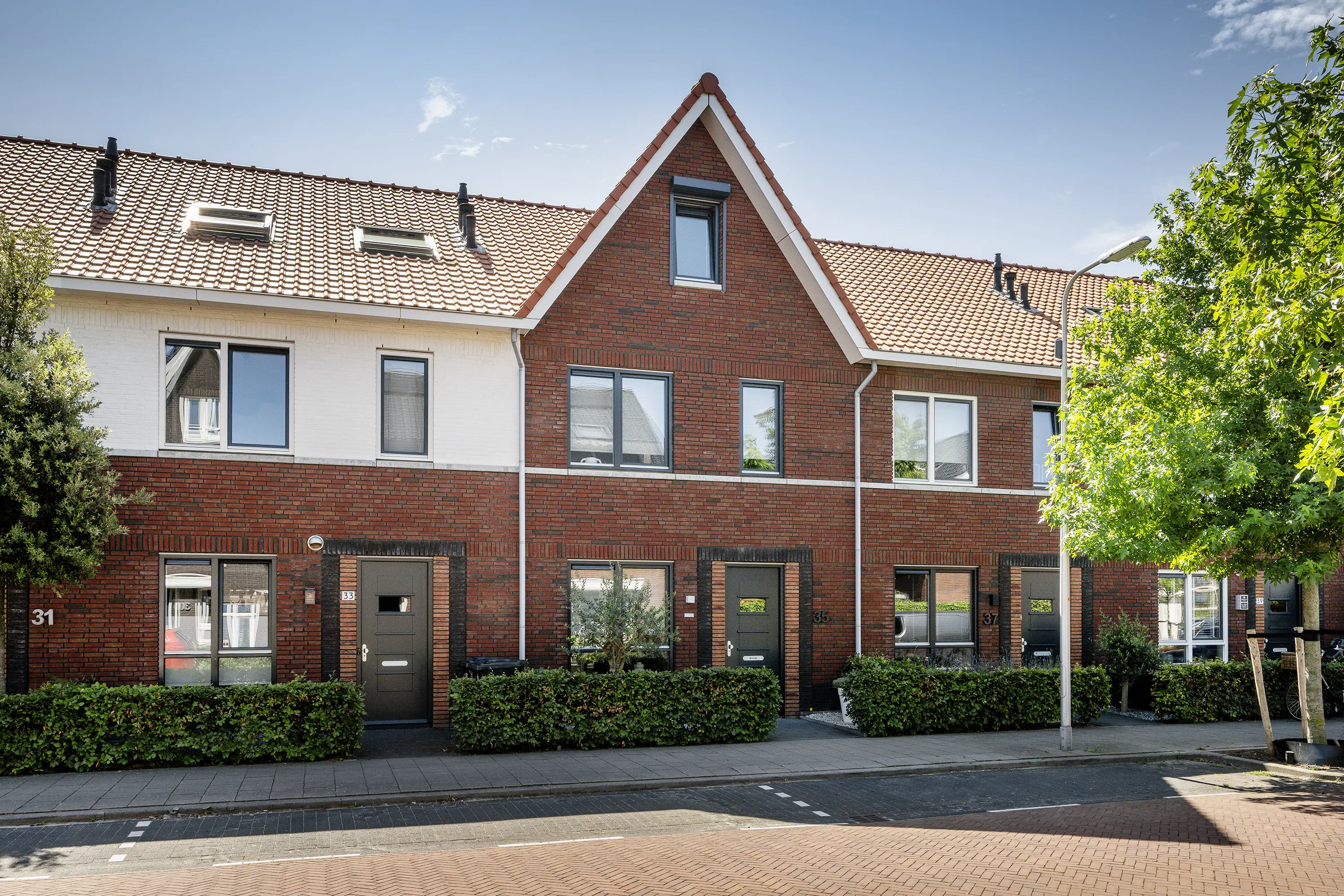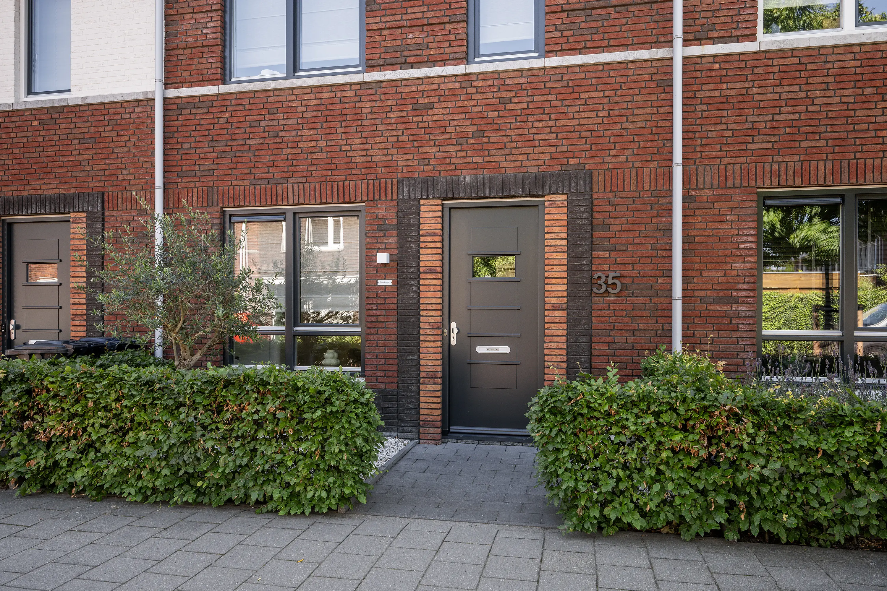 Al bij aankomst valt het strakke karakter van deze woning op: een moderne bakstenen gevel, een stijlvolle voordeur en een onderhoudsvriendelijke voortuin.