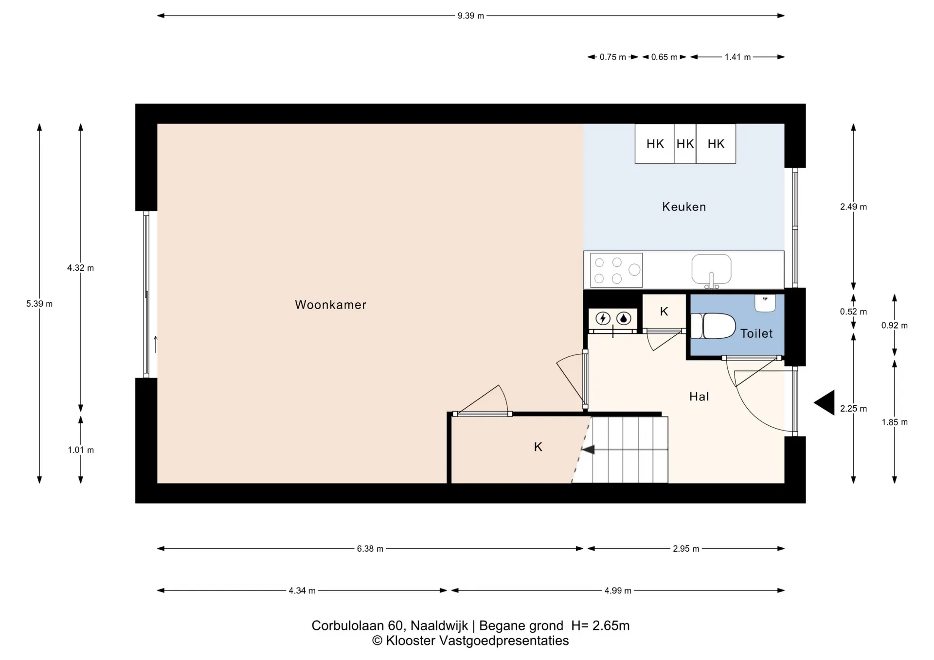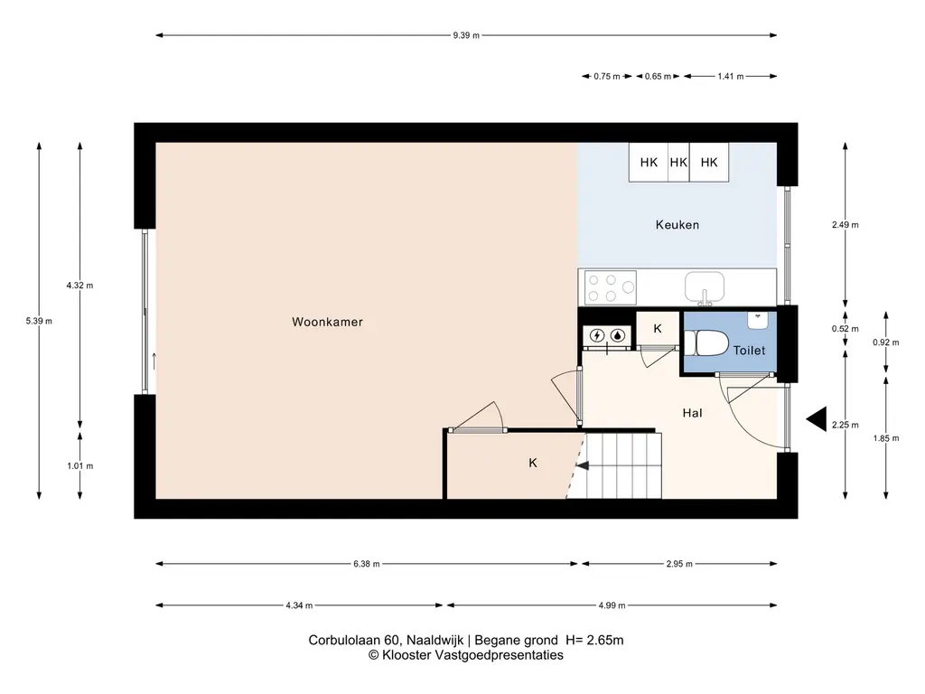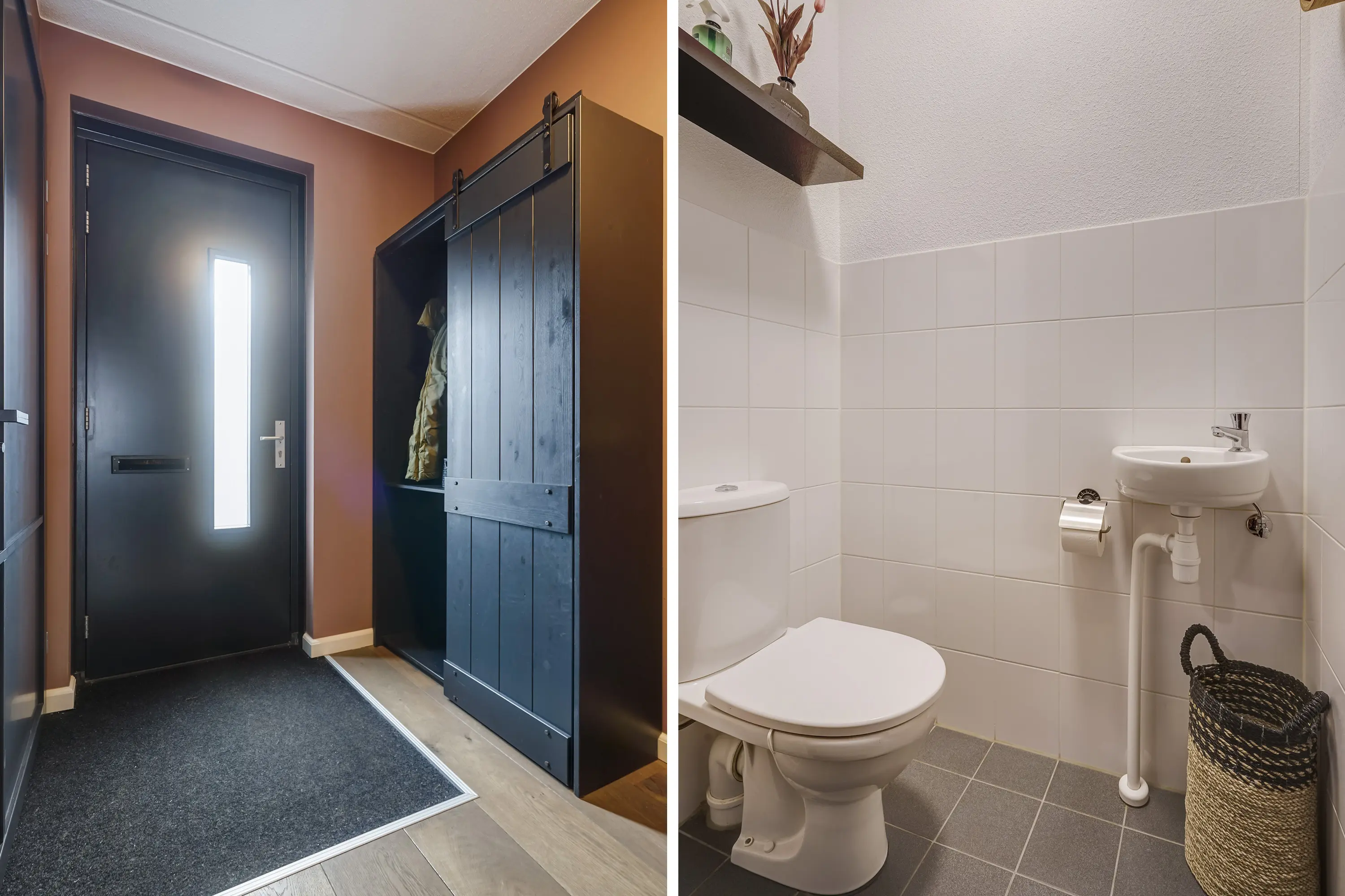 De woning beschikt over een onderhoudsvriendelijke voortuin, gunstig gelegen op het zuidoosten. Kom binnen in de hal die toegang geeft tot de woonkamer, de meterkast, praktische schoenenkast, toilet met fonteintje en de vaste trapopgang naar de eerste verdieping.