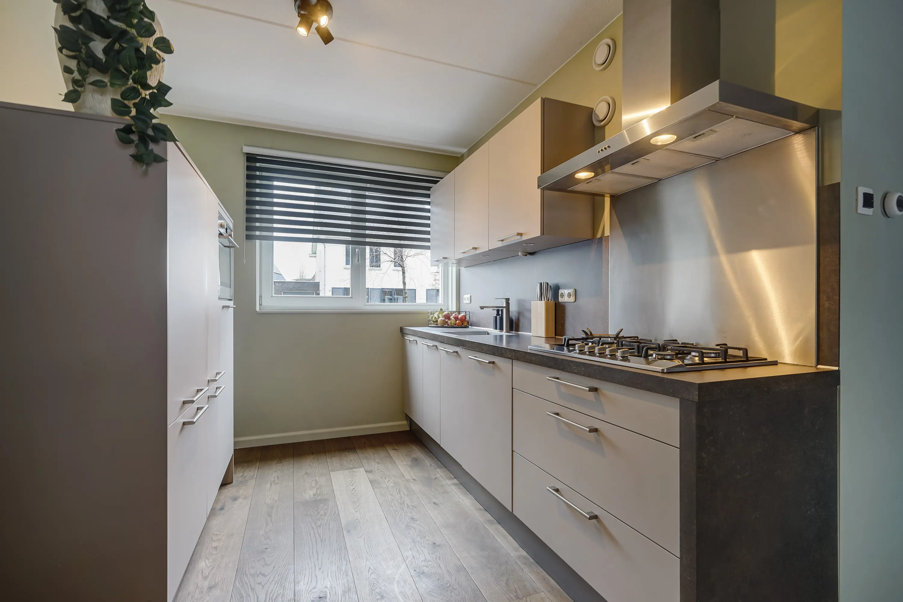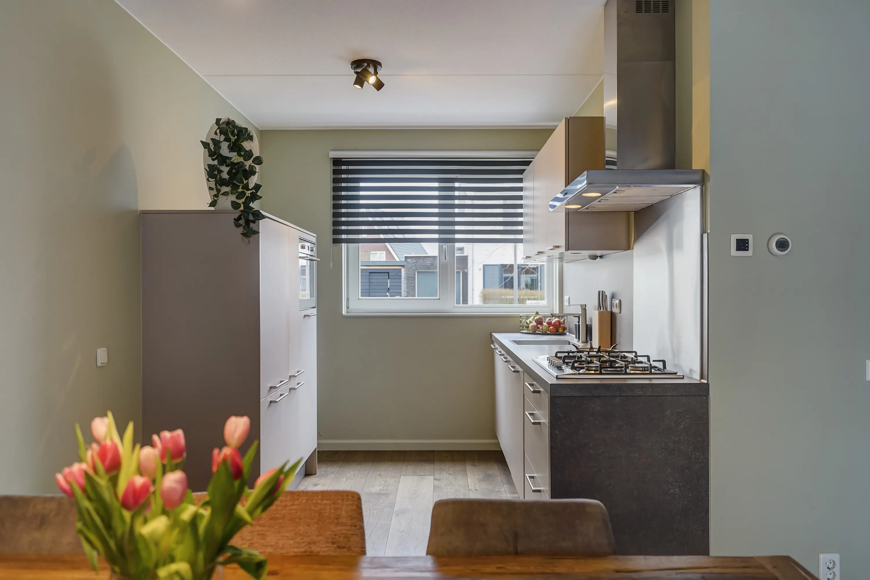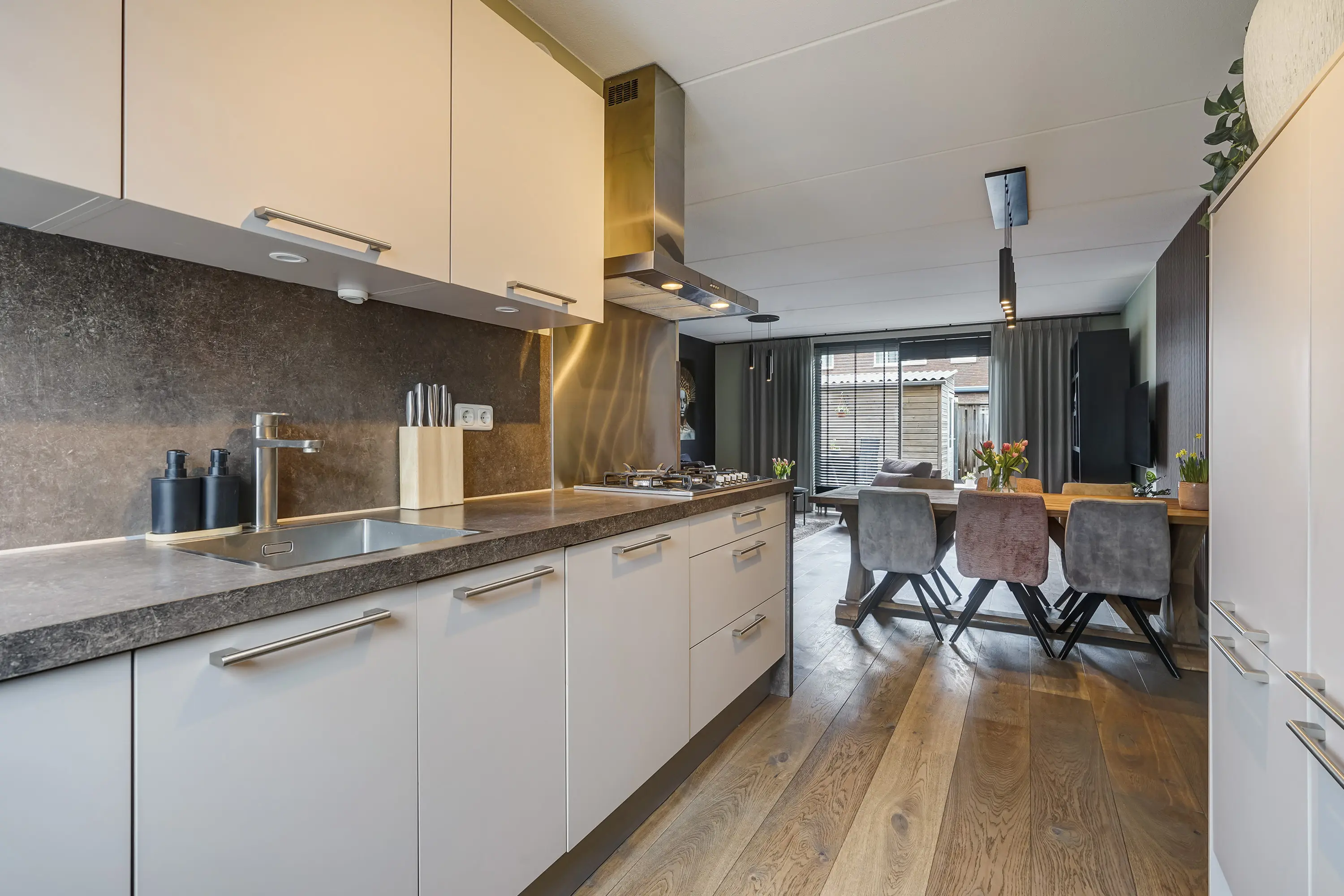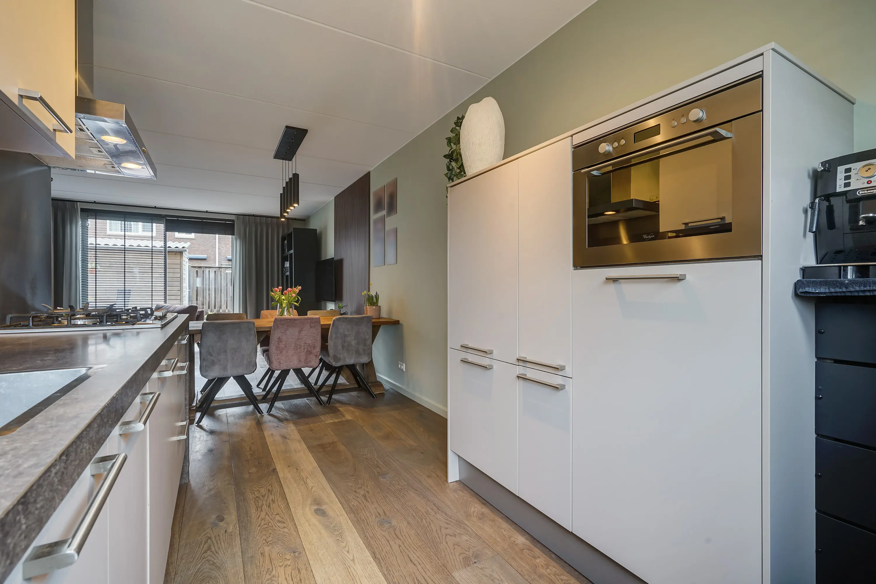 De open keuken bevindt zich aan de voorzijde van de woning en biedt een vrij zicht tussen de woningen door. De keuken is compleet uitgevoerd met een 5-pits kookplaat, afzuigkap, combi-oven, mengkraan met RVS spoelbak en een vaatwasser (2025). Dankzij de vele kasten en laden is er volop opbergruimte.