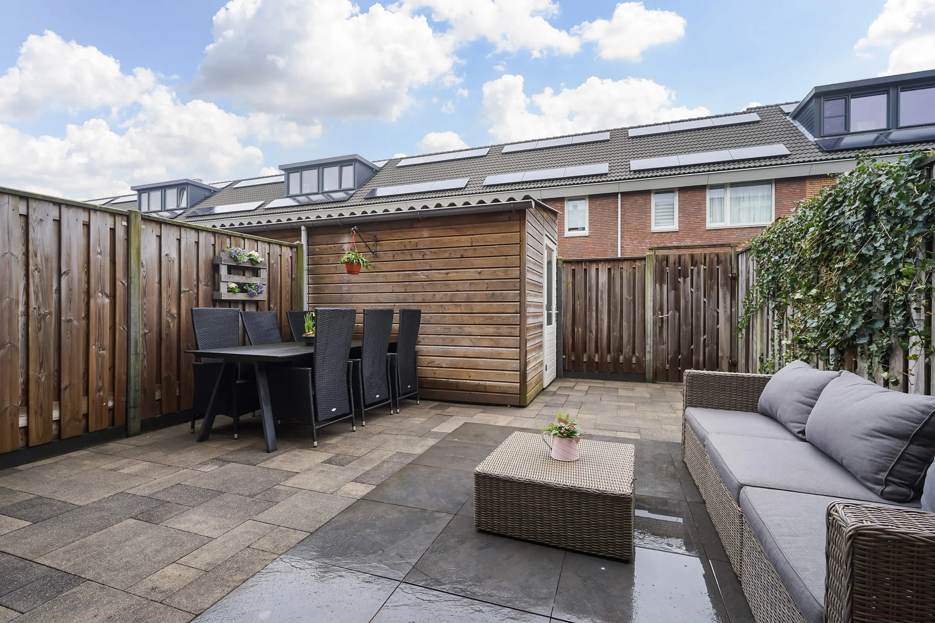 Via de schuifpui bereik je de achtertuin, die gunstig is gelegen op het noordwesten. De tuin is onderhoudsvriendelijk aangelegd met nette bestrating. Achterin de tuin bevindt zich een houten berging, voorzien van elektra, ideaal voor het opbergen van fietsen en tuingereedschap. De tuin is tevens bereikbaar via een praktische achterom met een afsluitbare poort.