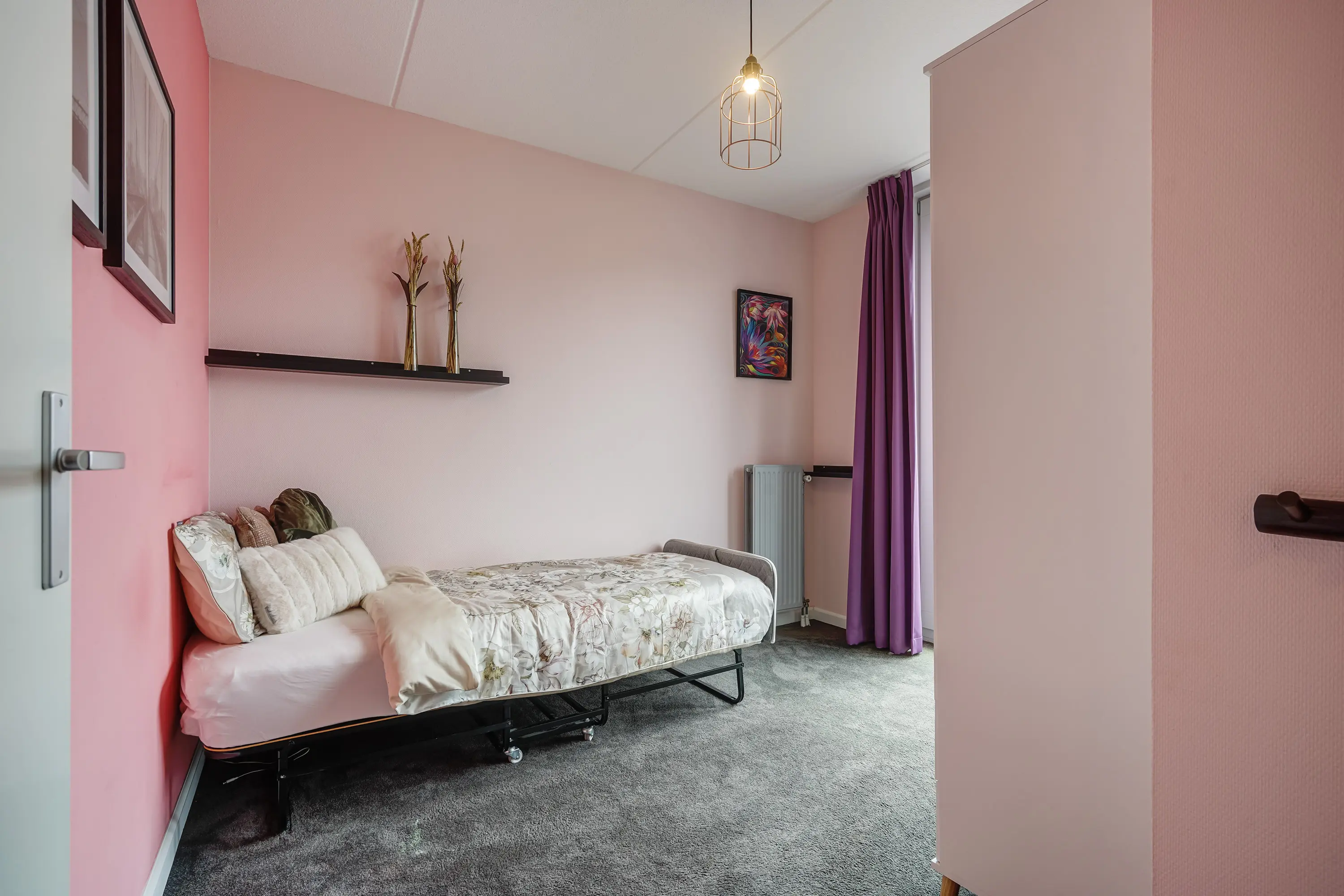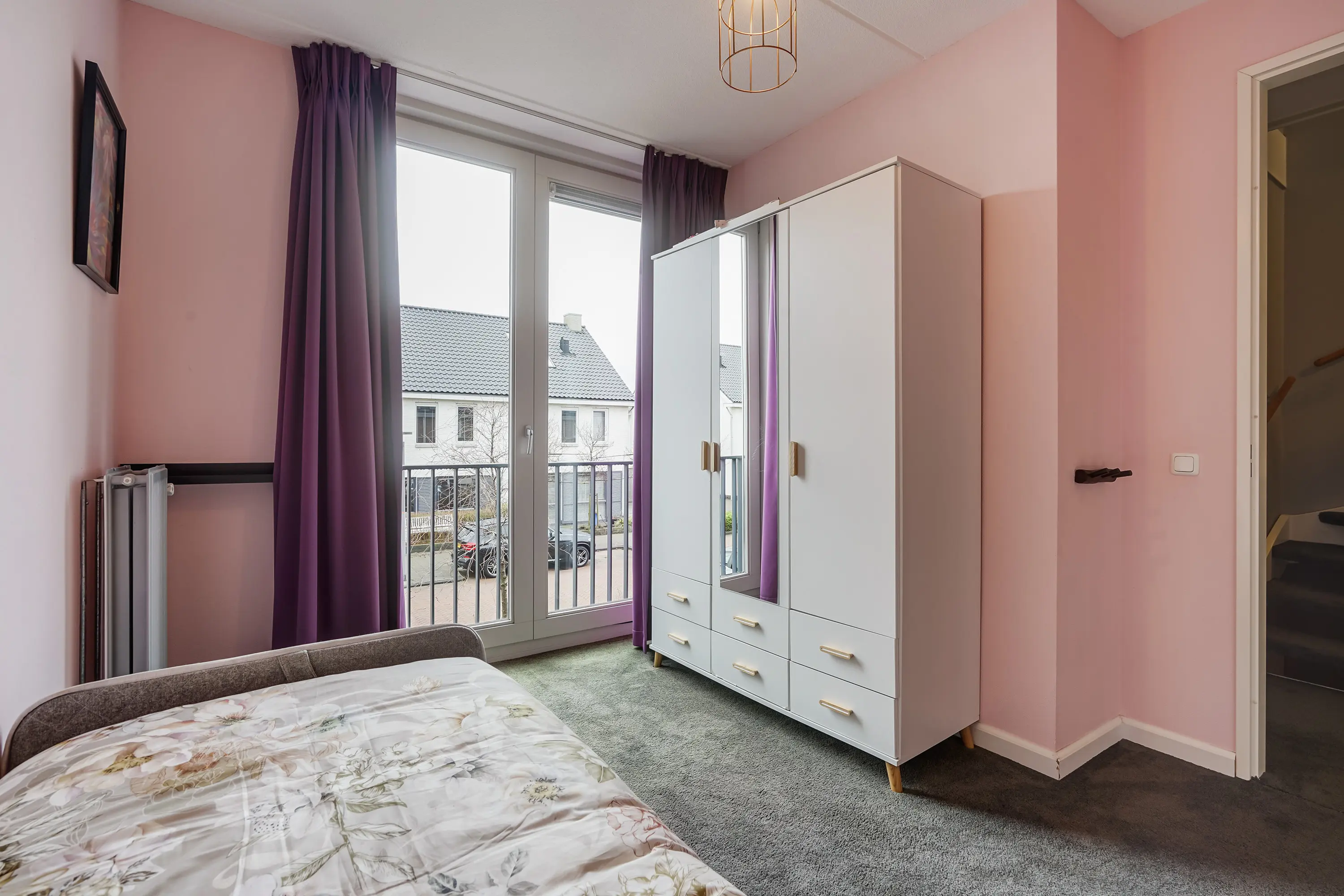 Aan de voorzijde bevindt zich een slaapkamer met twee openslaande deuren en een charmant Frans balkon, wat zorgt voor extra lichtinval en een ruimtelijk gevoel. De derde slaapkamer ligt eveneens aan de achterzijde en is ideaal te gebruiken als kinder-, werk- of logeerkamer.