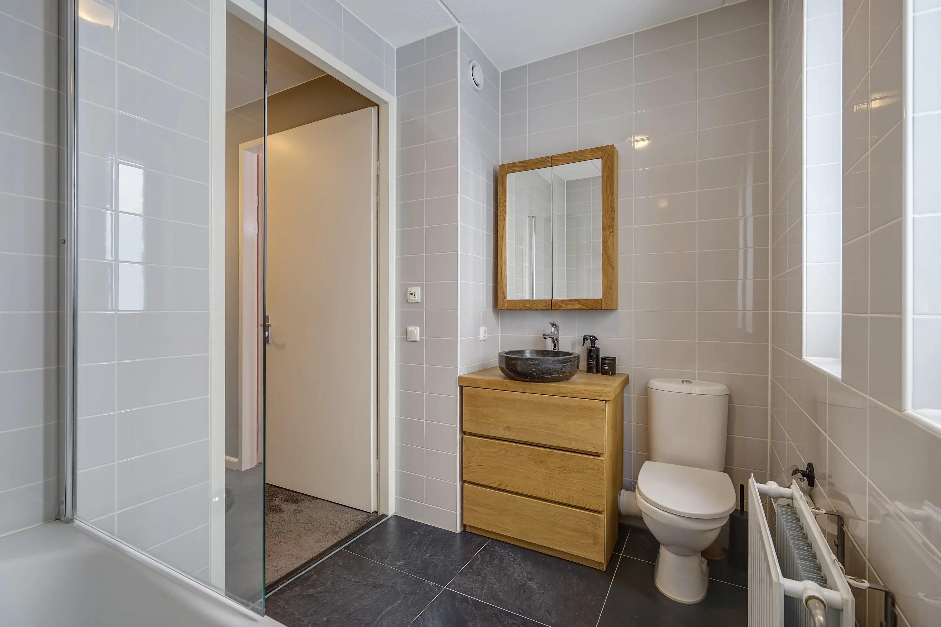 De badkamer ligt aan de voorzijde en is uitgevoerd in een neutrale, tijdloze kleurstelling met lichte wandtegels en antraciet vloertegels. De ruimte is compleet ingericht met een ligbad, douche met glazen spatscherm, toilet en een natuurstenen waskom op een wasmeubel. Daarnaast beschikt de badkamer over twee te openen ramen, mechanische ventilatie en een radiator.