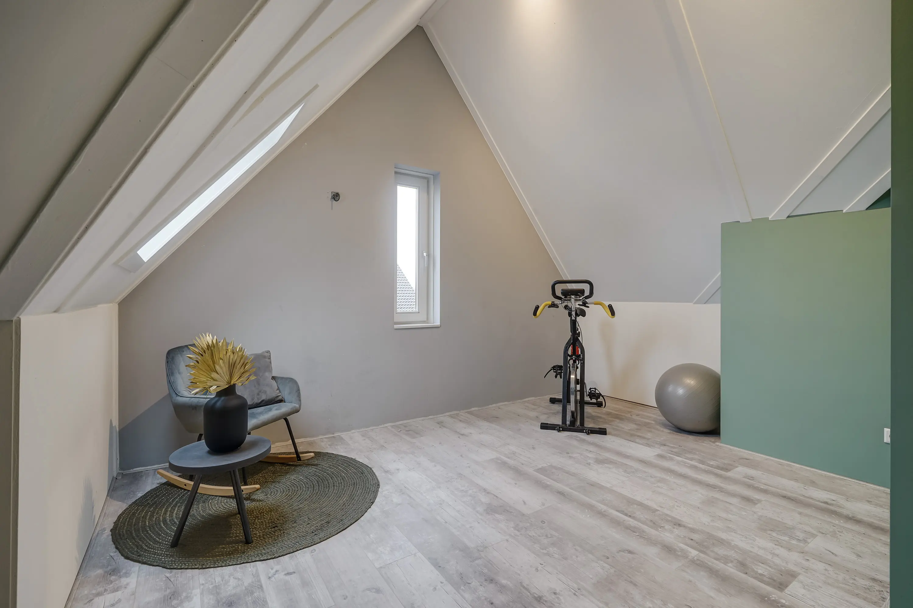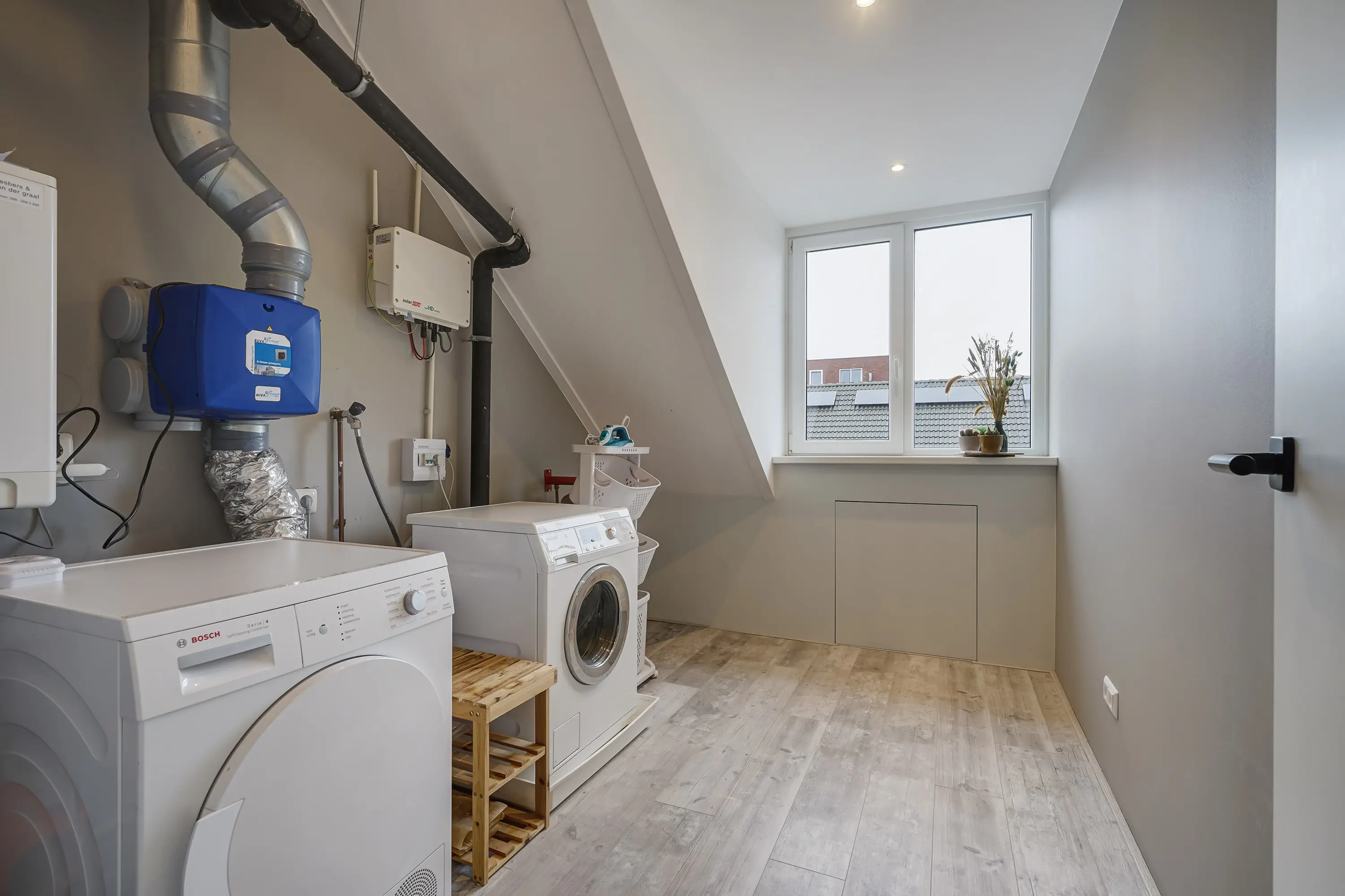 Aan de achterzijde is de woning voorzien van een woningbrede dakkapel (2021) met kunststof kozijnen en elektrische rolluiken. Dit zorgt voor aanzienlijk meer ruimte. Hier zijn een extra slaapkamer en een praktische wasruimte gerealiseerd, met aansluitingen voor wasmachine en droger, evenals de opstelling van de cv-combiketel en de mechanische ventilatie-unit. Achter de knieschotten is extra bergruimte aanwezig.