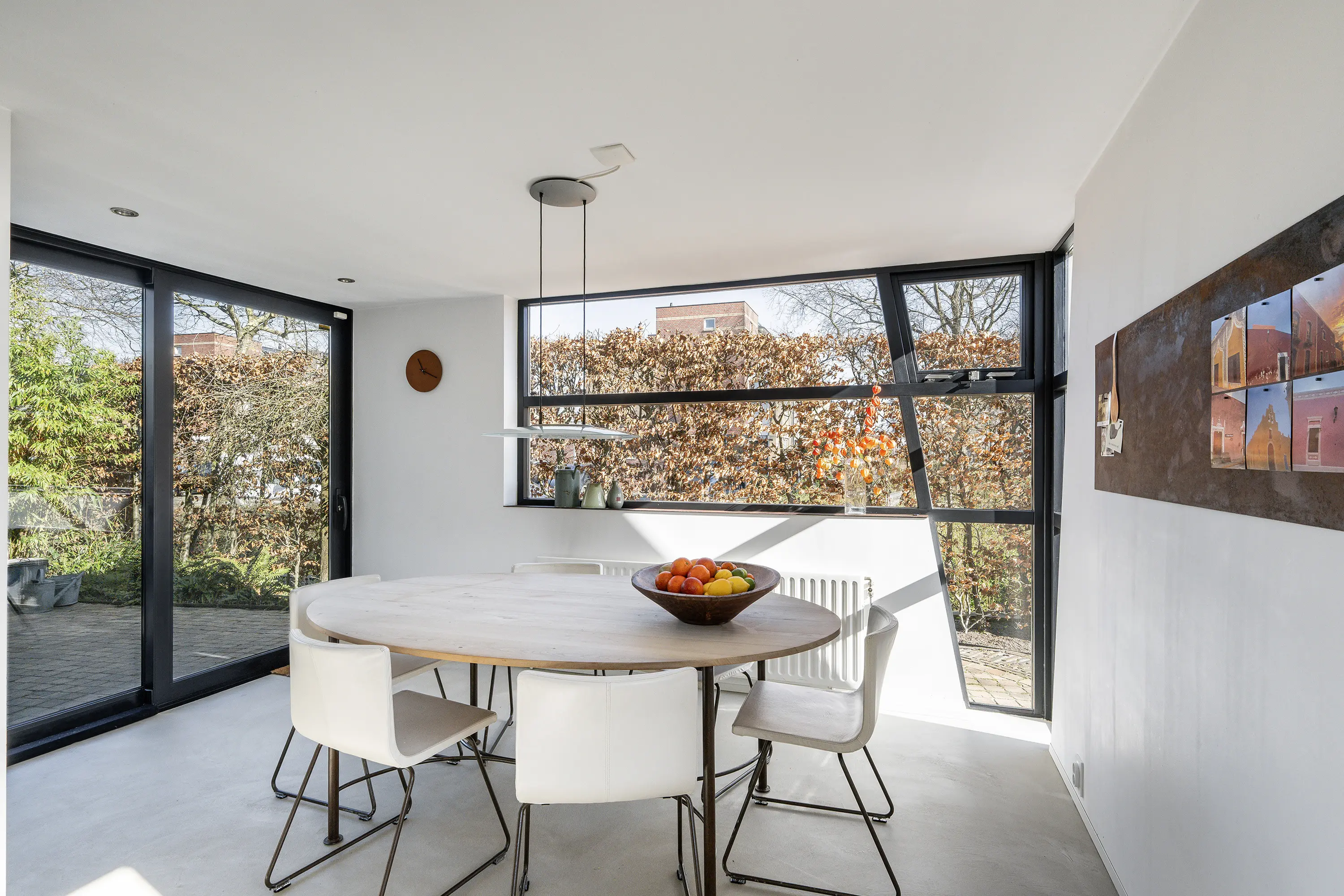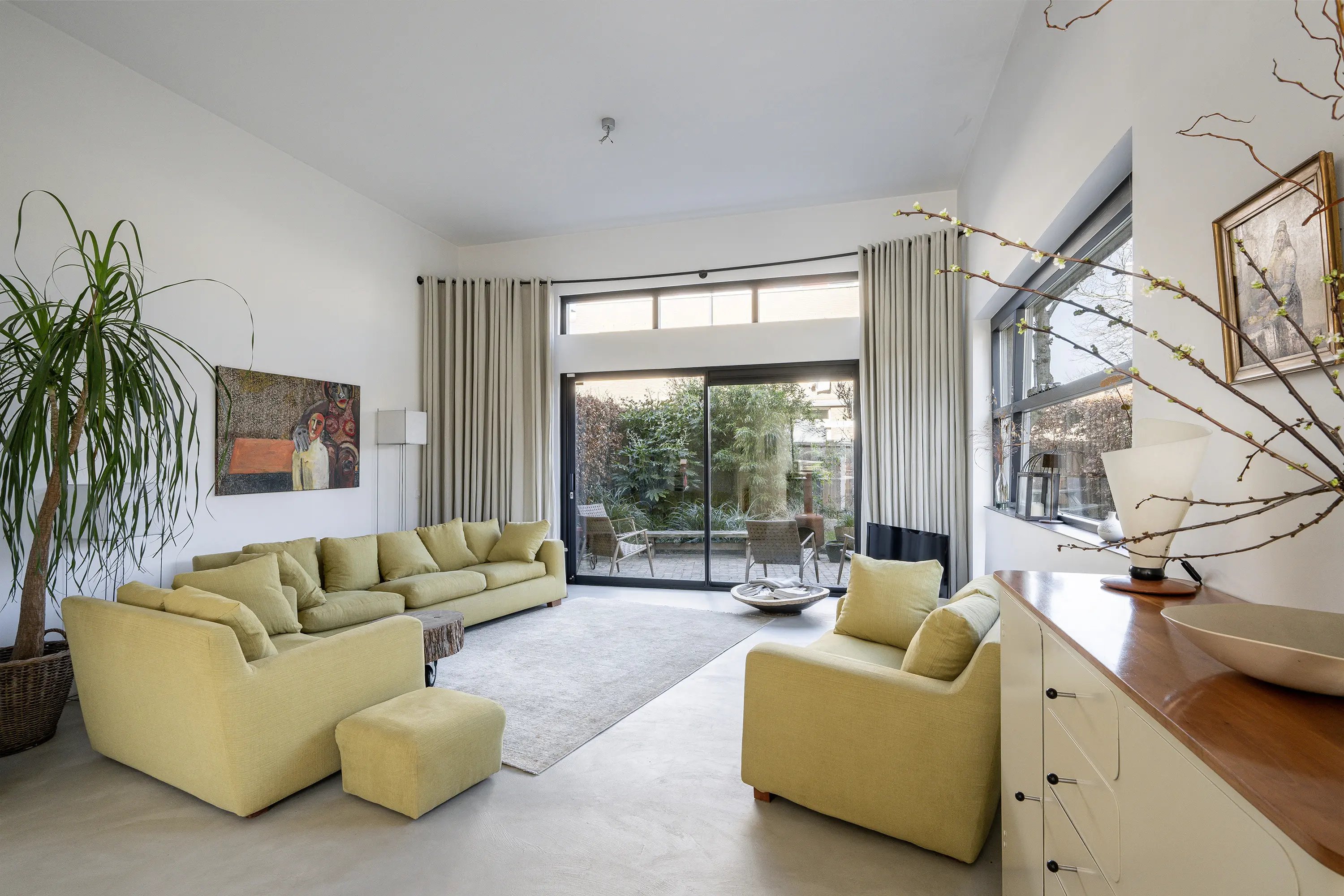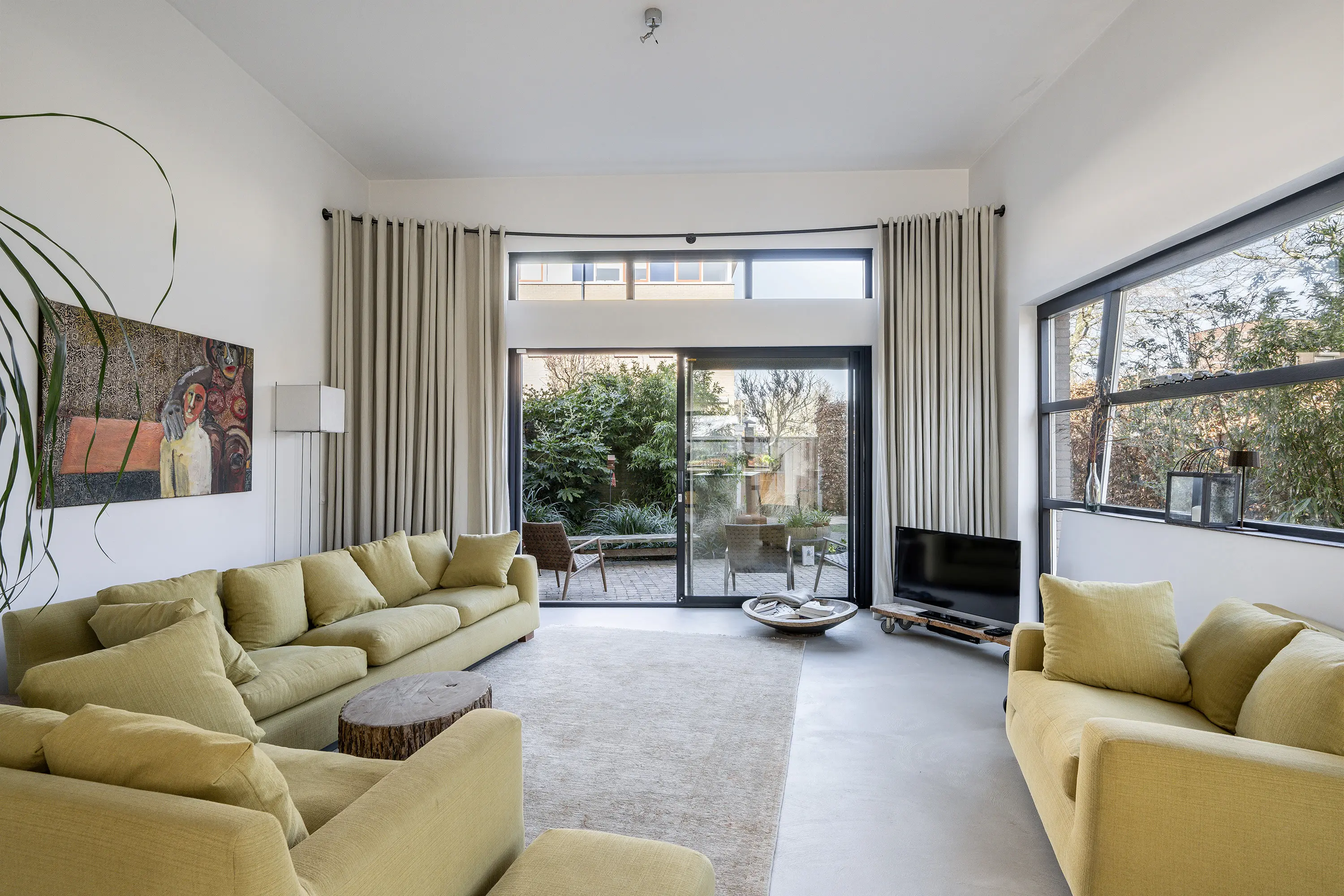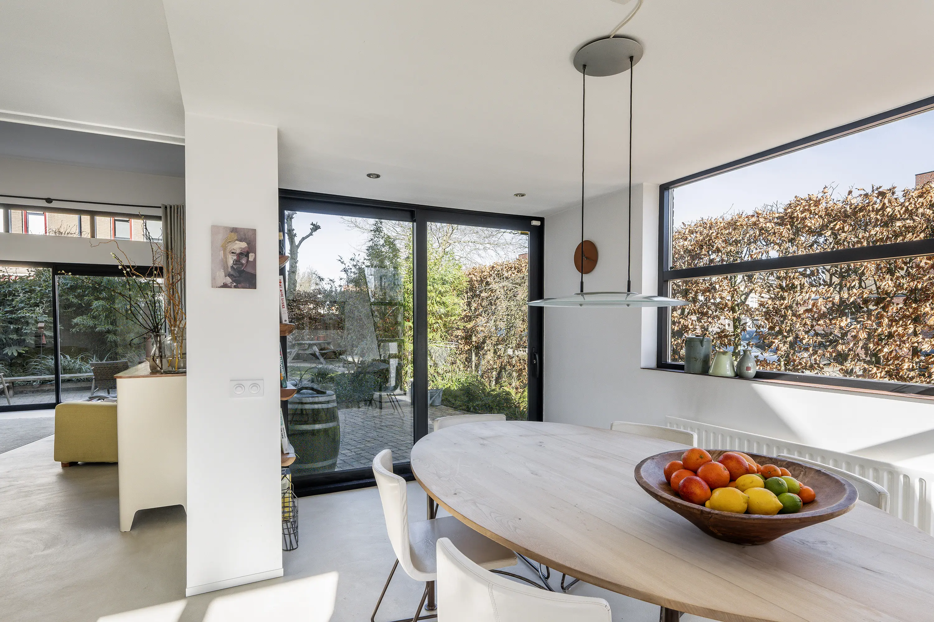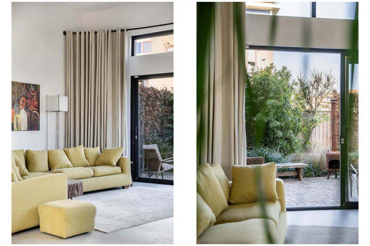 De begane grond heeft een open en speels karakter. Aan de achterzijde valt het extra hoge plafond direct op, wat niet alleen voor een indrukwekkend ruimtelijk effect zorgt, maar ook voor een onderscheidende indeling en een unieke sfeer in de woonkamer. De grote schuifpui naar de tuin zorgt bovendien voor een mooie verbinding tussen binnen en buiten. De begane grond is in 2019 volledig gerenoveerd en voorzien van een stijlvolle beton ciré vloer met comfortabele vloerverwarming. Het lichte stucwerk op de wanden en het plafond zorgen voor een rustige, moderne basis die perfect past bij de luxe uitstraling van de woning. In de ruime zij-uitbouw is veel glas is toegepast, hierdoor profiteert de woning van een prachtige lichtinval en een aangenaam ruimtelijk gevoel.
