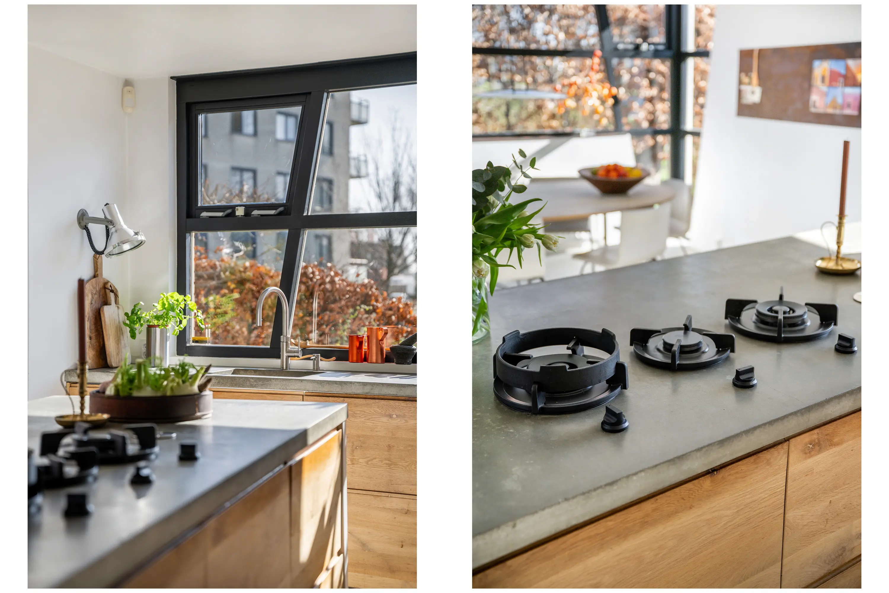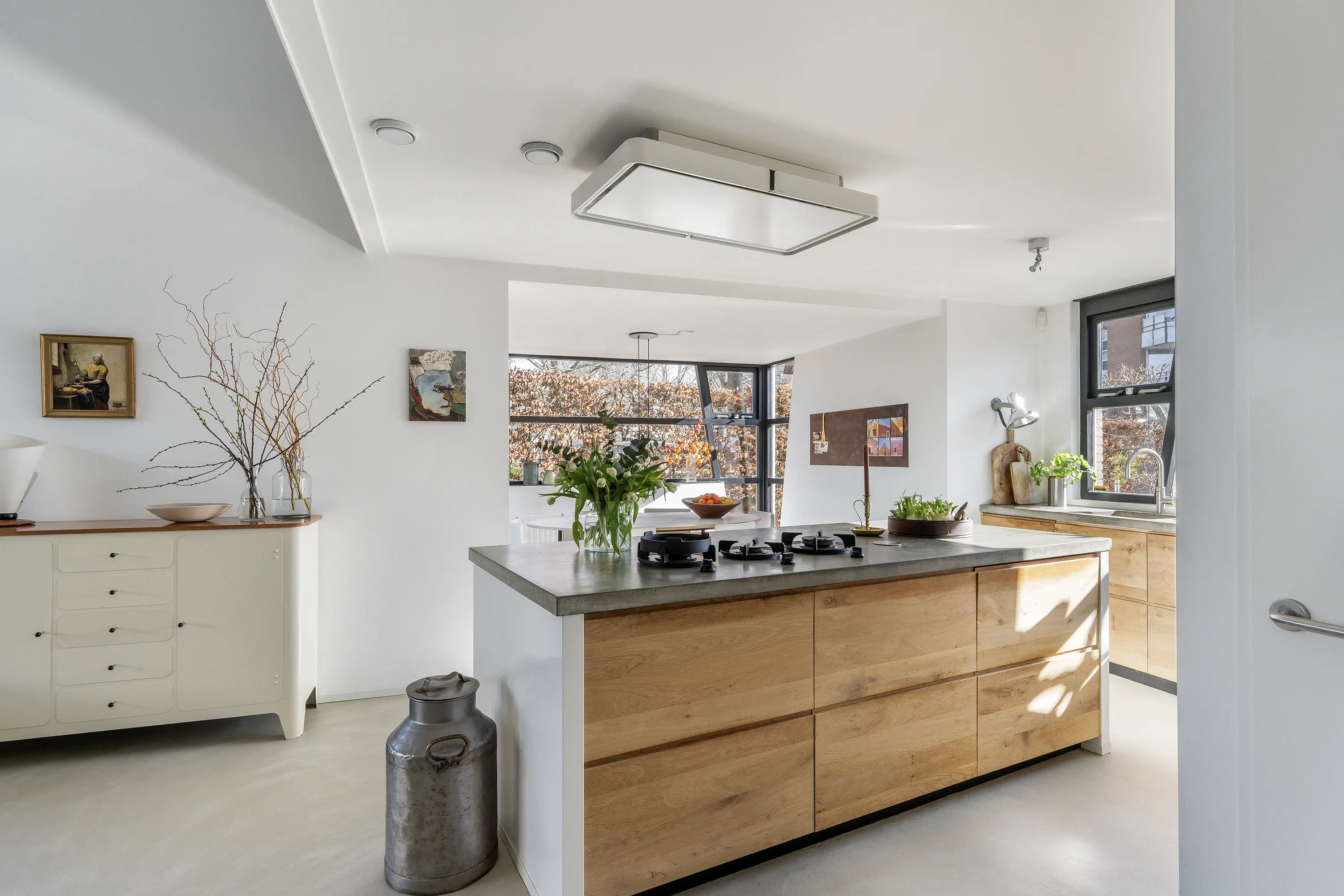 De keuken vormt een echte blikvanger in de woning. In 2019 is deze handgemaakte keuken gerealiseerd, waarbij gekozen is voor hoogwaardige materialen en een tijdloos ontwerp. Centraal staat het royale kookeiland, een droom voor iedere kookliefhebber. Het eiland is voorzien van een robuust betonnen werkblad met geïntegreerde gaskookpitten, wat zorgt voor een stoere en luxe uitstraling. De keuken is uitgevoerd met prachtige eikenhouten kasten, die warmte en karakter toevoegen aan het geheel. Qua apparatuur is de keuken zeer compleet en luxe uitgerust, met onder andere een Norcool ladekoelkast, stoomoven, Quooker, vaatwasser en een geïntegreerde plafondafzuigkap. Daarnaast beschikt de keuken over diverse praktische kasten en lades, waardoor er volop bergruimte aanwezig is. Een prettig detail is het raam in de keuken, dat zorgt voor veel daglicht en een fraai, vrij uitzicht op het park aan de overzijde.