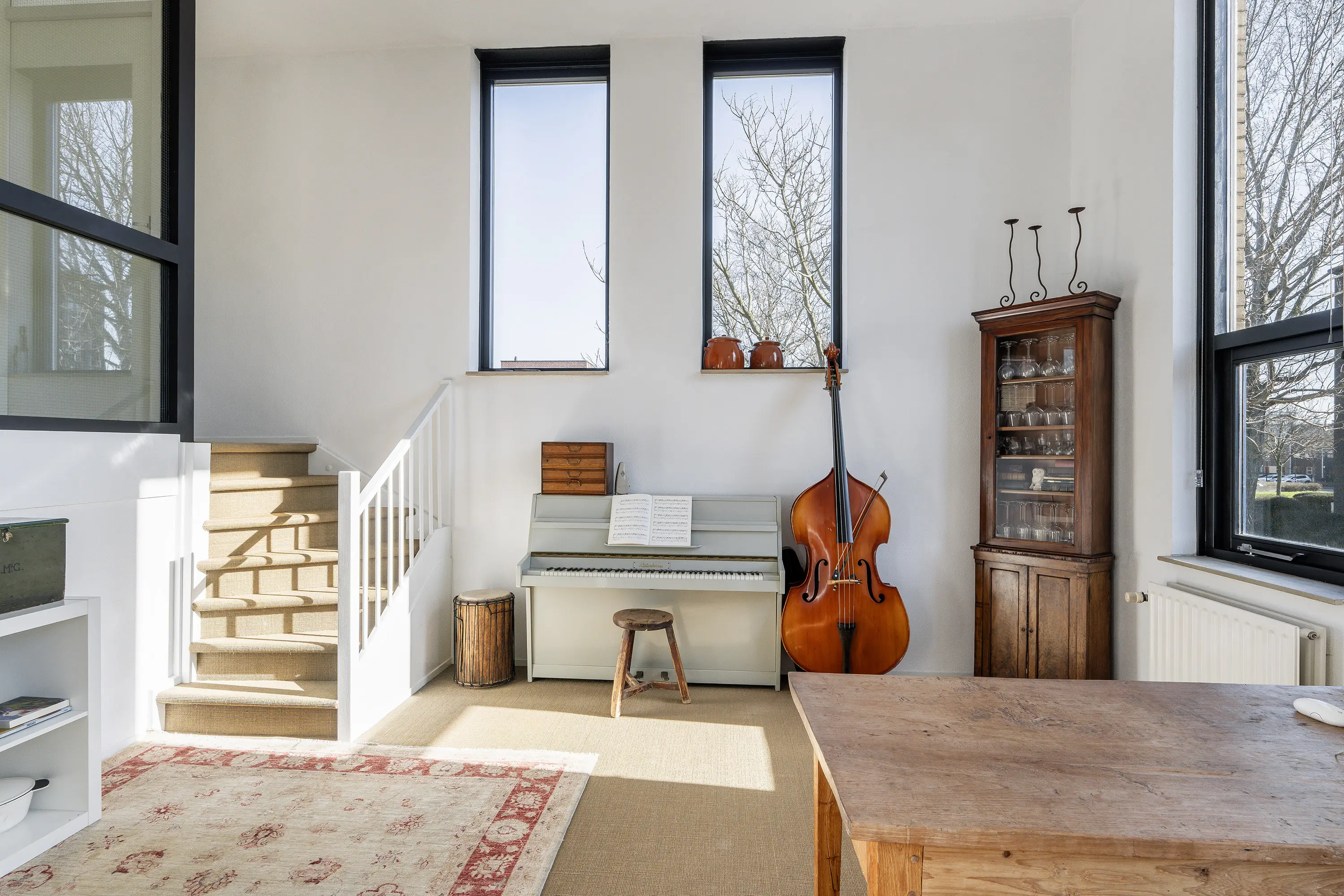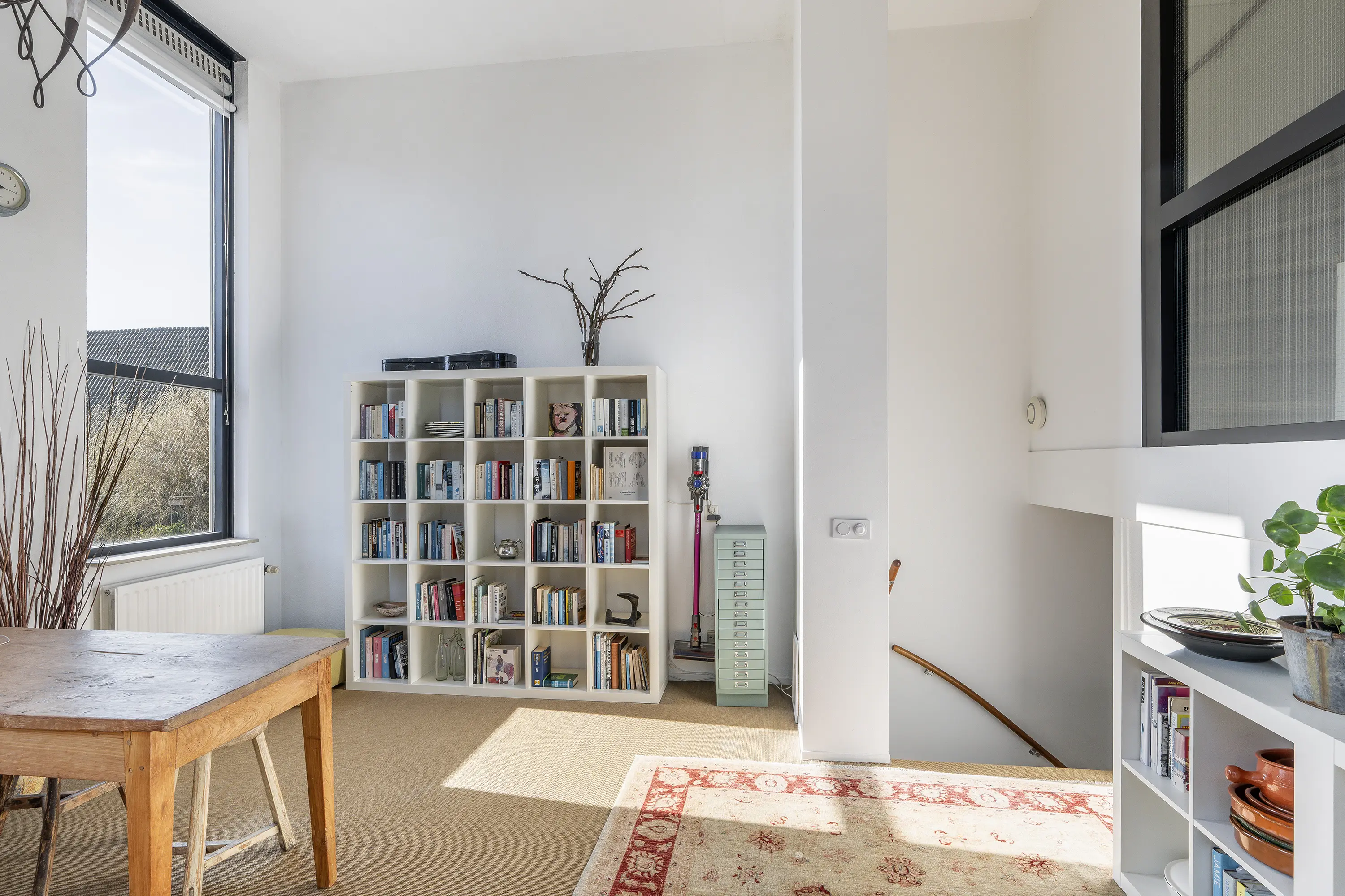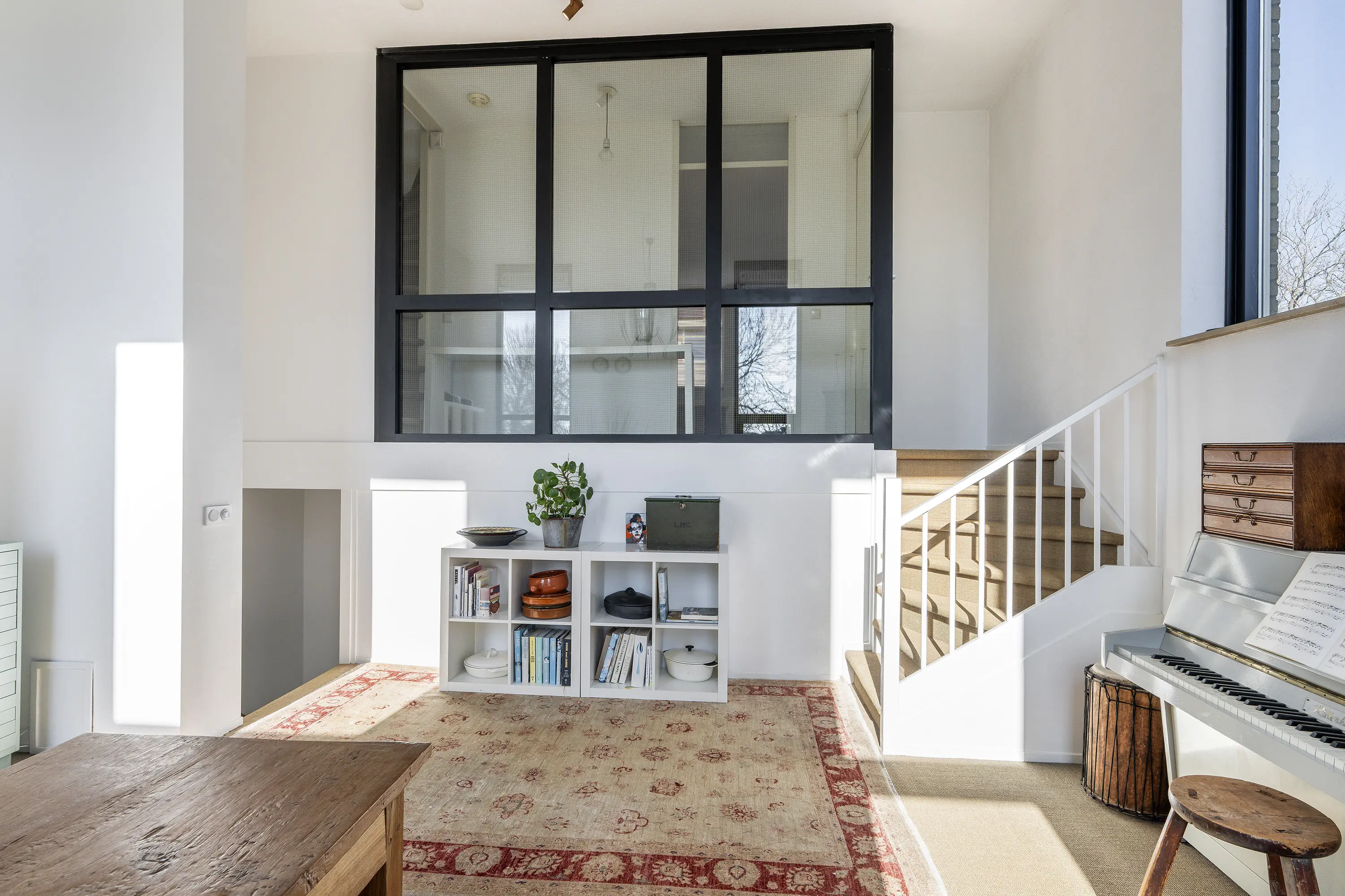 Via de trapopgang in de woonkamer bereikt u de eerste verdieping, die dankzij de speelse indeling en niveauverschillen een bijzonder ruimtelijk karakter heeft.