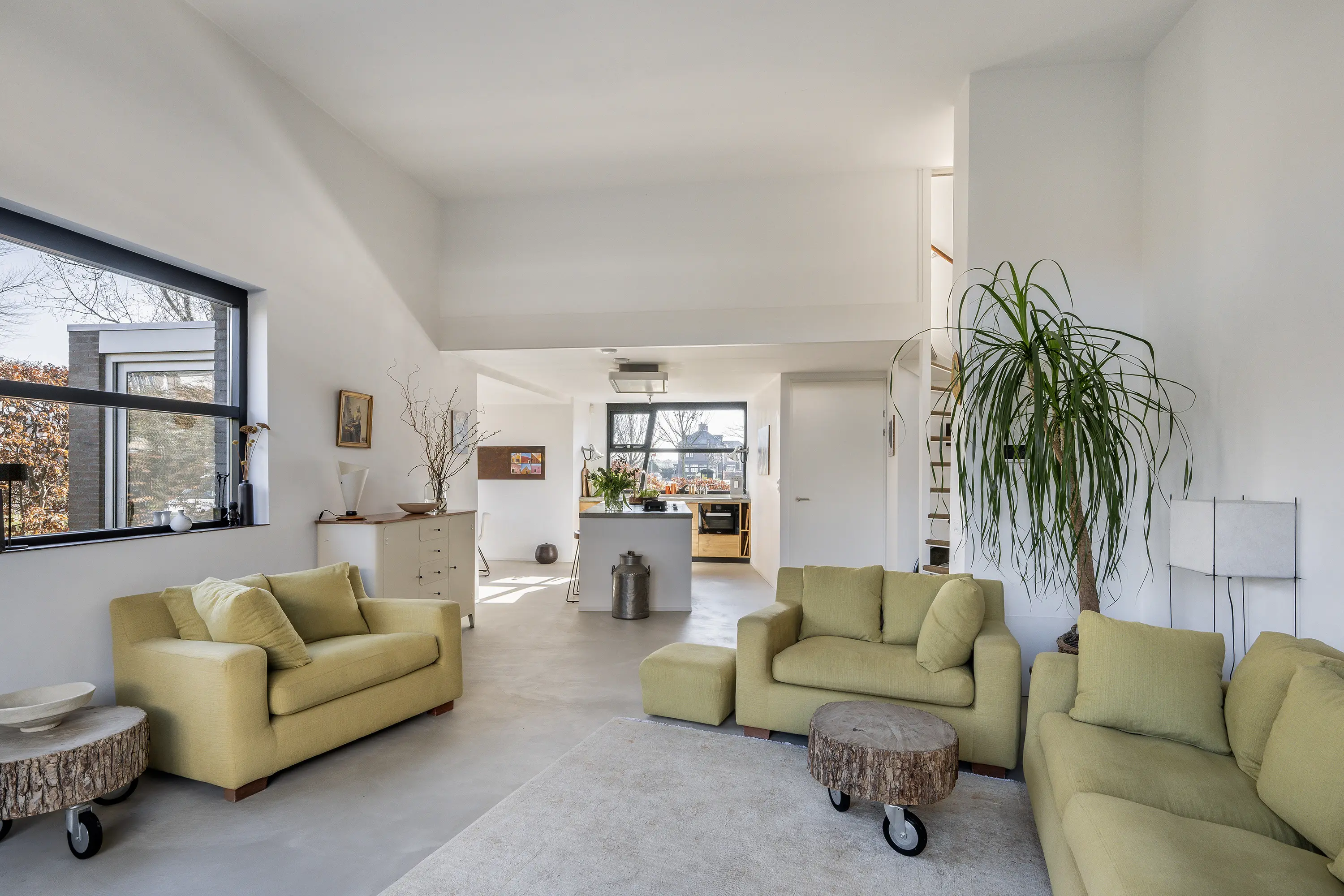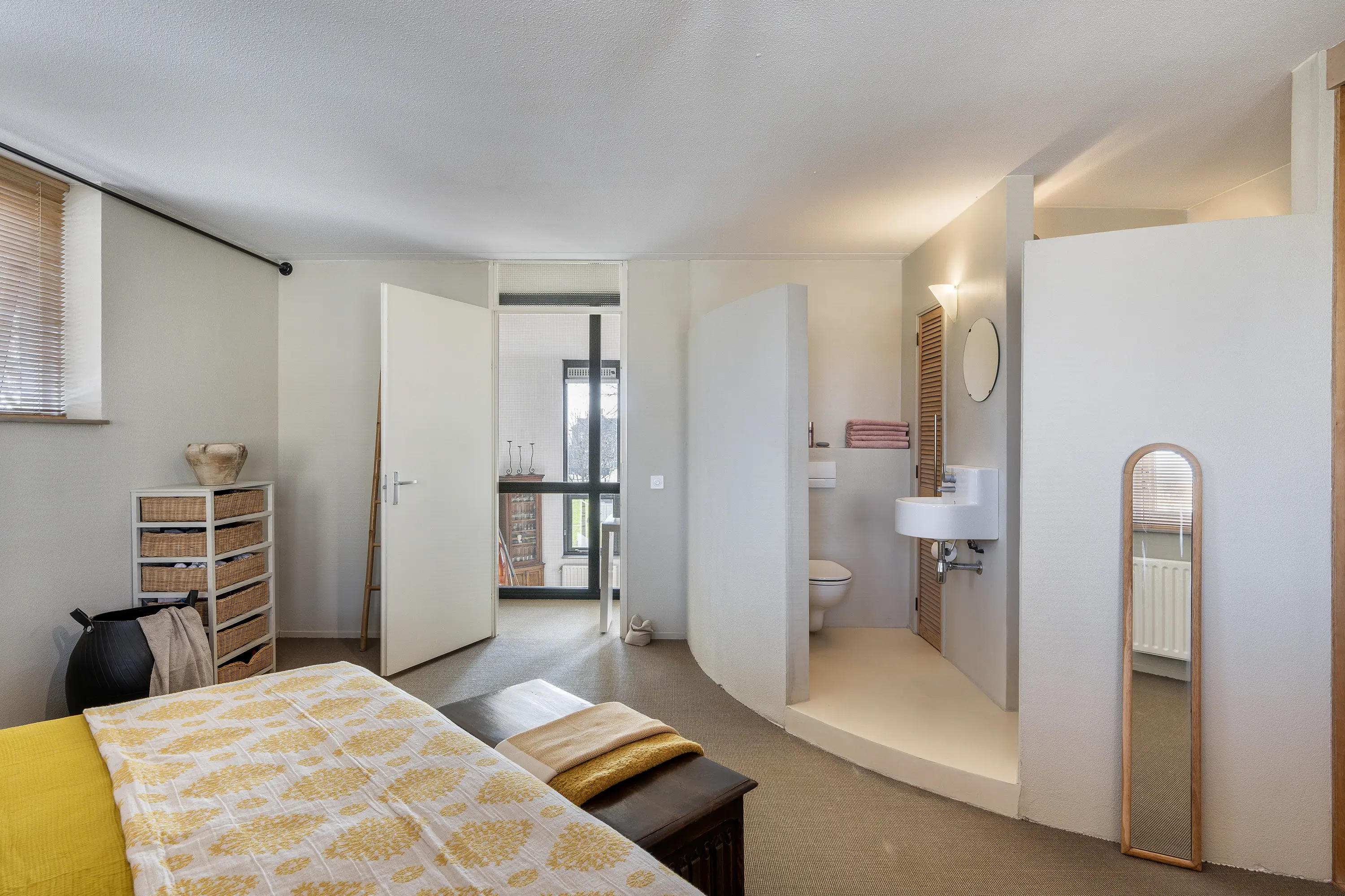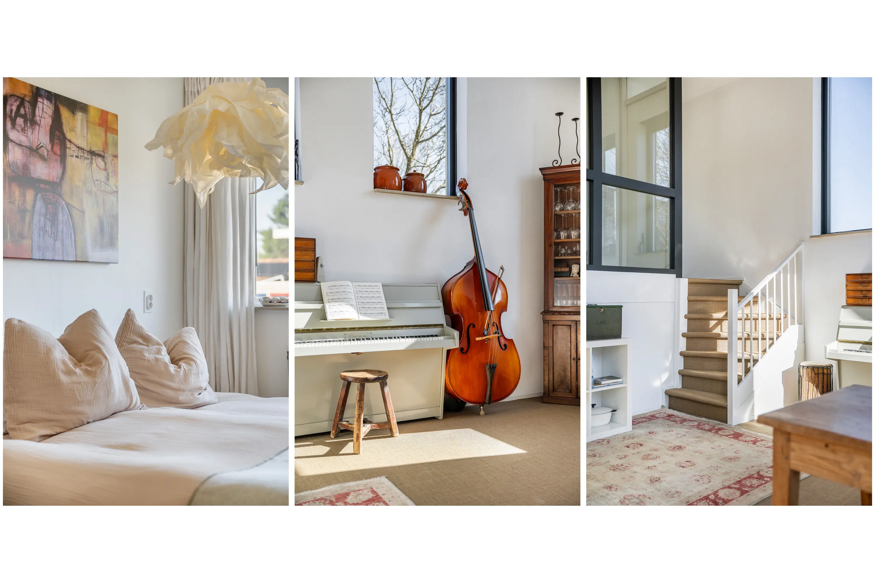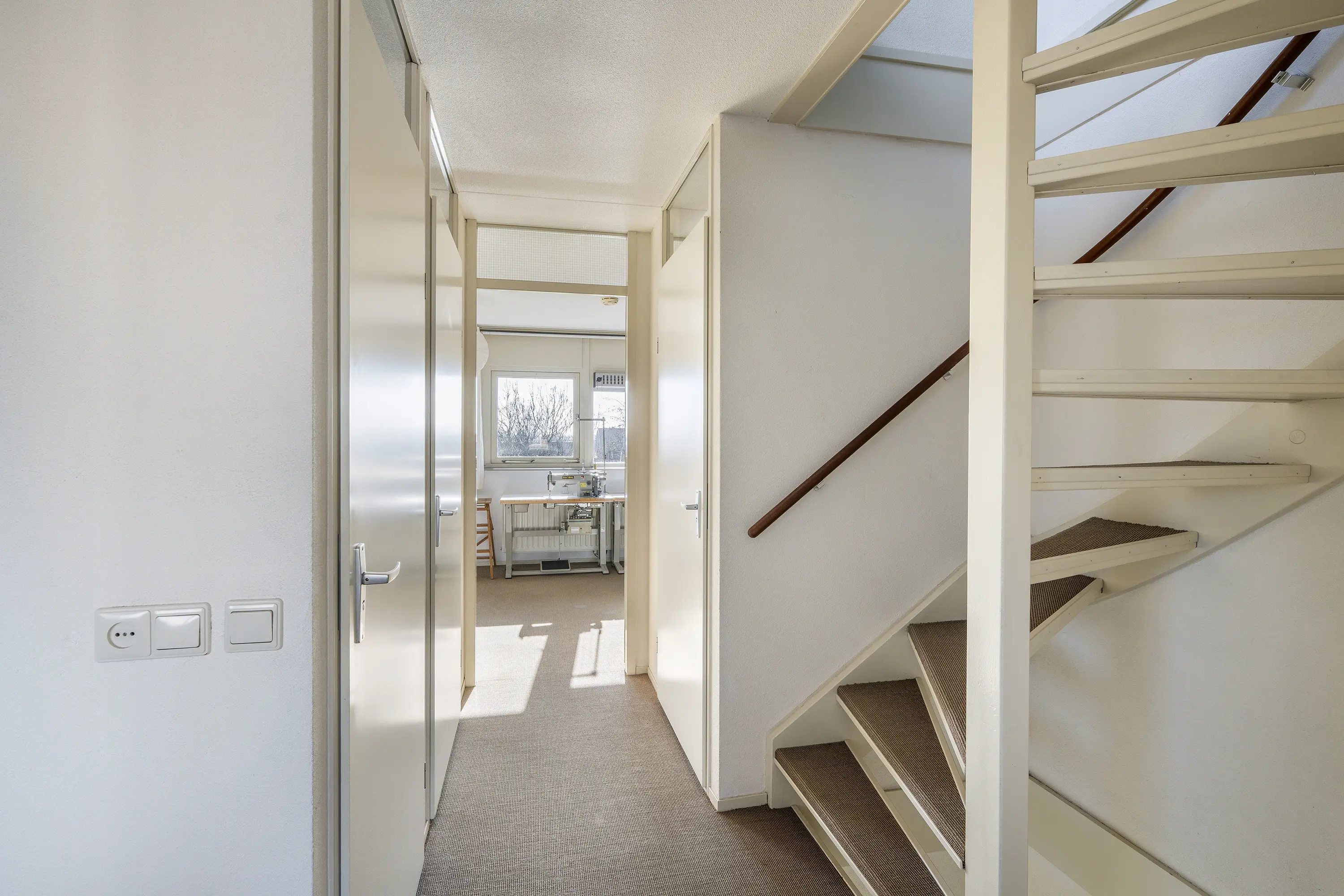 Via de trapopgang in de woonkamer bereikt u de eerste verdieping, die dankzij de speelse indeling en niveauverschillen een bijzonder ruimtelijk karakter heeft.