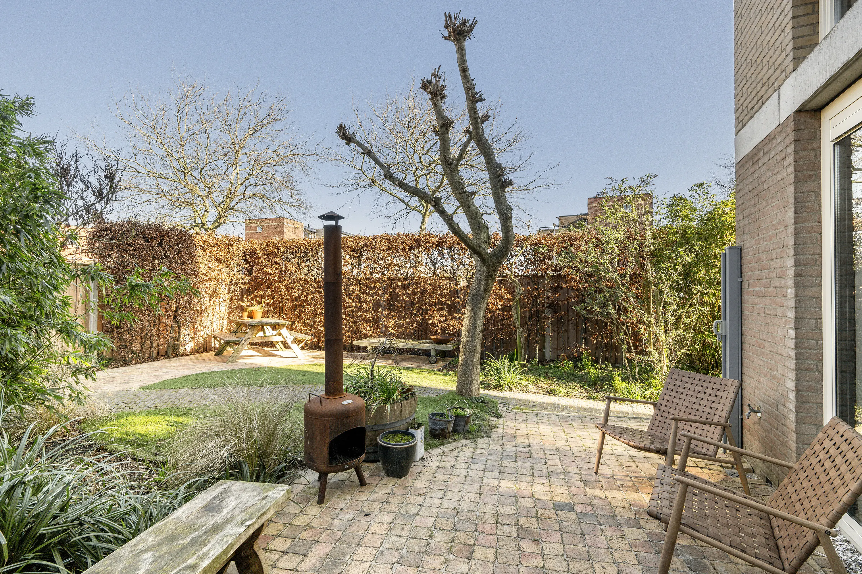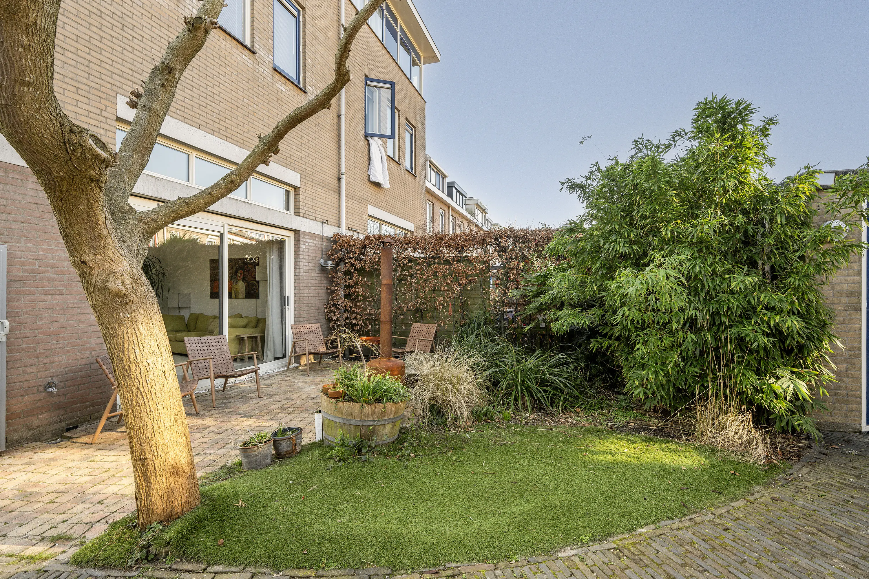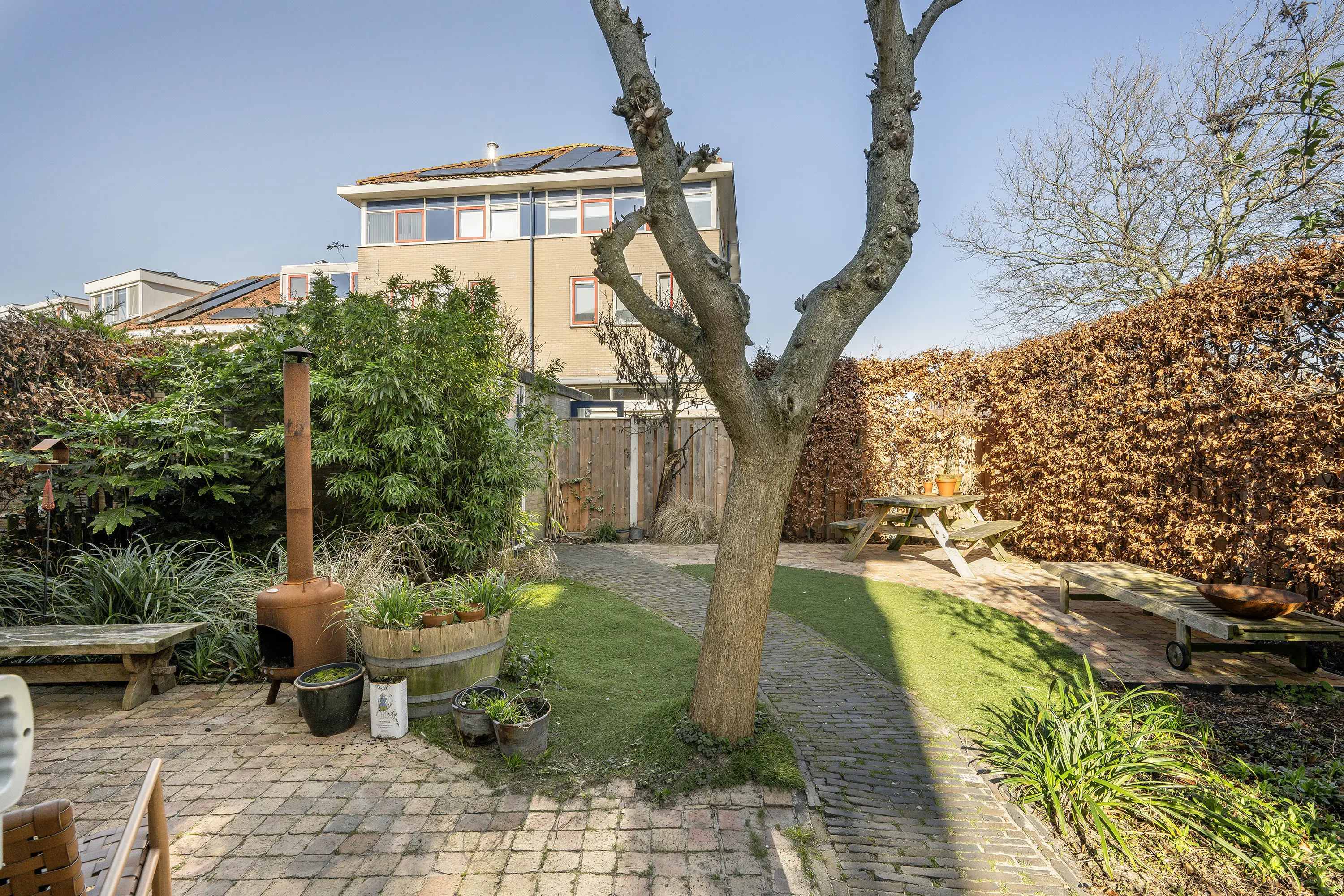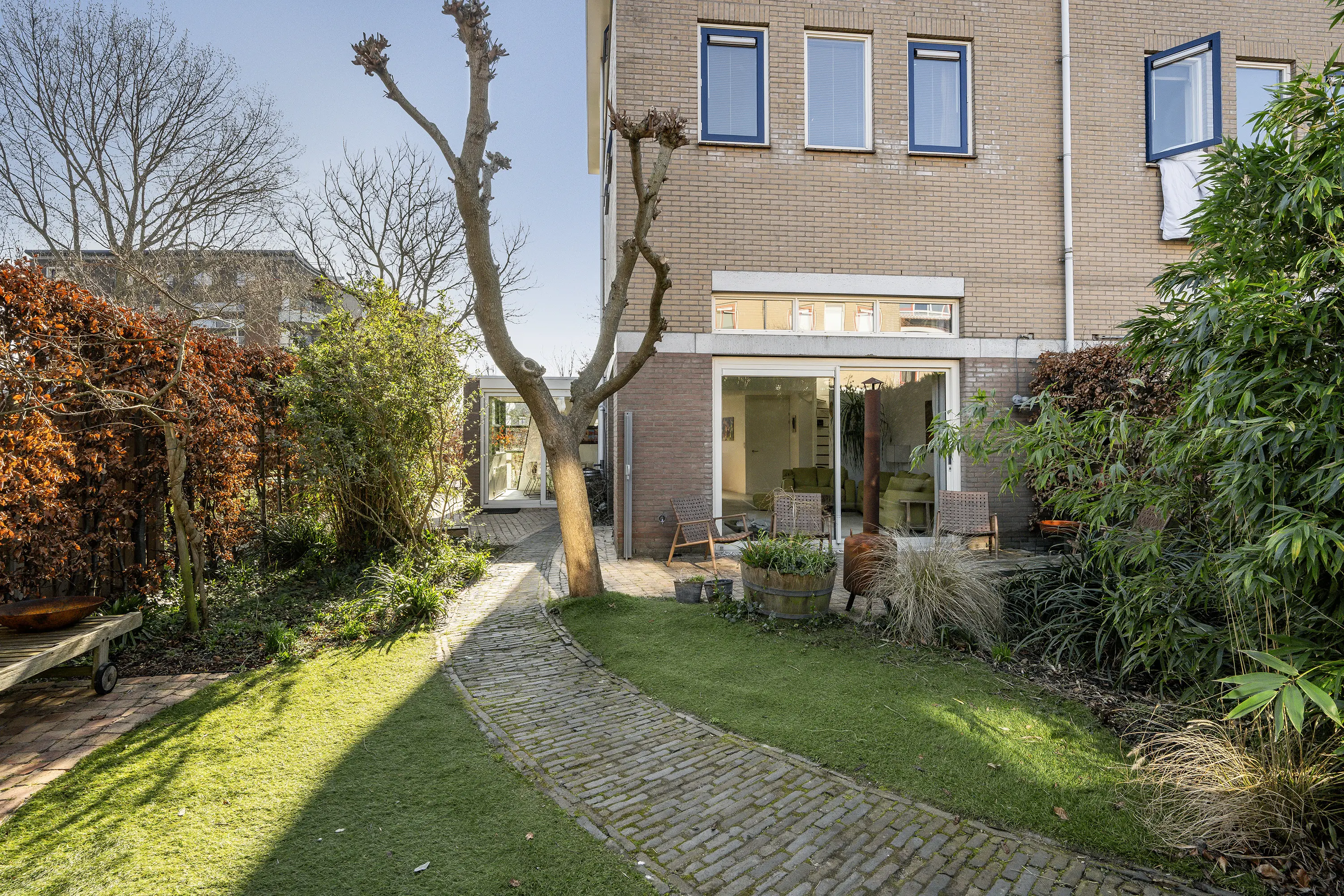 De achtertuin is gunstig gelegen op het noordwesten, waardoor u hier de hele dag heerlijk van de zon kunt genieten. Daarnaast beschikt de woning over een zijtuin op het noordoosten. De tuin is verzorgd en sfeervol ingericht met een afwisselende combinatie van bestrating, beplanting en kunstgras. Dankzij de verschillende indelingen is er ruimte voor meerdere zitjes, waardoor er altijd wel een fijne plek in de zon of schaduw te vinden is. Een aanwezige boom zorgt bovendien voor natuurlijke schaduw op warme dagen. Aan de zijzijde van de tuin is in 2023 een nieuwe damwand geplaatst op tuinniveau. Achterin de tuin bevindt zich een praktische stenen berging voorzien van een sedumdak, ideaal voor fietsen en tuingereedschap.