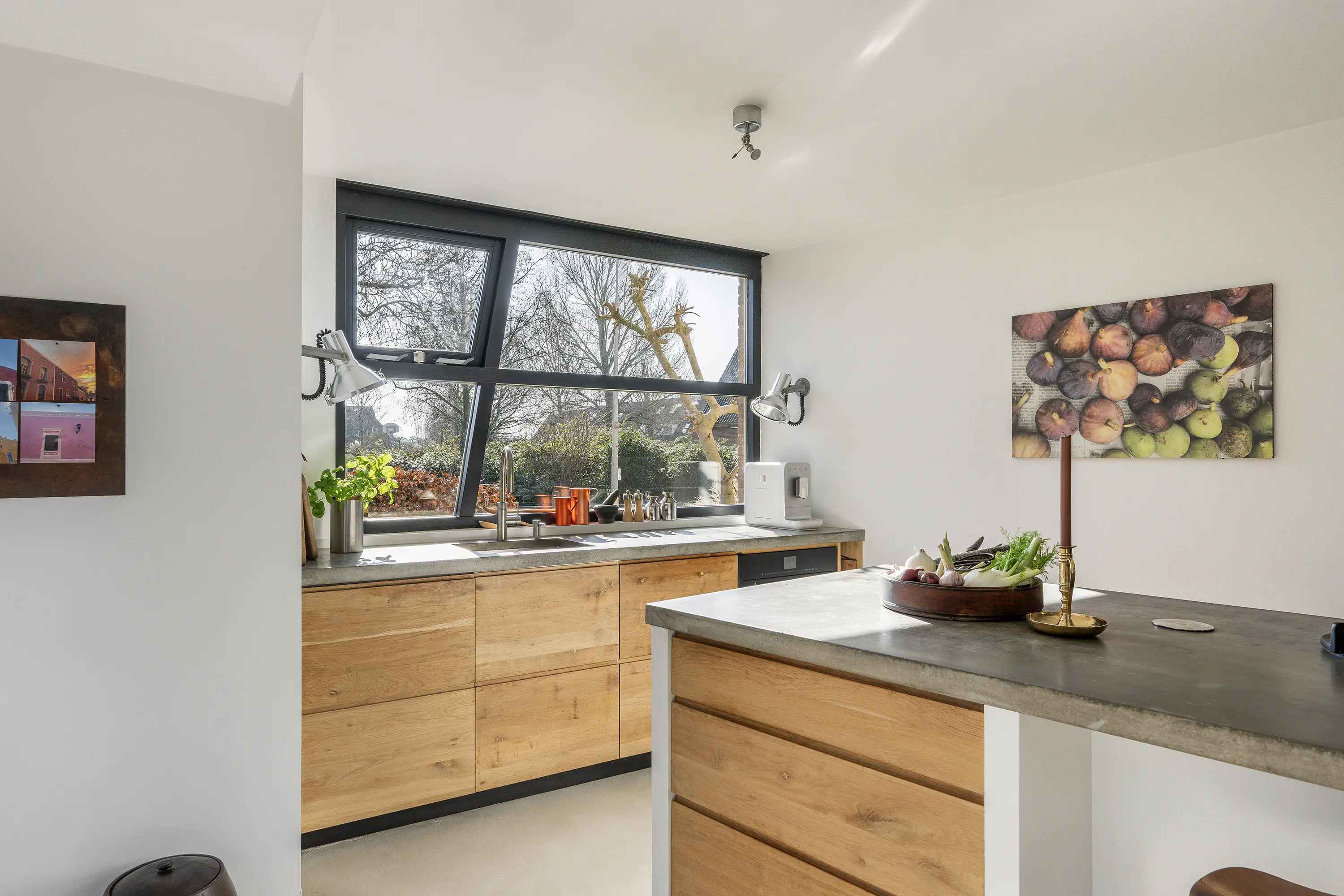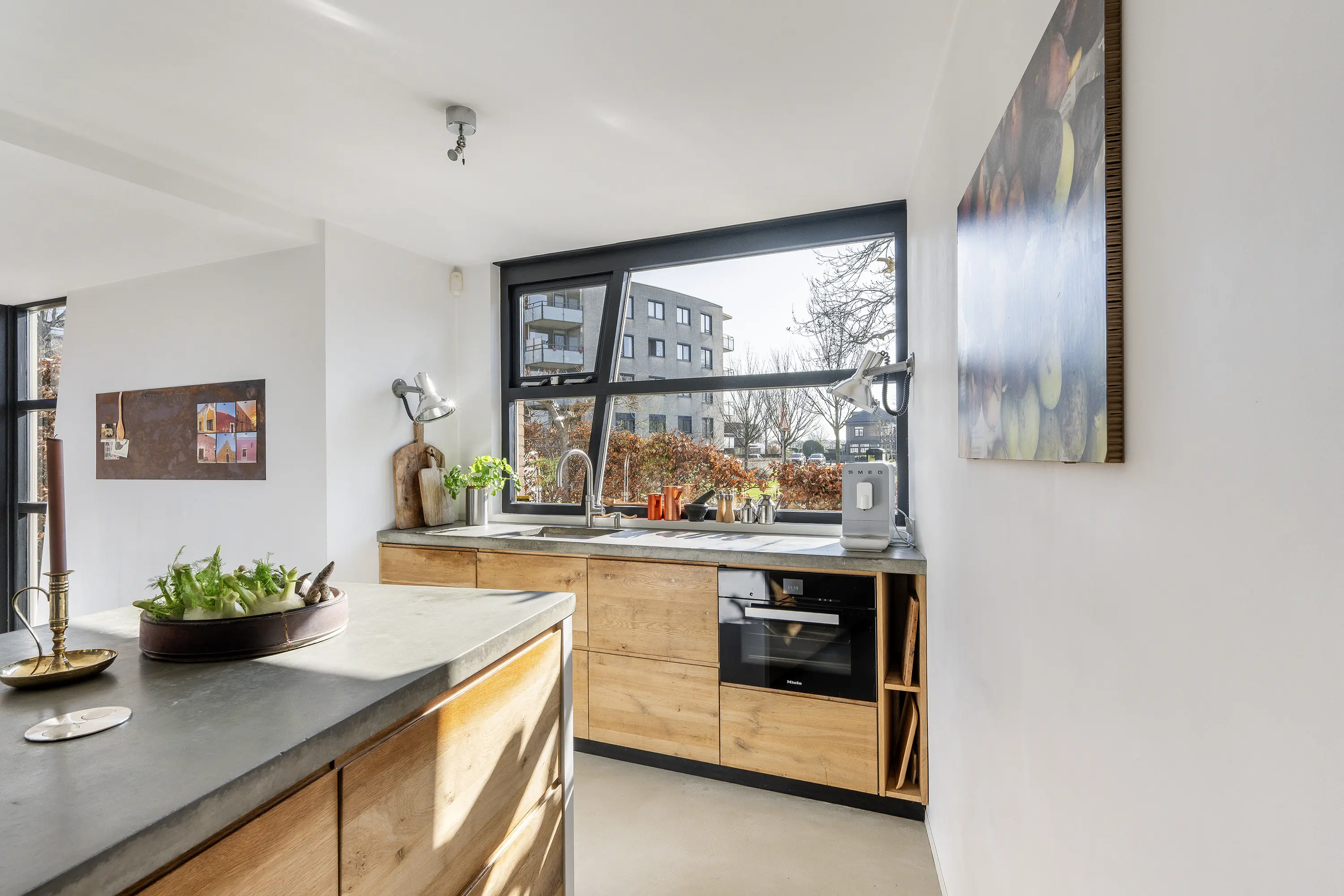 - Luxe woonkeuken met betonnen werkblad, eikenhouten kasten en voorzien van alle moderne apparatuur;