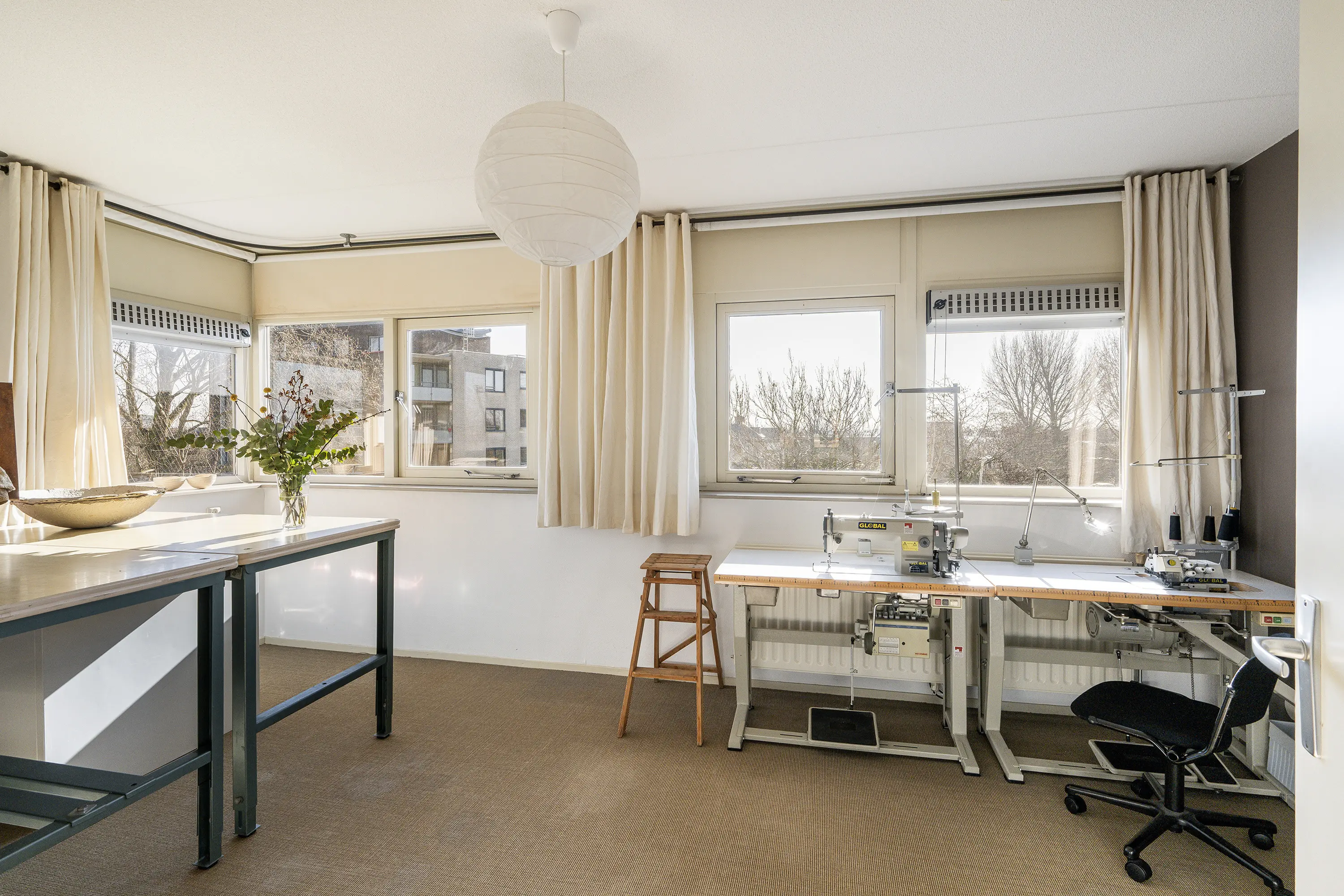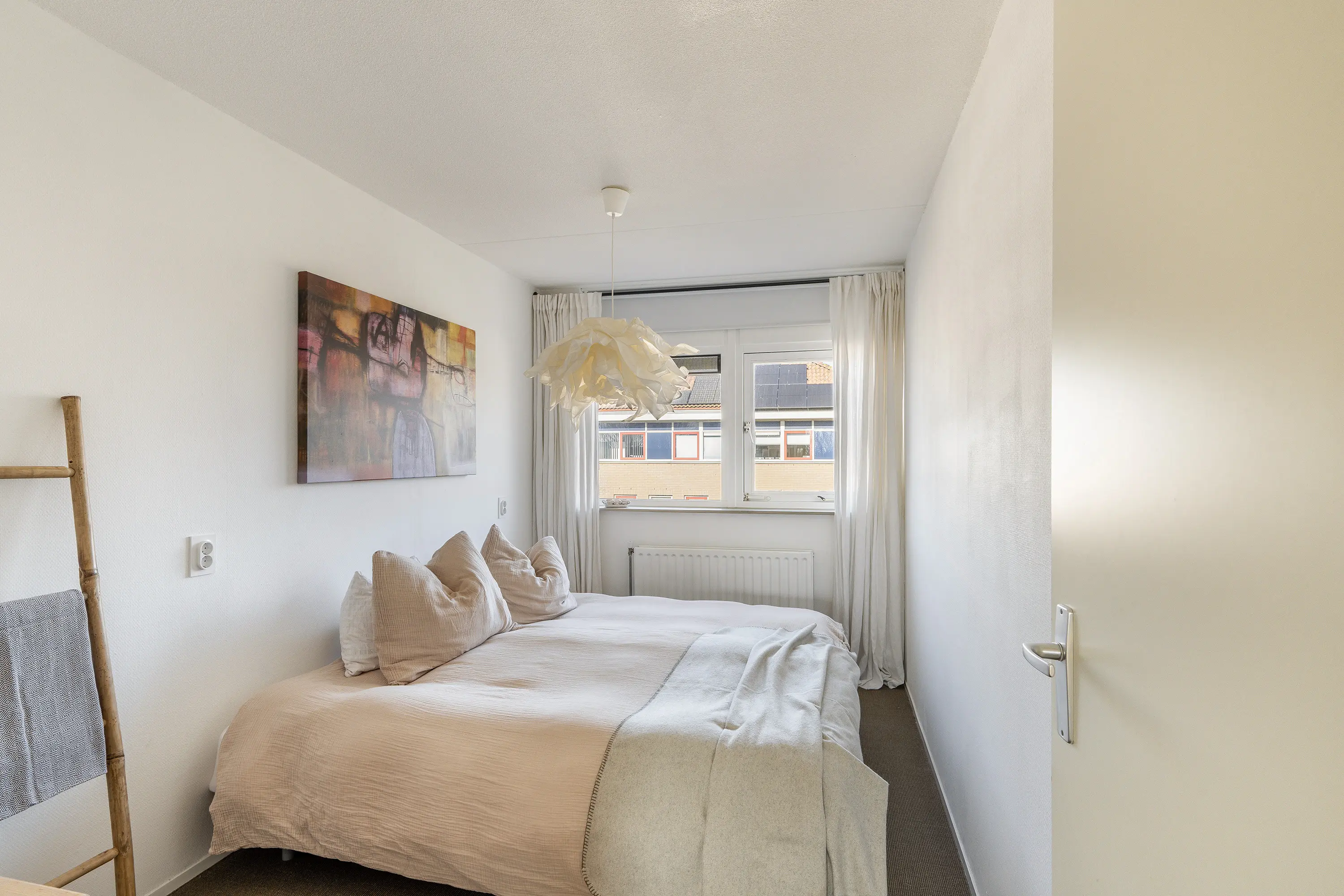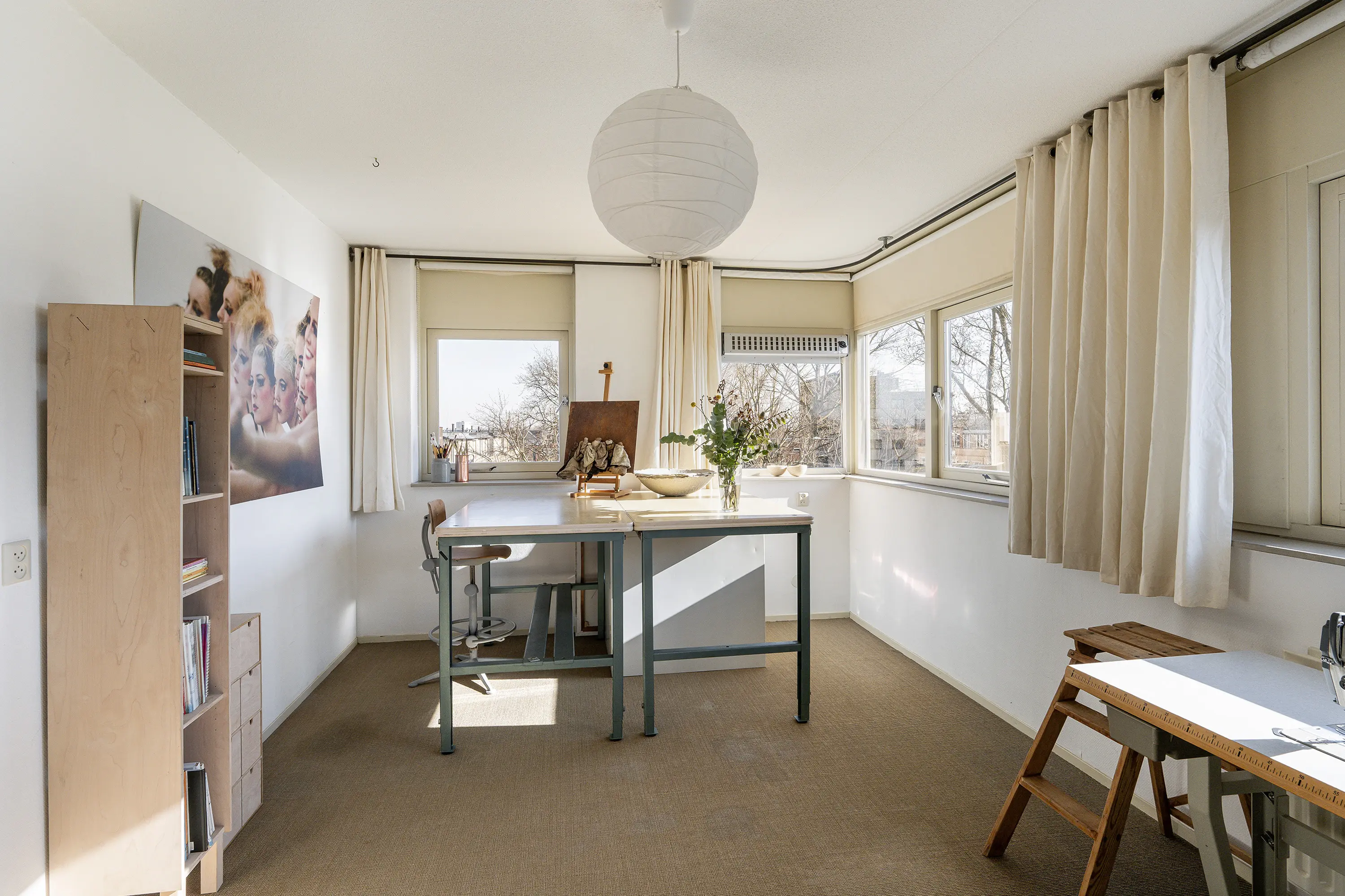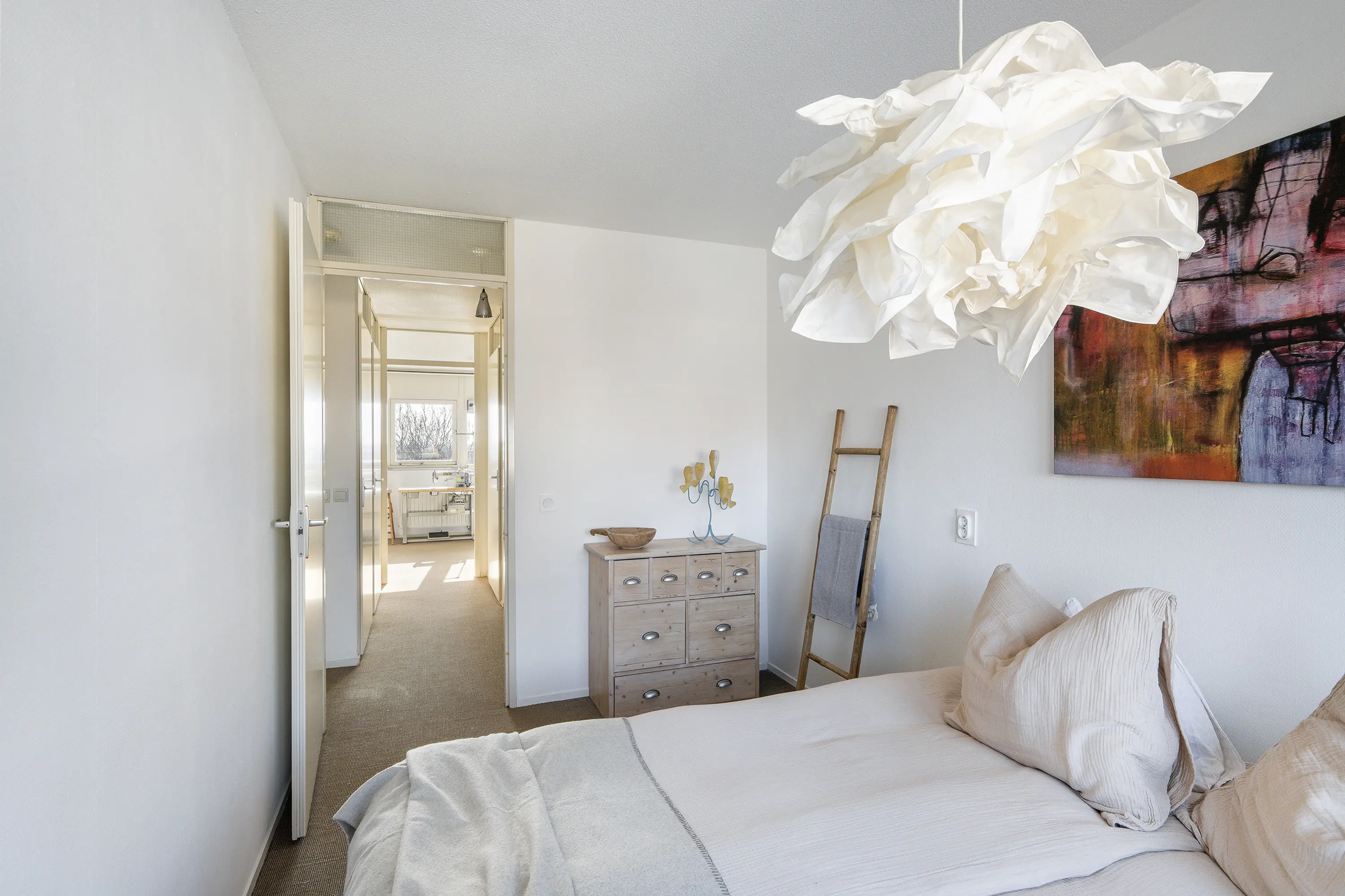Via een vaste trap is de tweede verdieping bereikbaar, die ruimte biedt aan drie slaapkamers en extra praktische voorzieningen. De grootste slaapkamer aan de voorzijde wordt momenteel gebruikt als atelier en biedt dankzij de royale afmetingen veel mogelijkheden voor diverse functies.