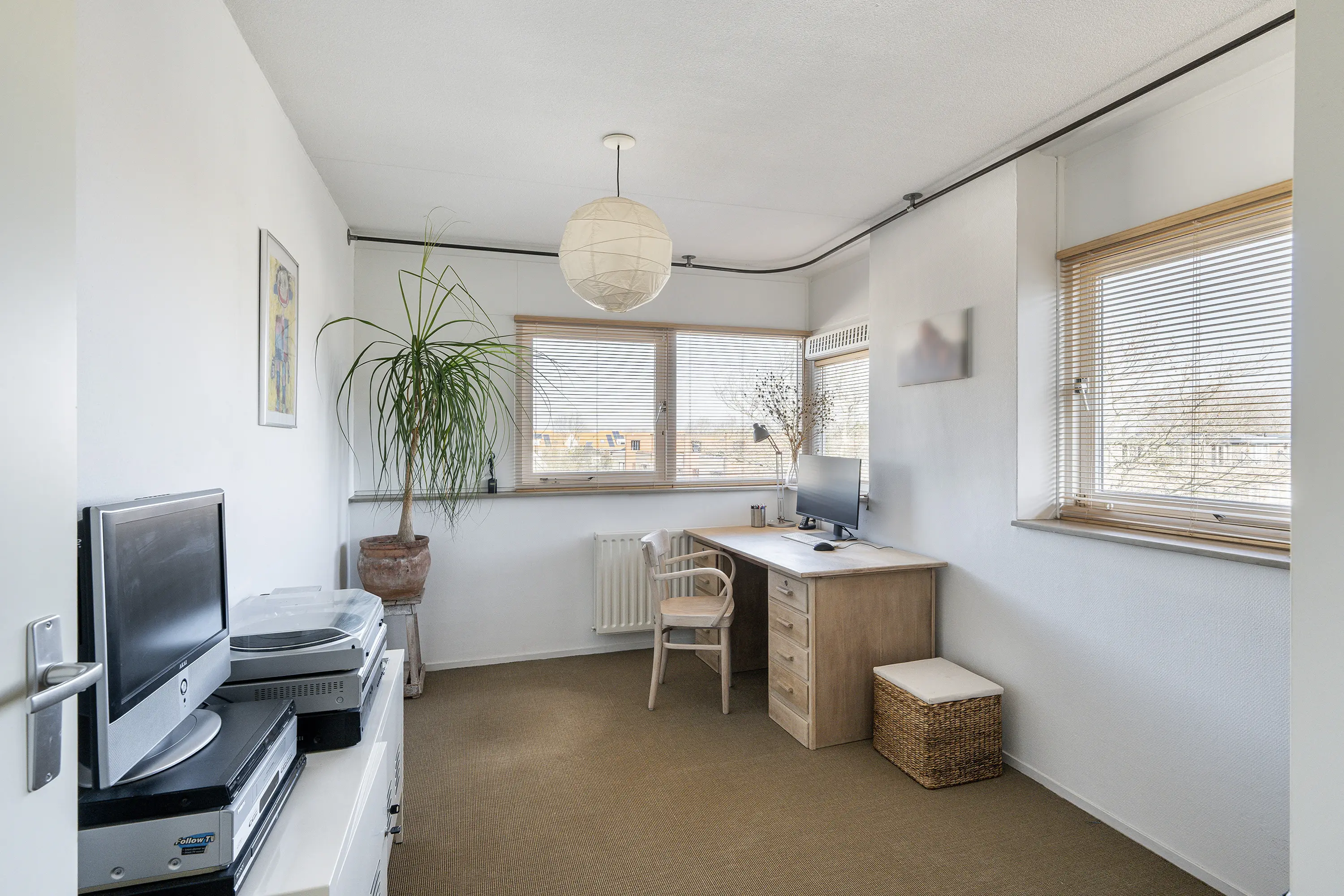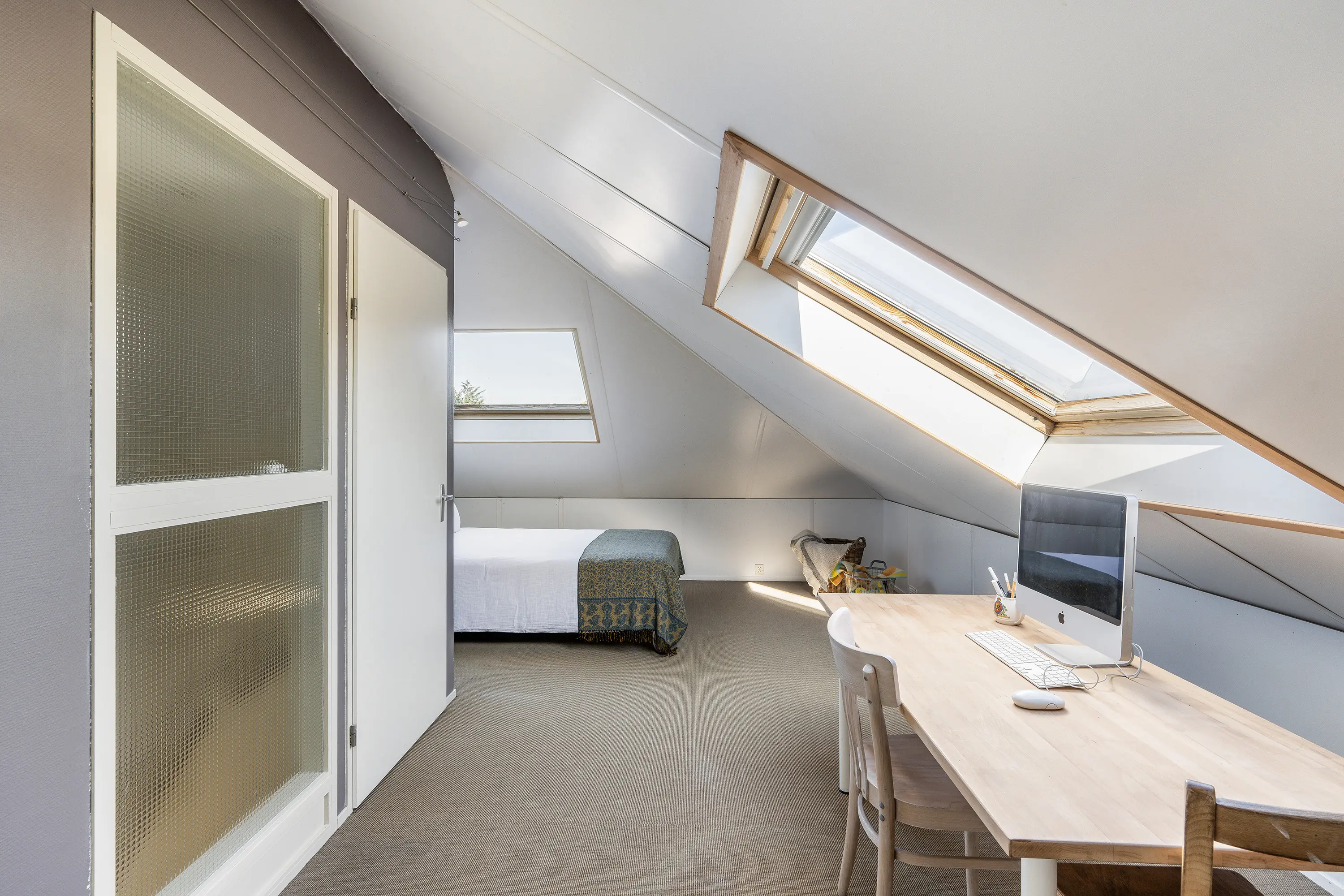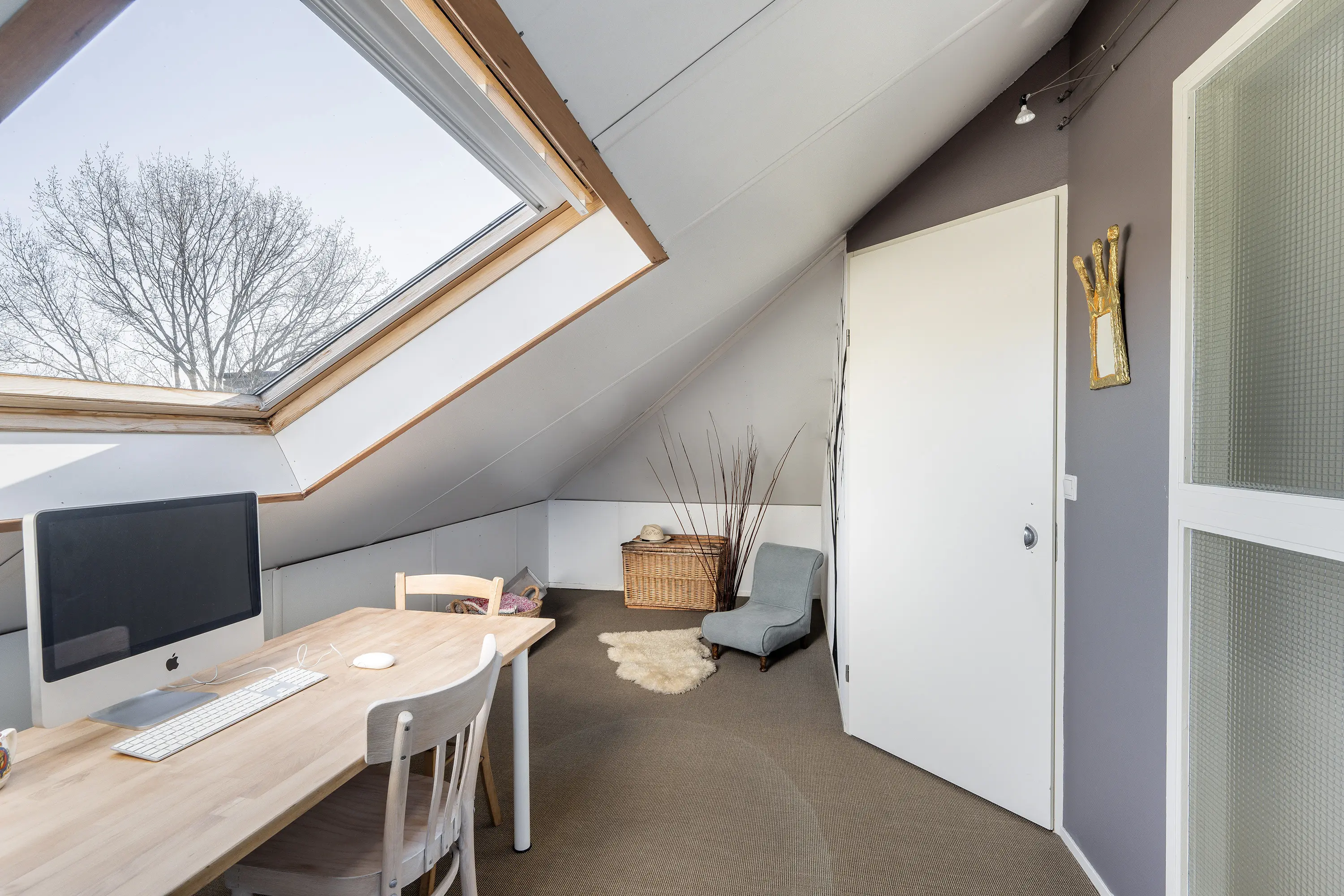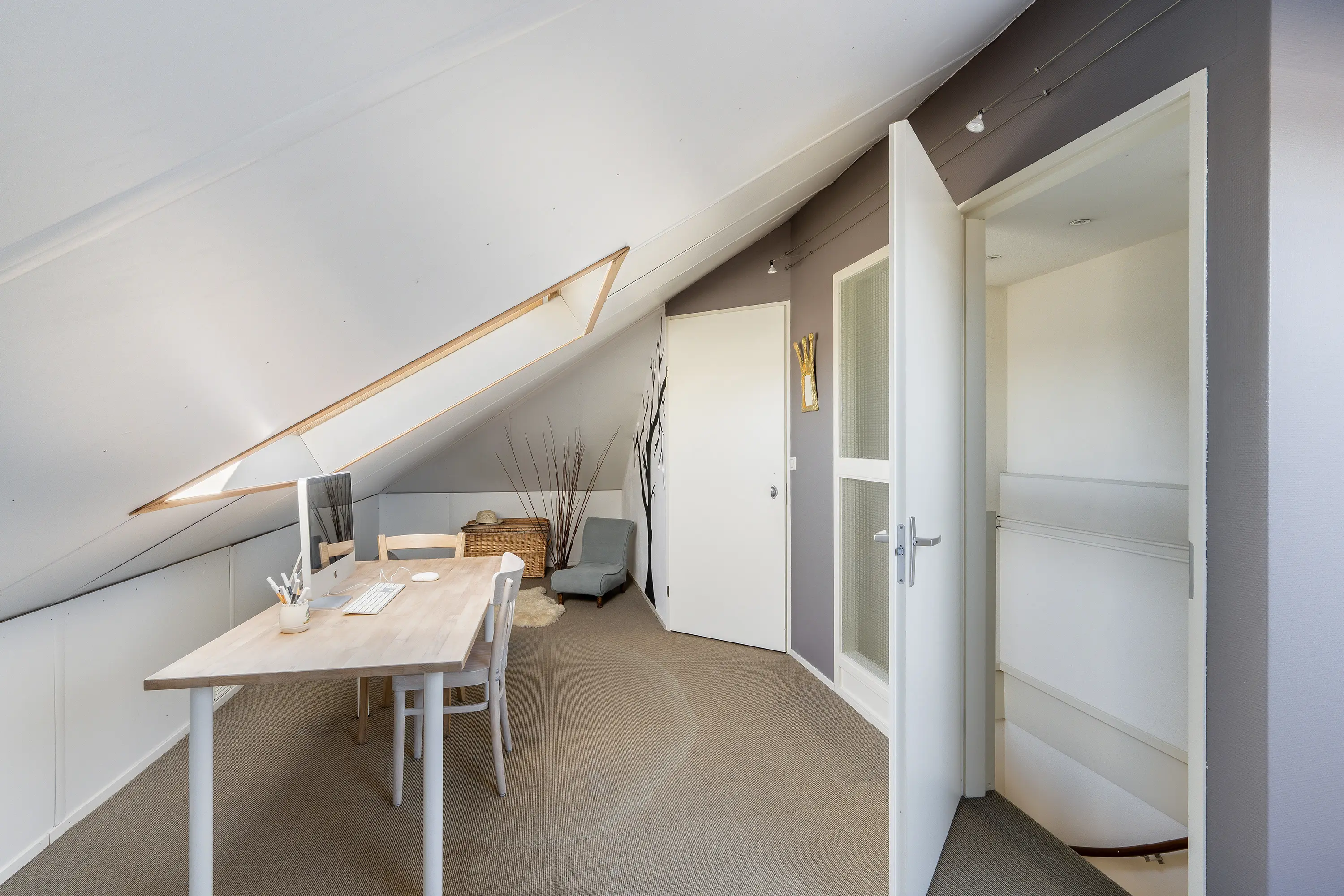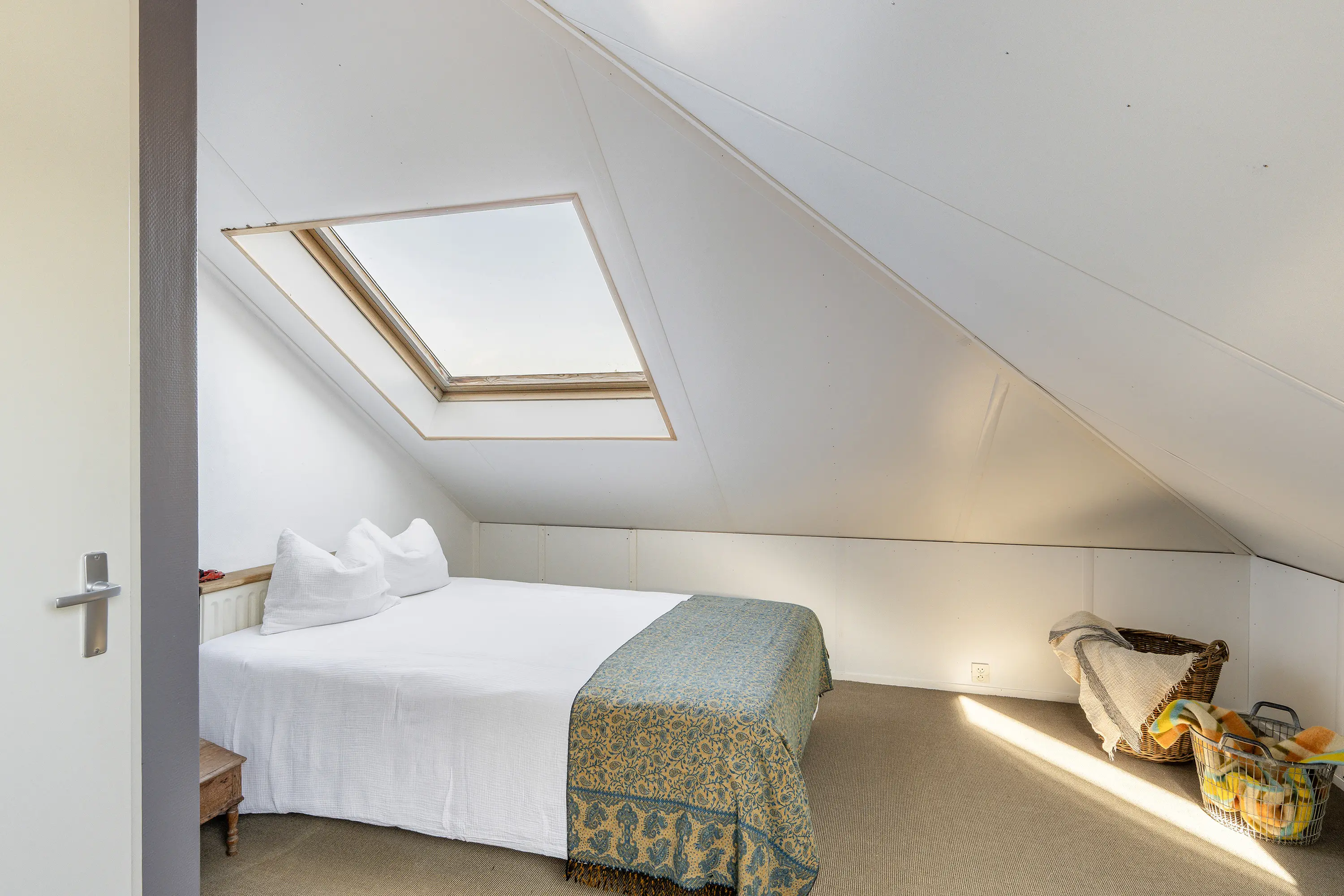 De derde verdieping biedt een extra slaapkamer of werkruimte. De kamer is voorzien van twee grote dakramen, waardoor er veel daglicht binnenvalt en de ruimte een aangename, lichte sfeer heeft.