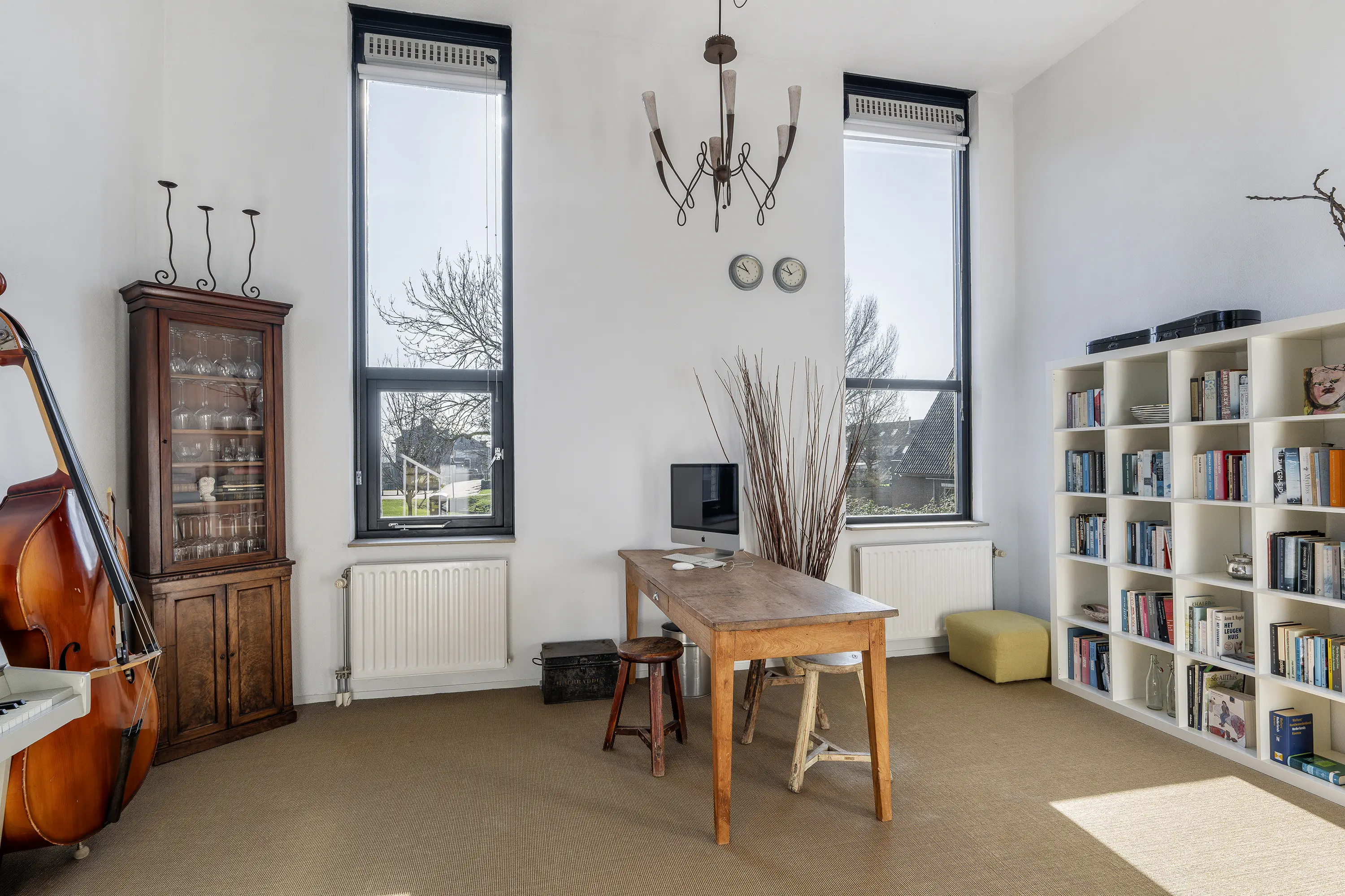 Op de halve verdieping, aan de voorzijde van de woning, bevindt zich een royale tweede kamer met een hoog plafond en een glazen wand. Deze kamer is multifunctioneel en uitstekend geschikt als tweede woonkamer, werkruimte of te realiseren als extra slaapkamer.